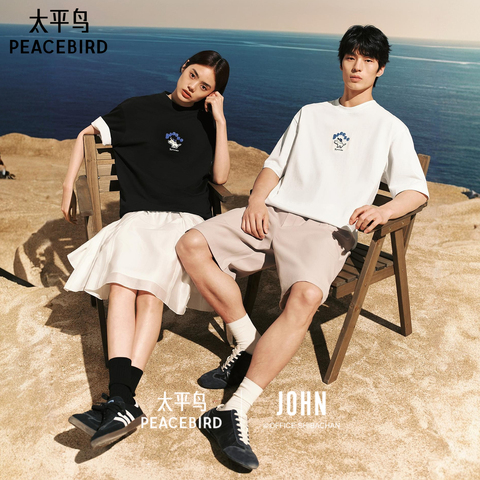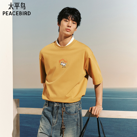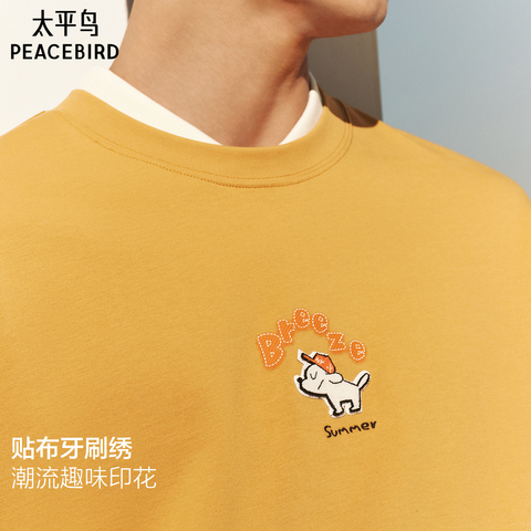 太平鸟男装 滑板小狗联名刺绣短袖T恤宽松重磅纯色t夏新款体恤衫
