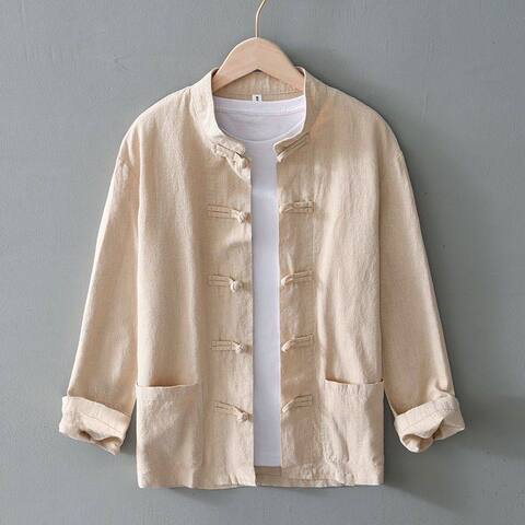 盘扣苎麻长袖国潮复古棉麻衬衫男中国风青年休闲立领宽松亚麻衬衣