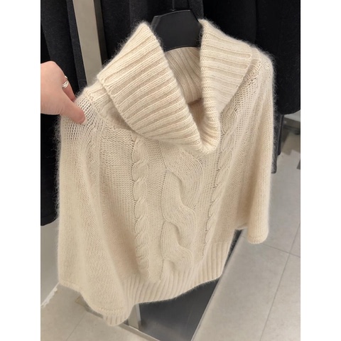 米杏色高领斗篷式五分袖毛衣女春