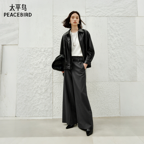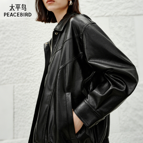 太平鸟黑色仿手搓油蜡皮PU皮衣外套女春装时尚宽松夹克女*