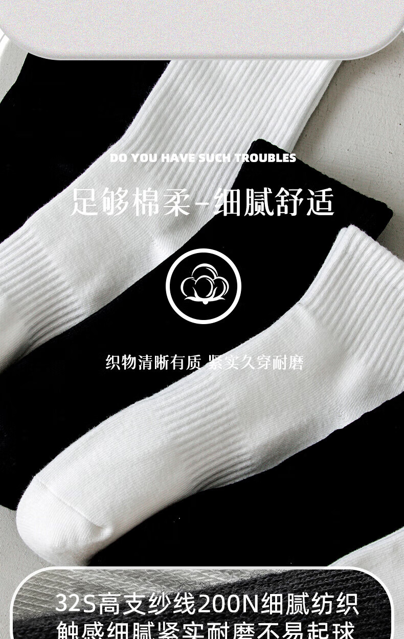 【新疆长绒棉】精梳棉袜子男女同款运动抗菌吸汗耐磨舒适透气高棉 白色 5双 均码 【中筒】