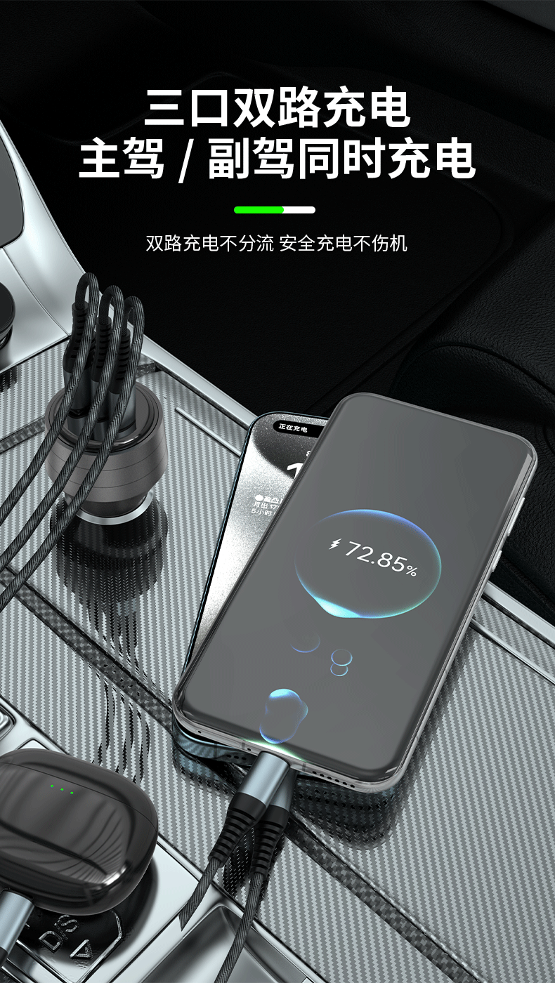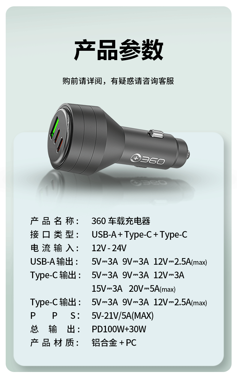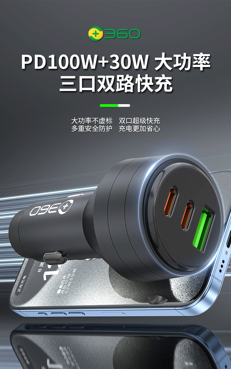 360车载充电器双路100W+30W大功率超级快充三口快充手机电脑通用 总130W大功率三口双路超级快充+双TC快充线
