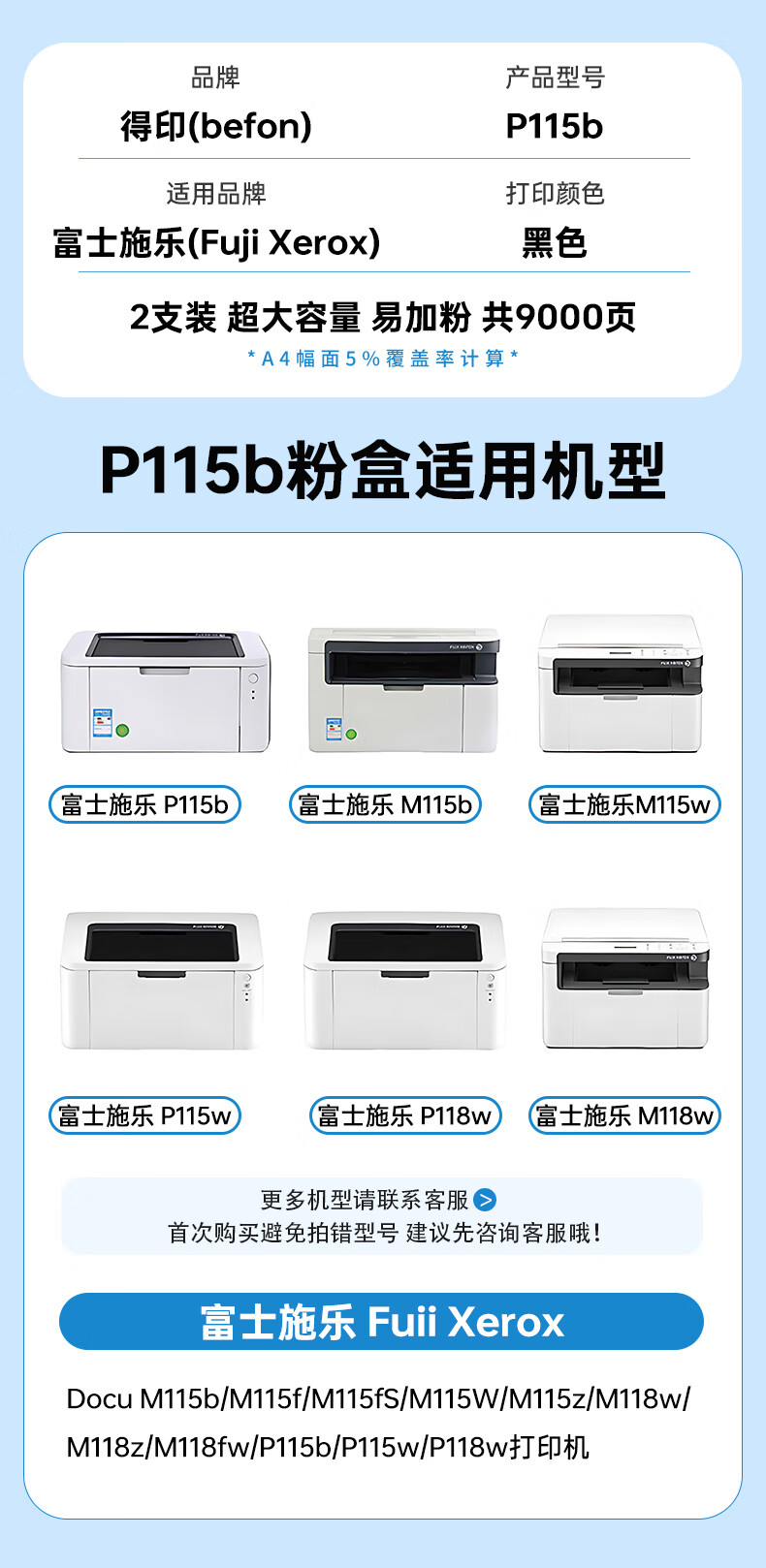 得印P115b超大容量黑色粉盒双支装CT202138 适用富士施乐P115b/M115b/M115f/M115fs/P118w/M118w/M118z打印机墨盒