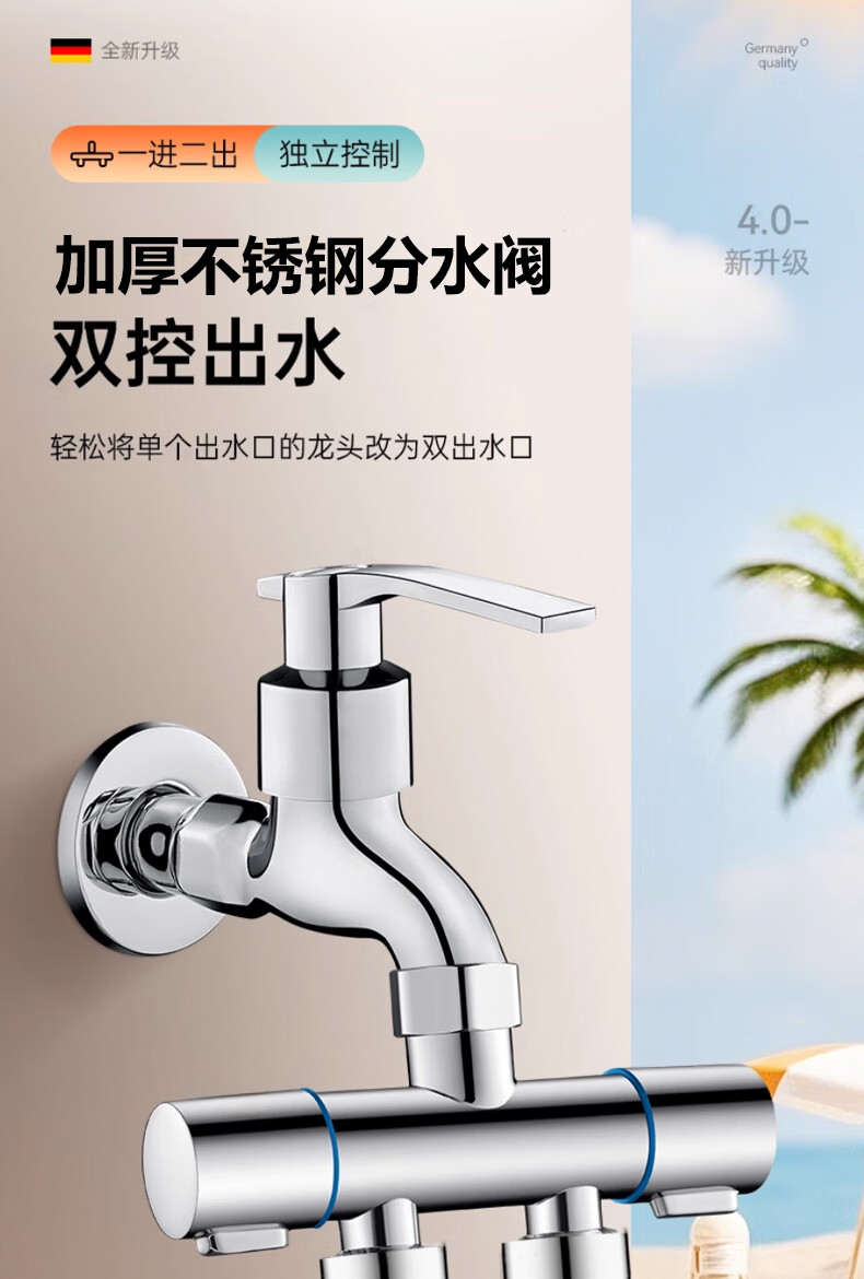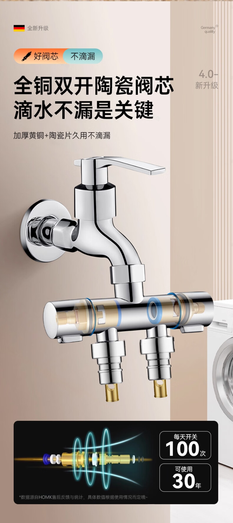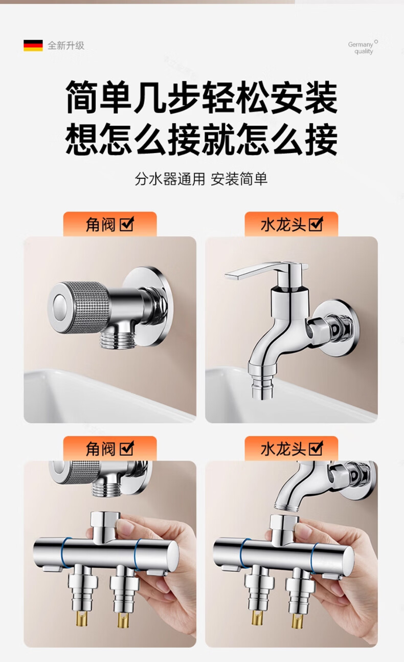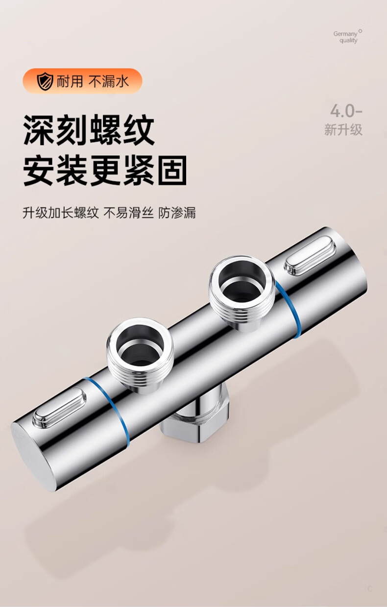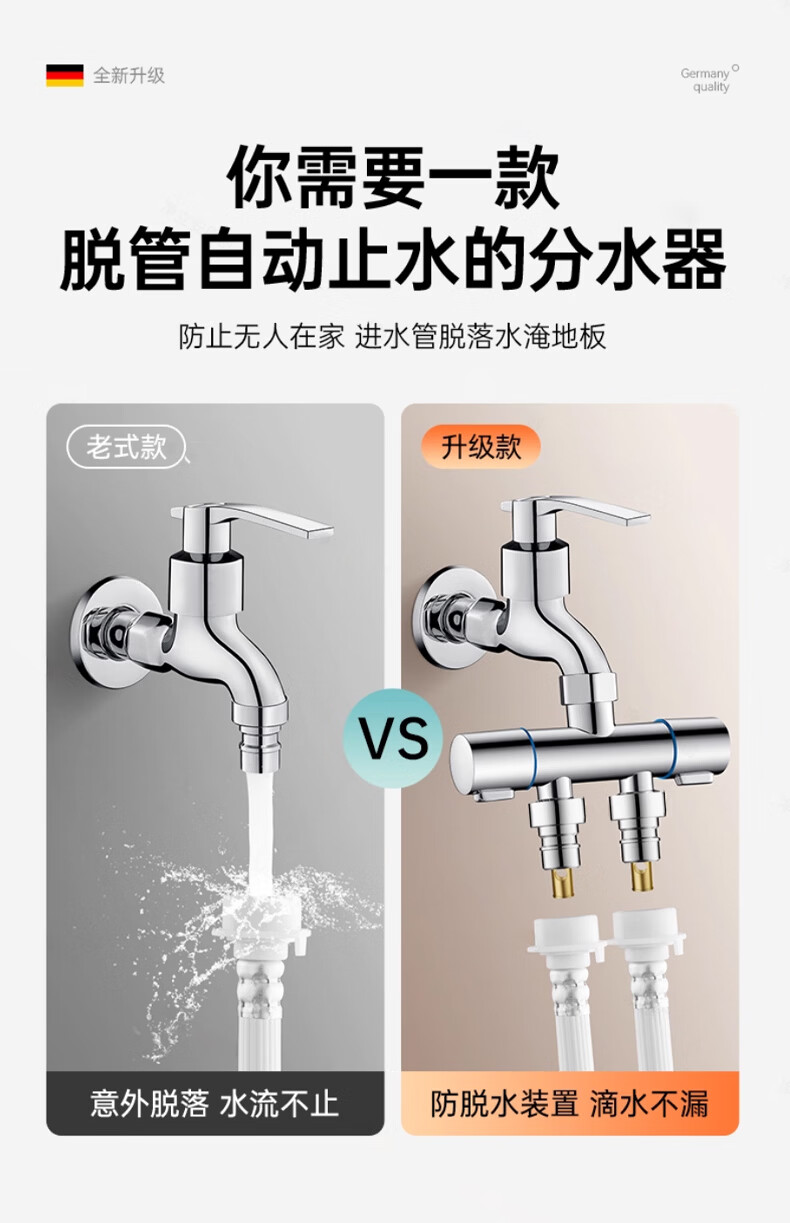 HOMK【德国】洗衣机水龙头专用一进二出角阀分水器三通接头脱落止水 【4分止水+4分止水】质感银 精铜止水杆丨漏水包退换