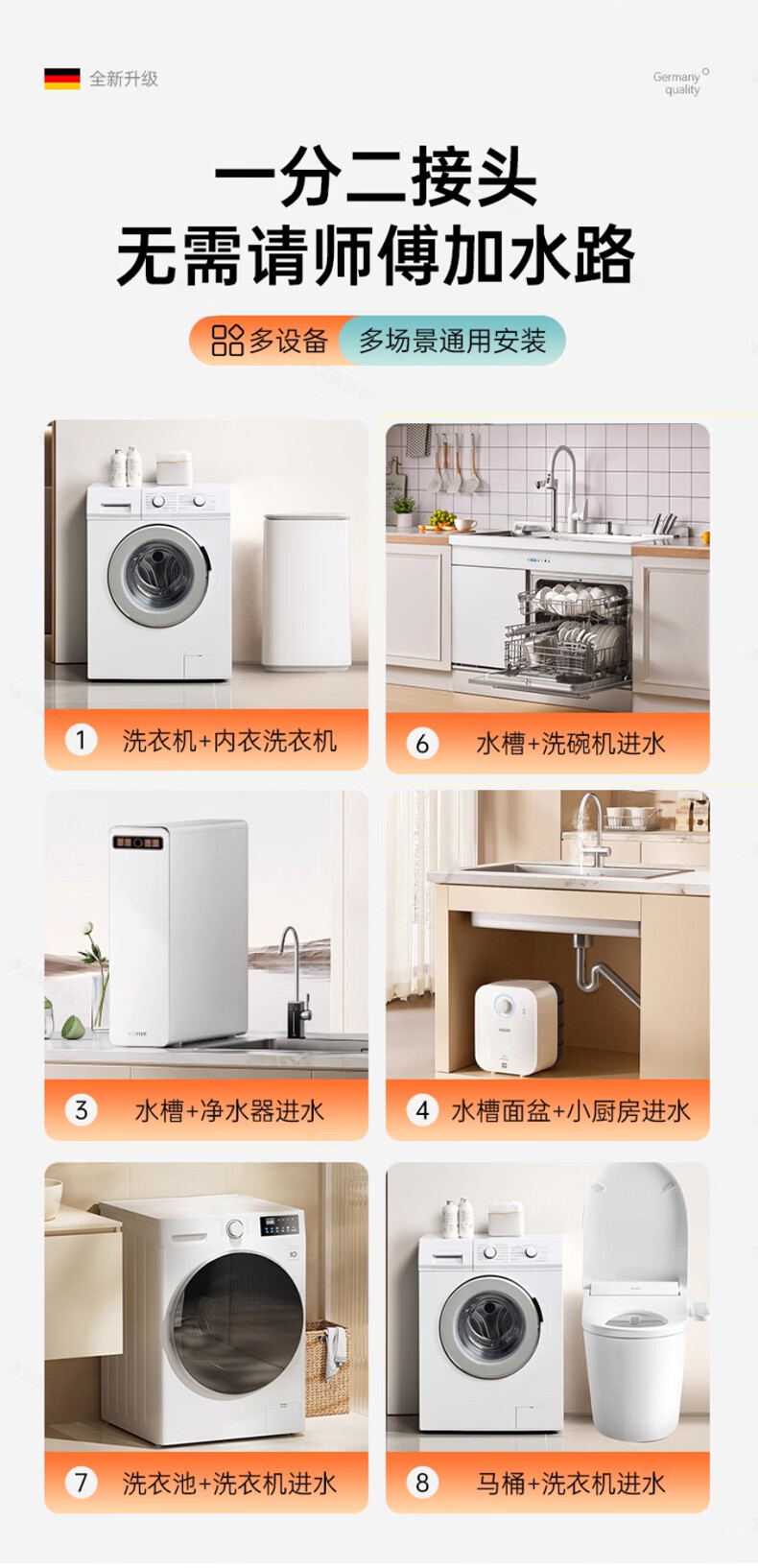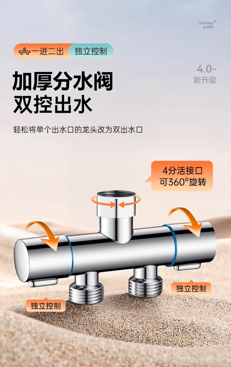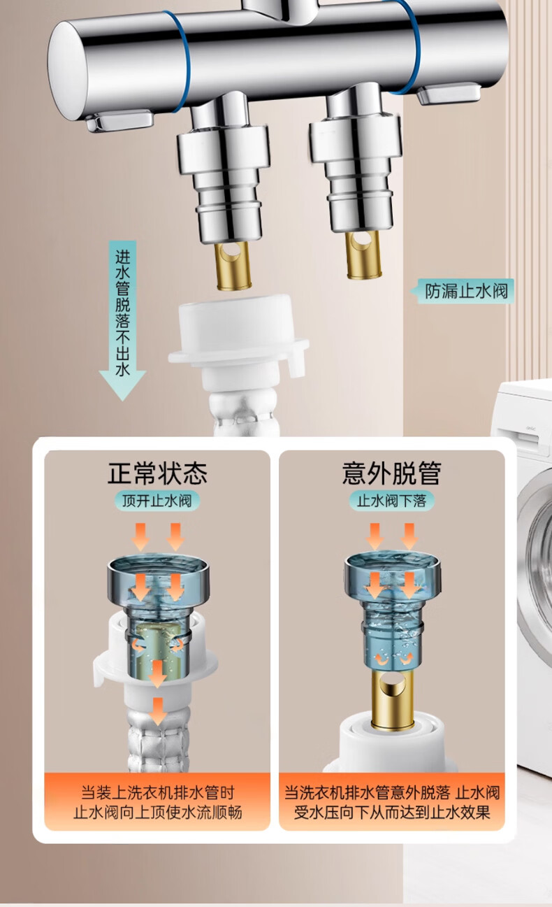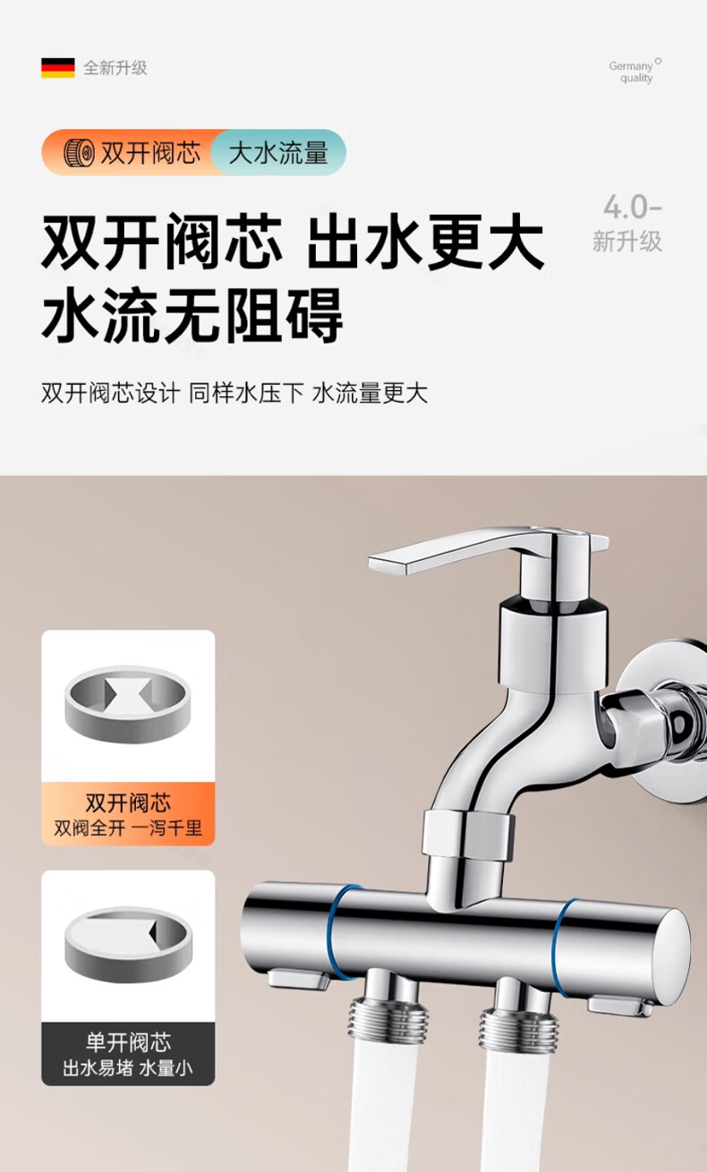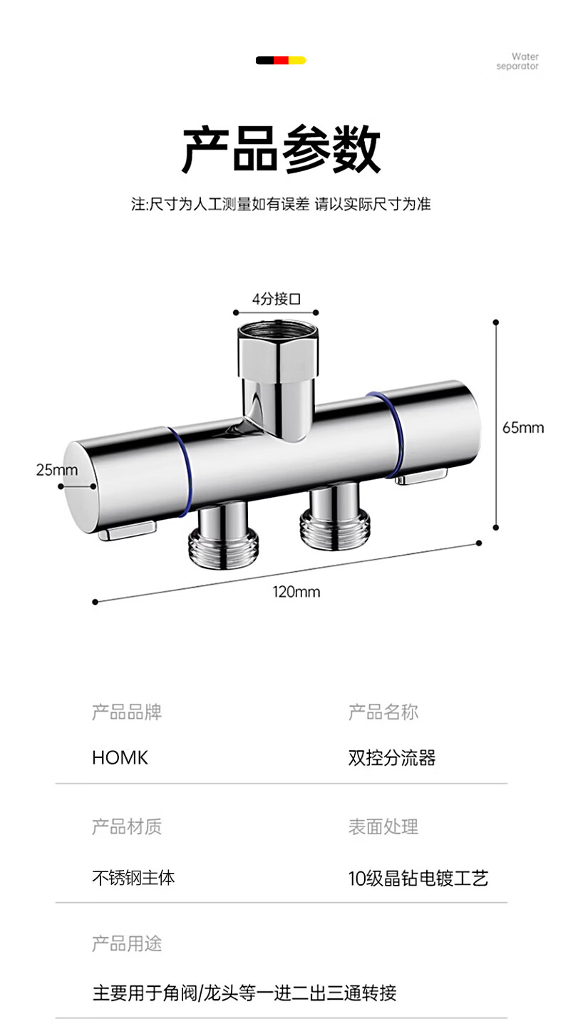 HOMK【德国】洗衣机水龙头专用一进二出角阀分水器三通接头脱落止水 【4分止水+4分止水】质感银 精铜止水杆丨漏水包退换