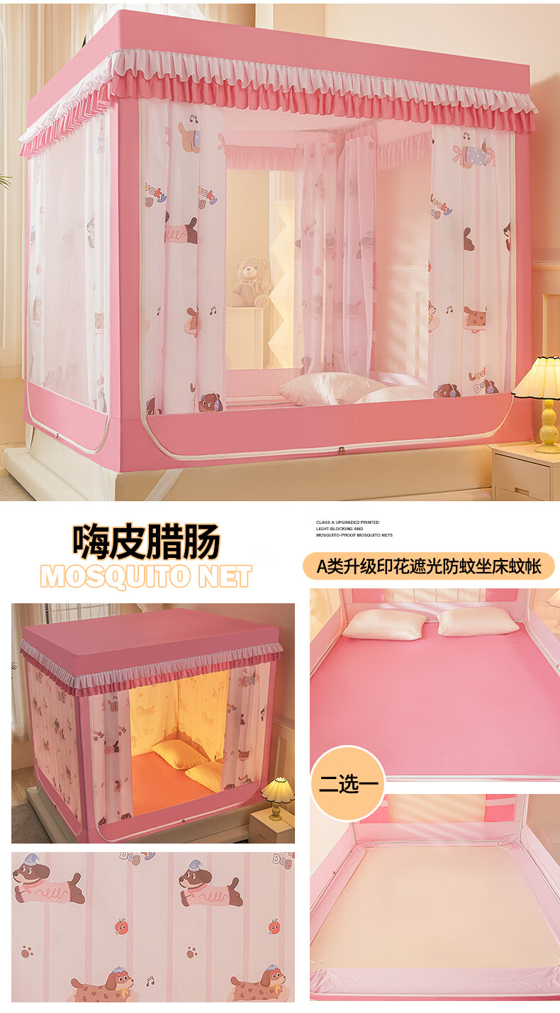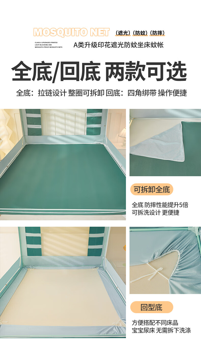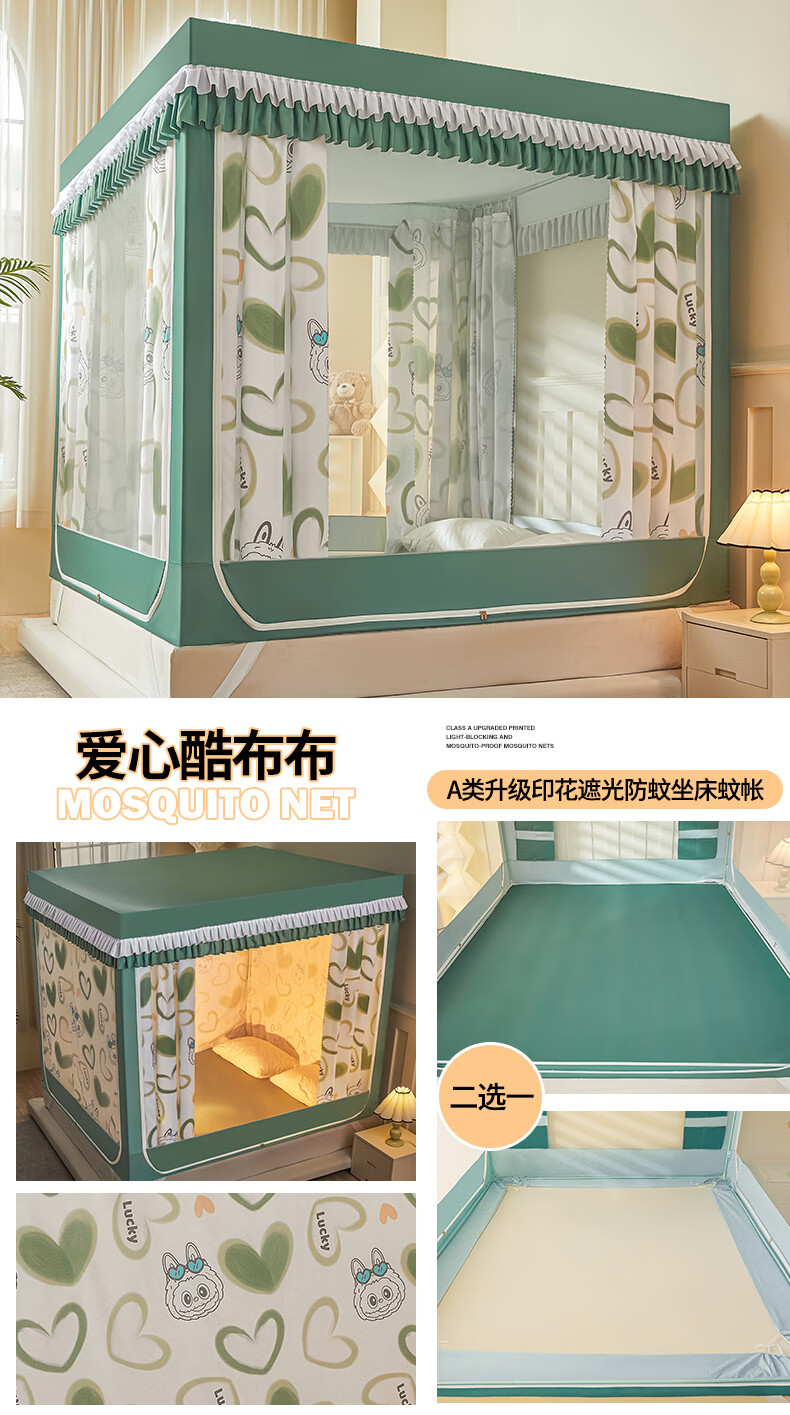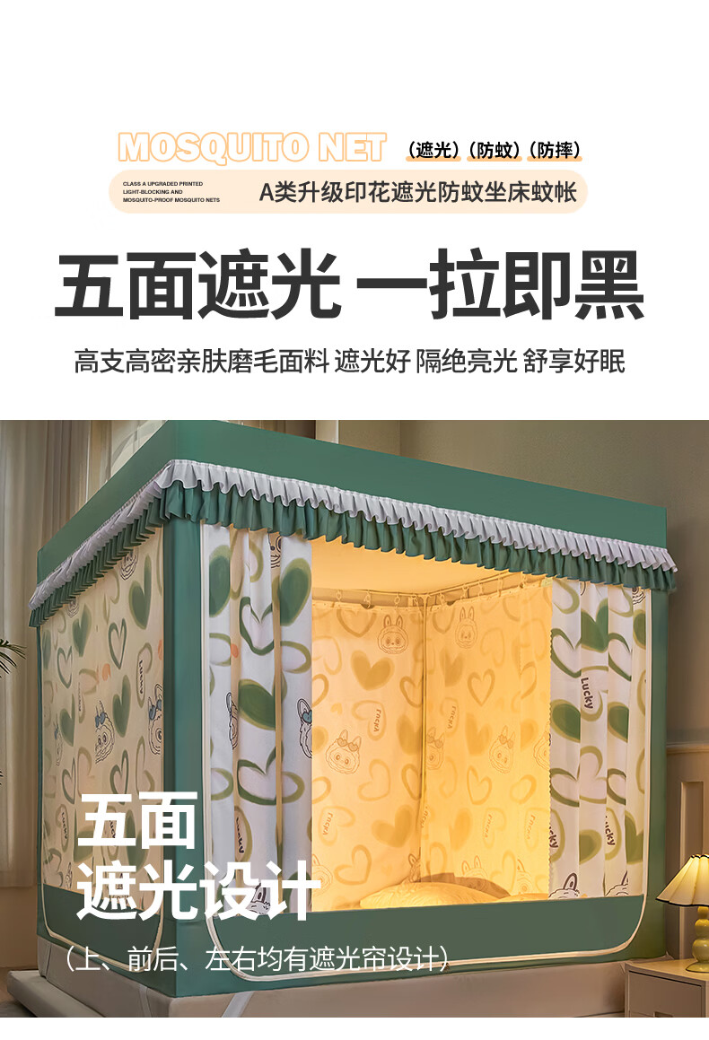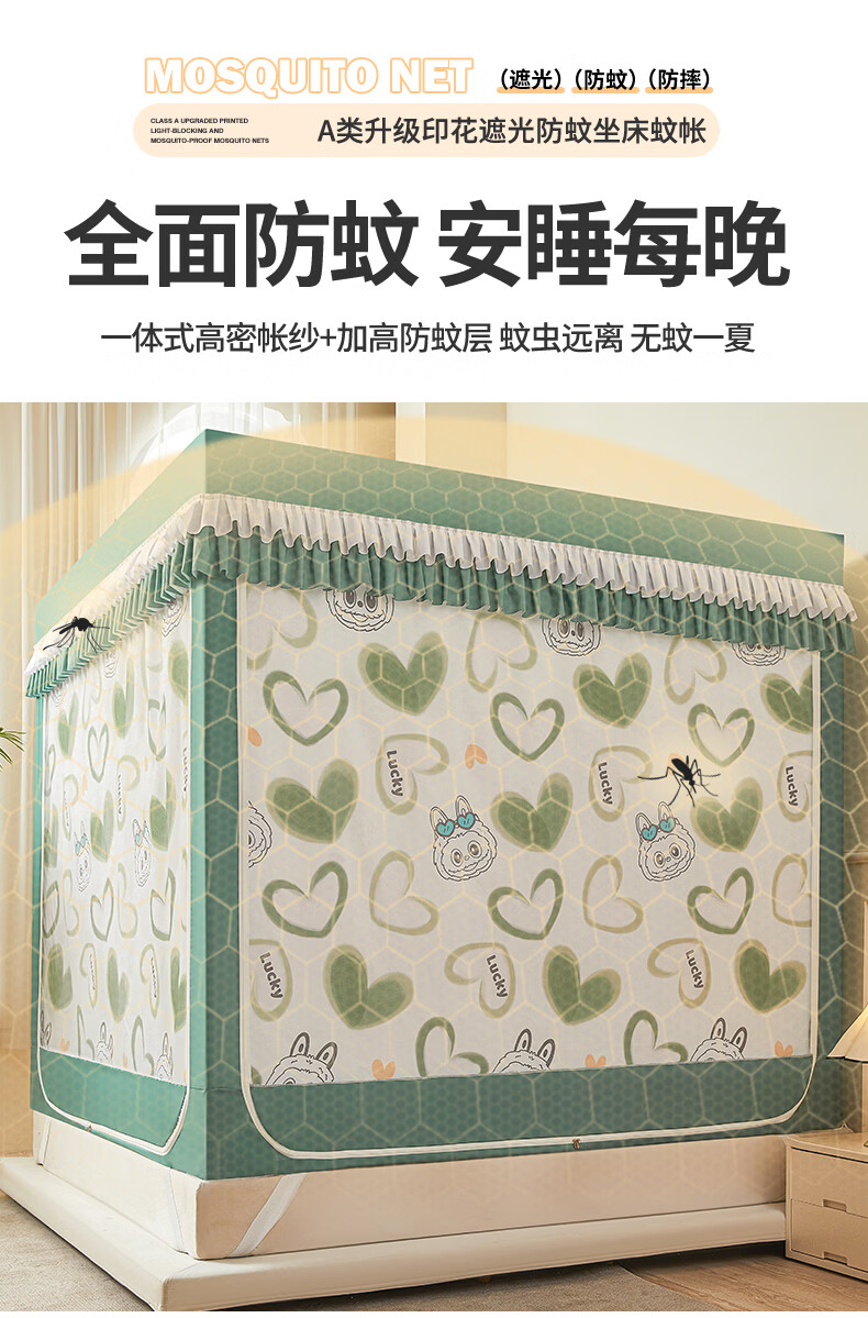 无印良品A类儿童防摔蚊帐1.8x2米家用卧室全遮光蚊帐防摔婴儿床围栏一体式 【回底款】爱心酷布布-带床帘 180cm*200cm*170cm 【加厚自连接支架】