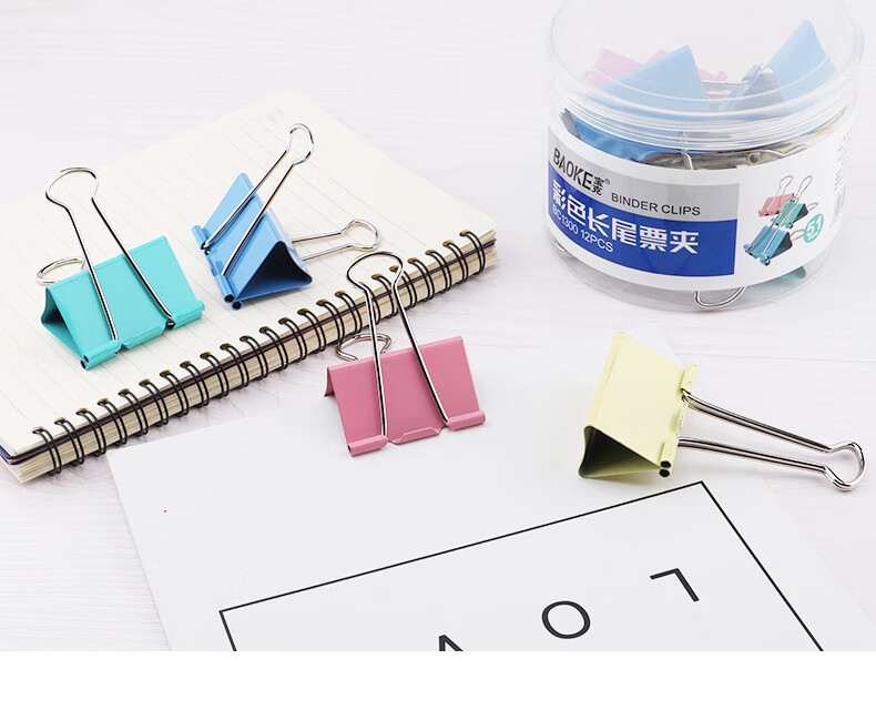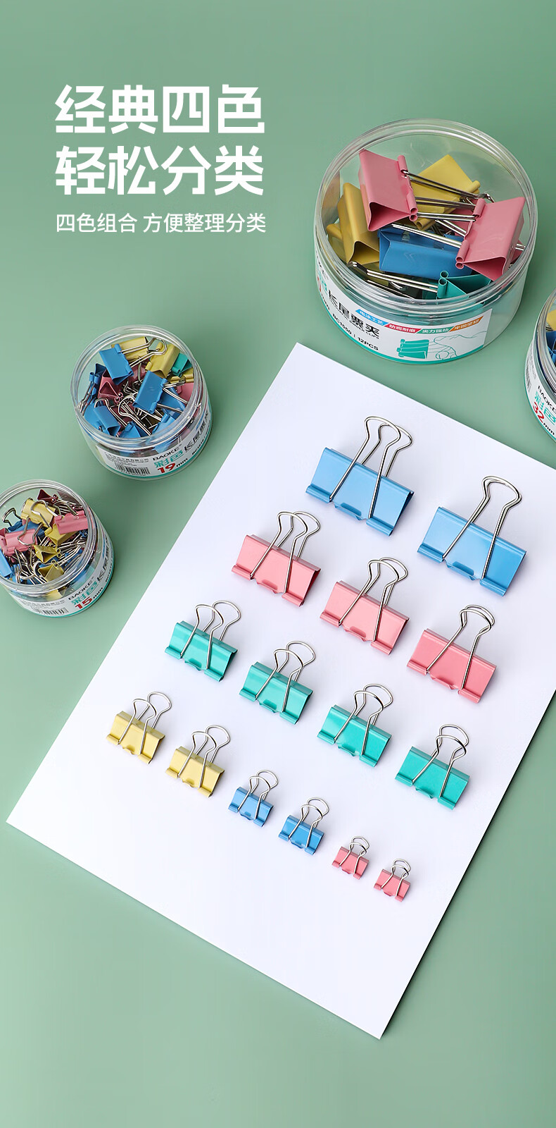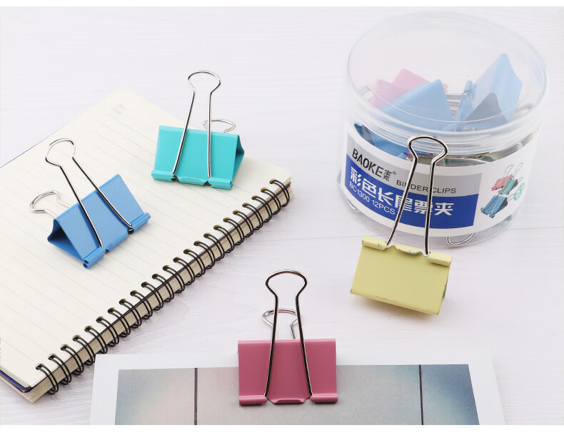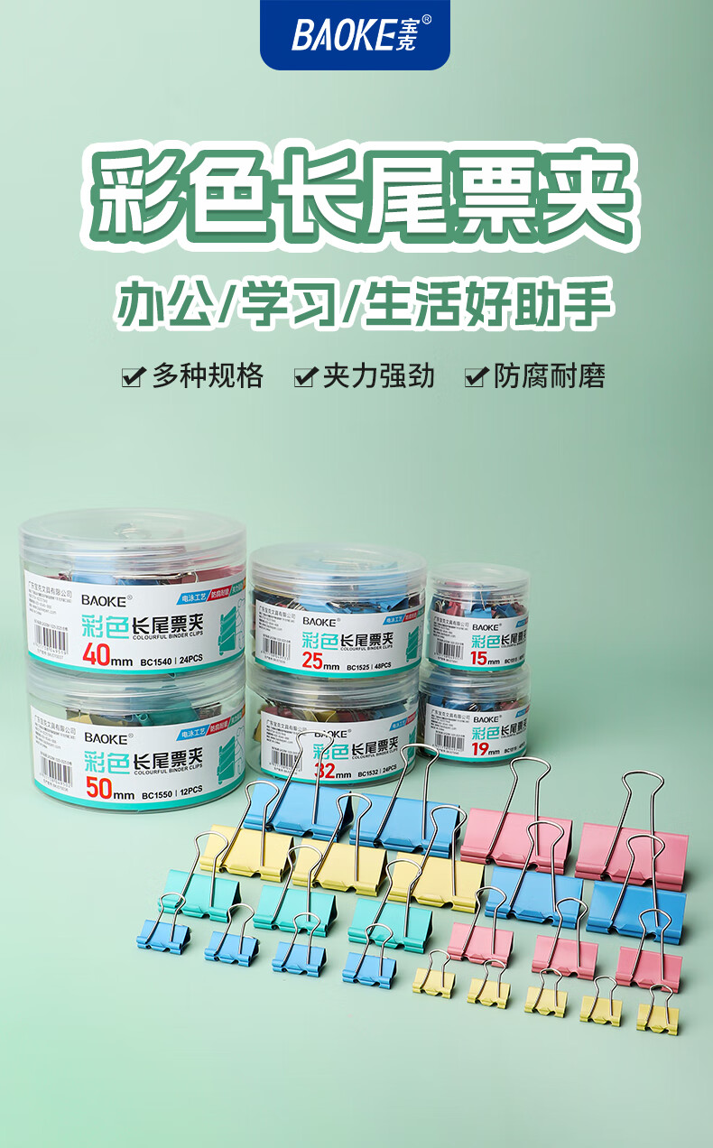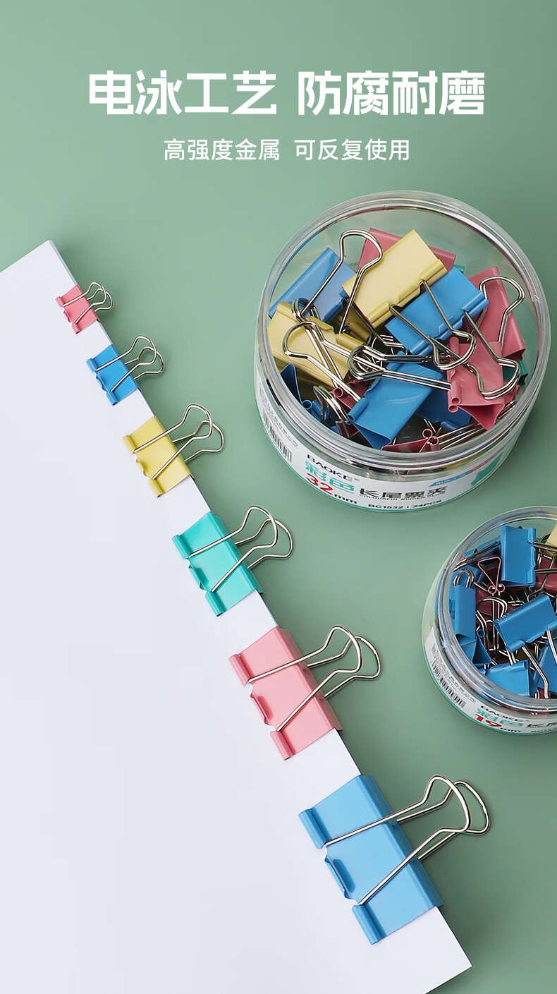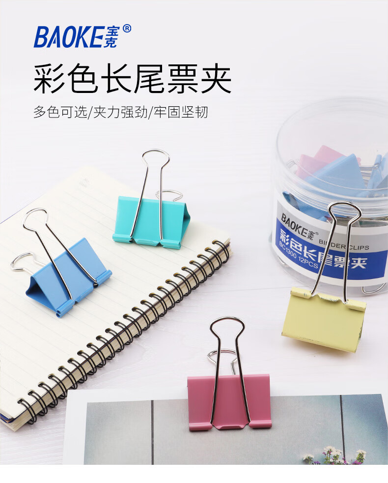宝克(BAOKE)彩色长尾夹 金属文件夹 大中小号燕尾夹 票据夹子 学生试卷夹 办公用品 文具 【电泳工艺】彩色套装/15mm+19mm+25mm