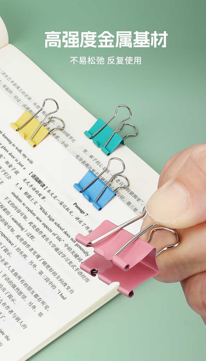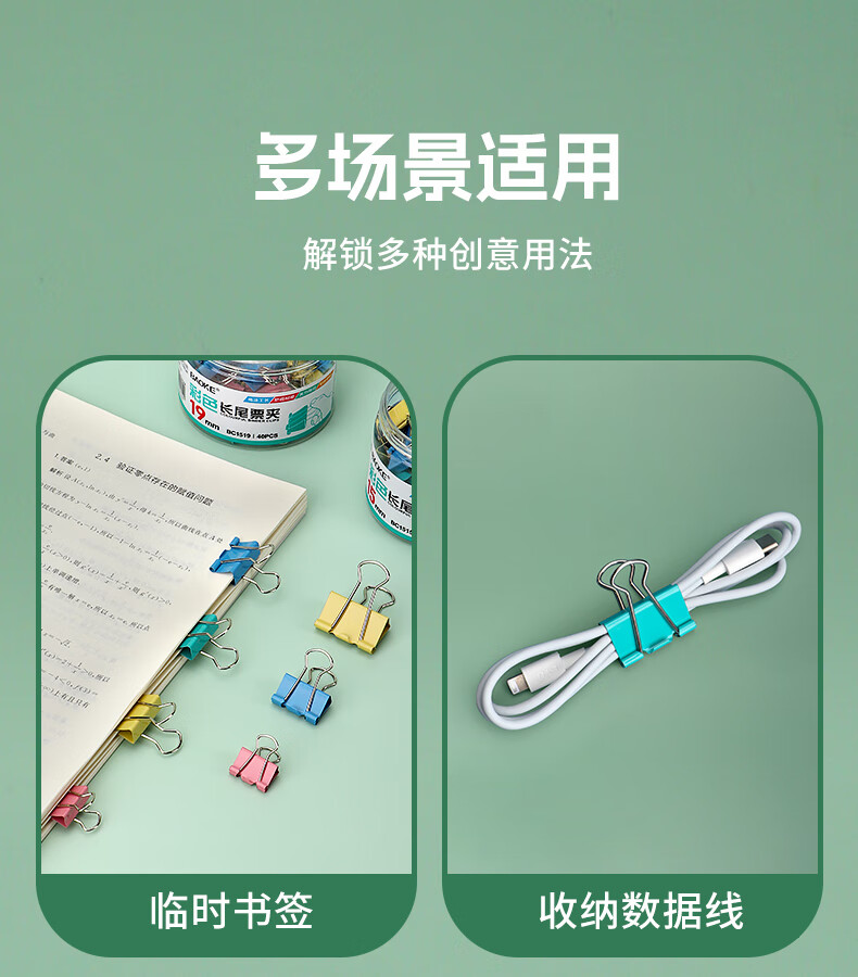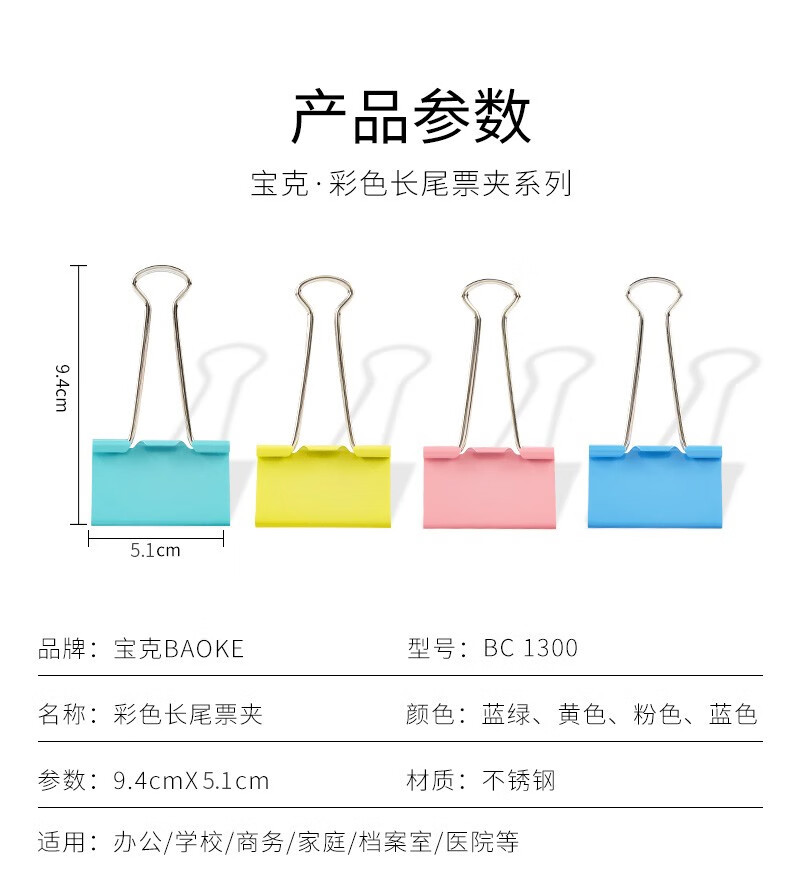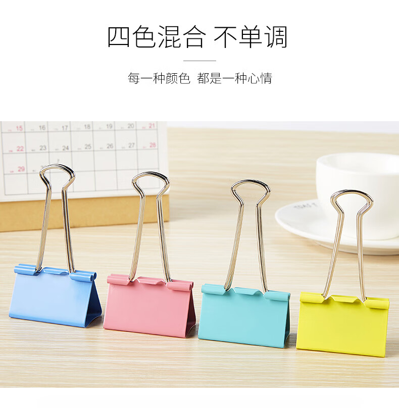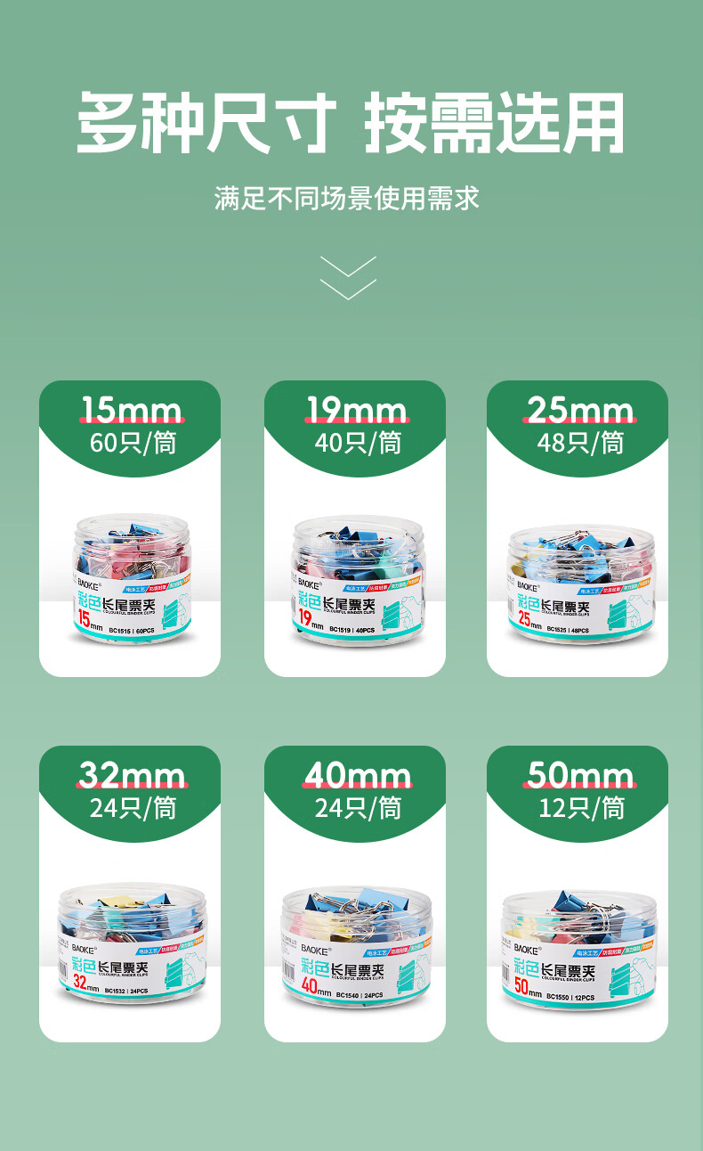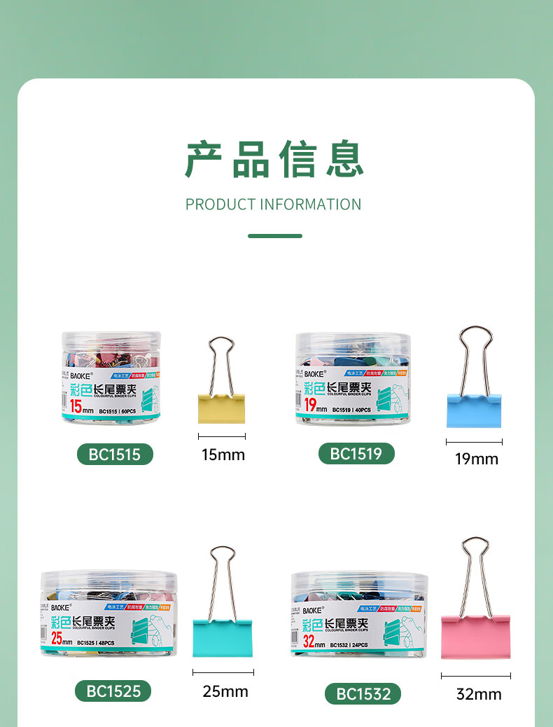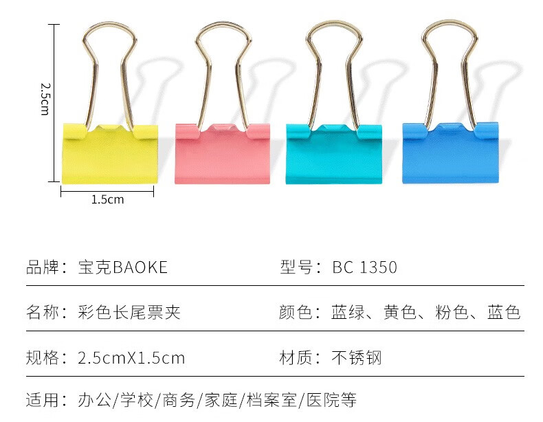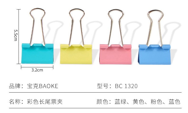 宝克(BAOKE)彩色长尾夹 金属文件夹 大中小号燕尾夹 票据夹子 学生试卷夹 办公用品 文具 【电泳工艺】彩色套装/15mm+19mm+25mm