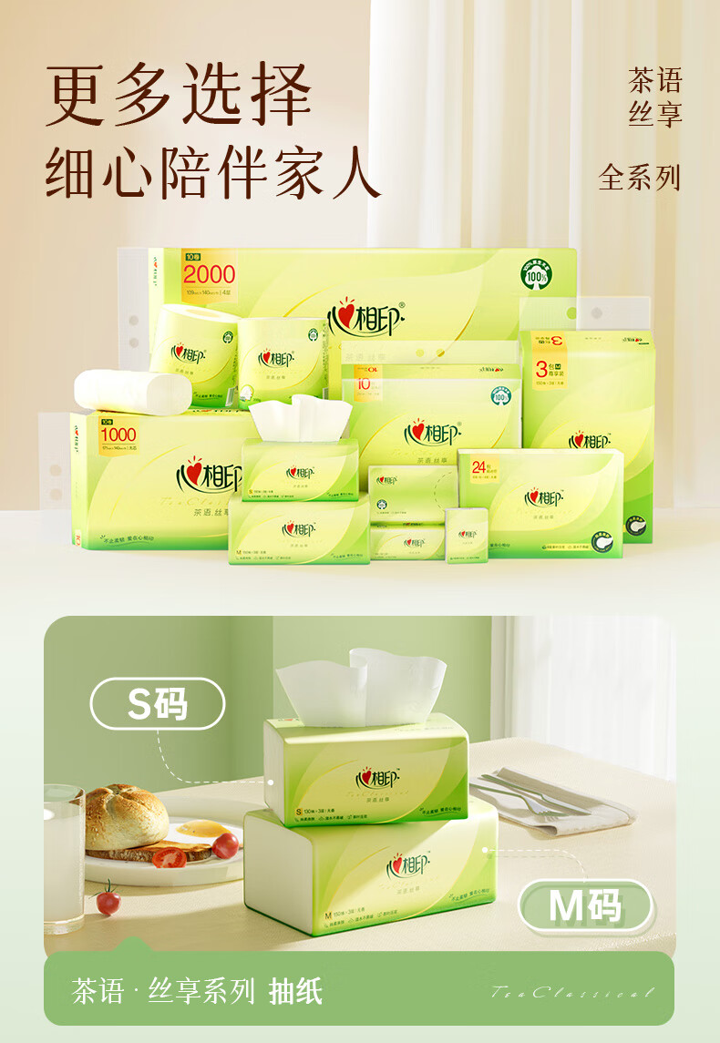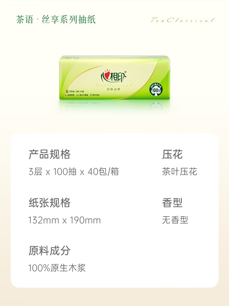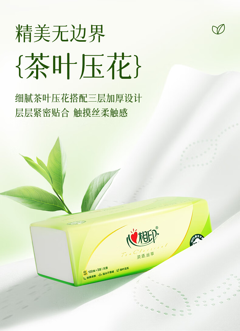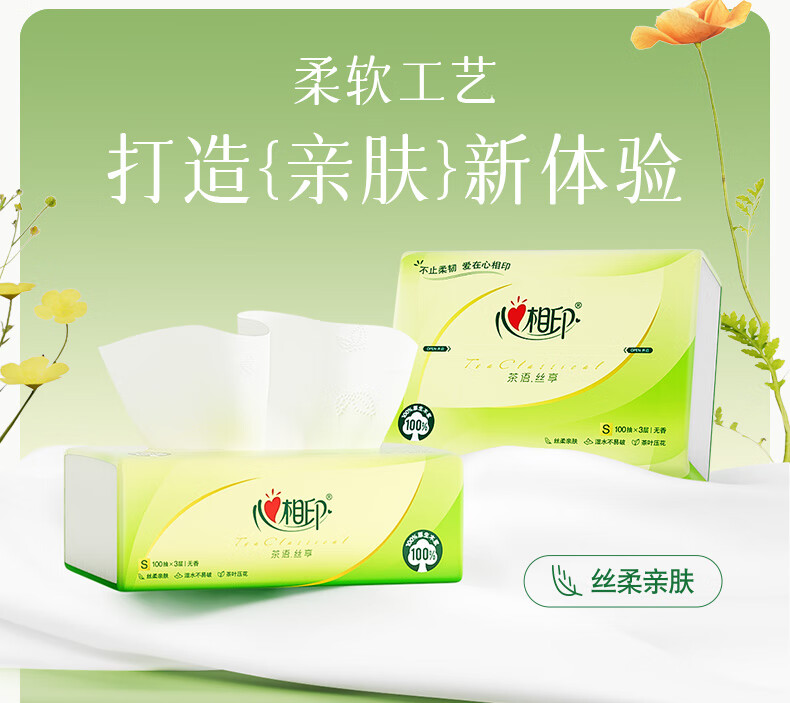 心相印抽纸茶语丝享纸巾家用卫生纸抽心心相印餐巾纸批实惠装 3层 100抽*3包