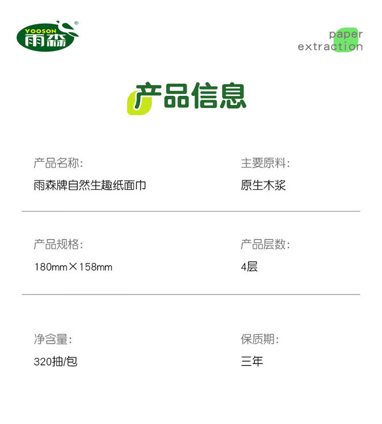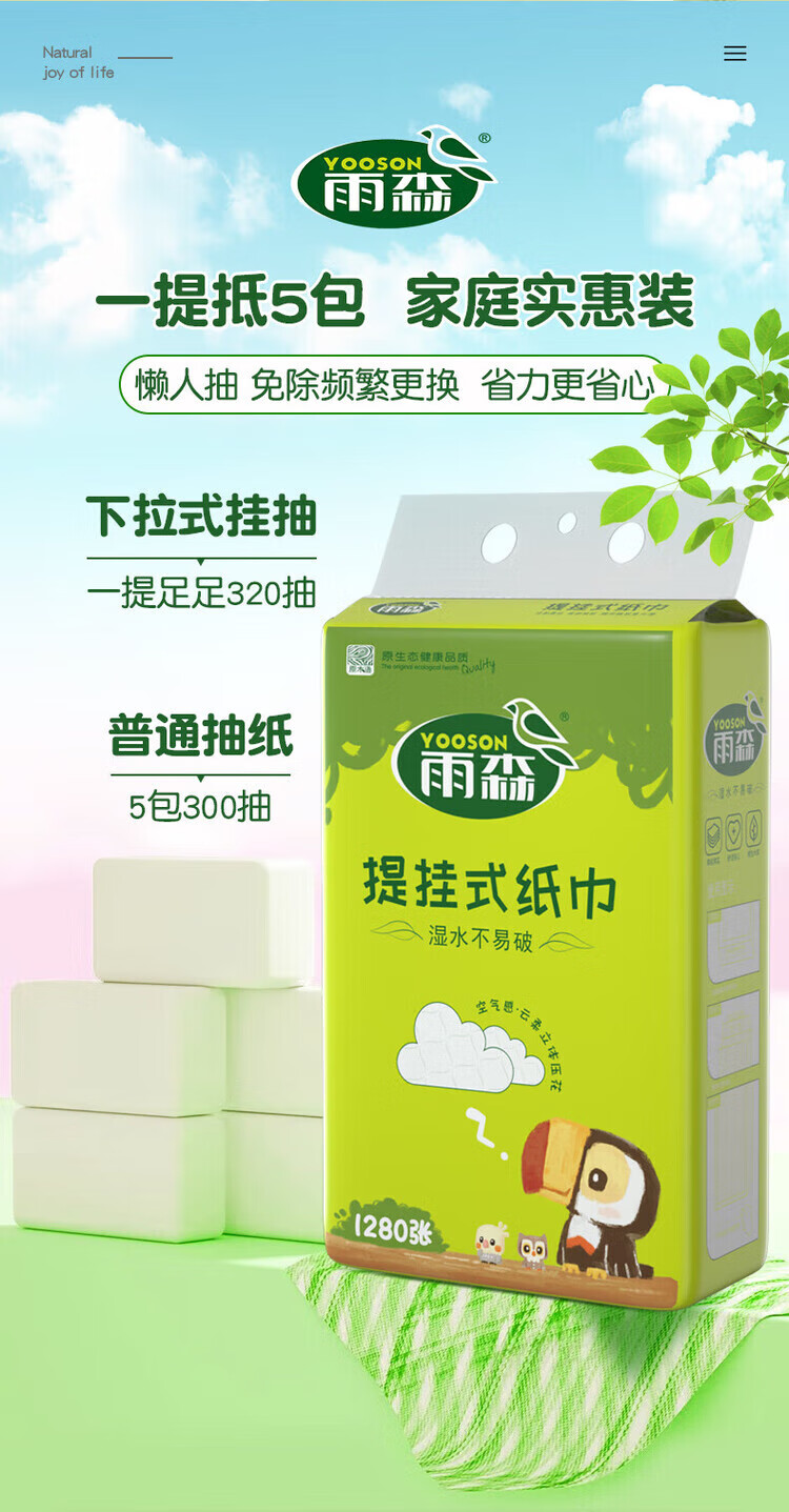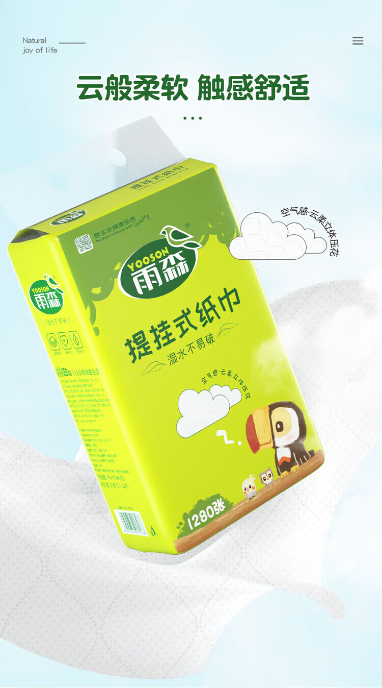 雨森(YUSEN)自然生趣提挂抽纸面巾纸底部抽取纸巾1280张/包手纸 4层 1280张 * 1提 【体验】