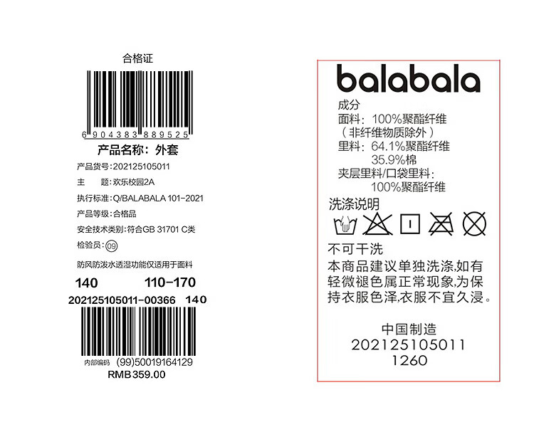 巴拉巴拉童装女童外套儿童软壳衣2025春防护便服【商场同款】202125105011