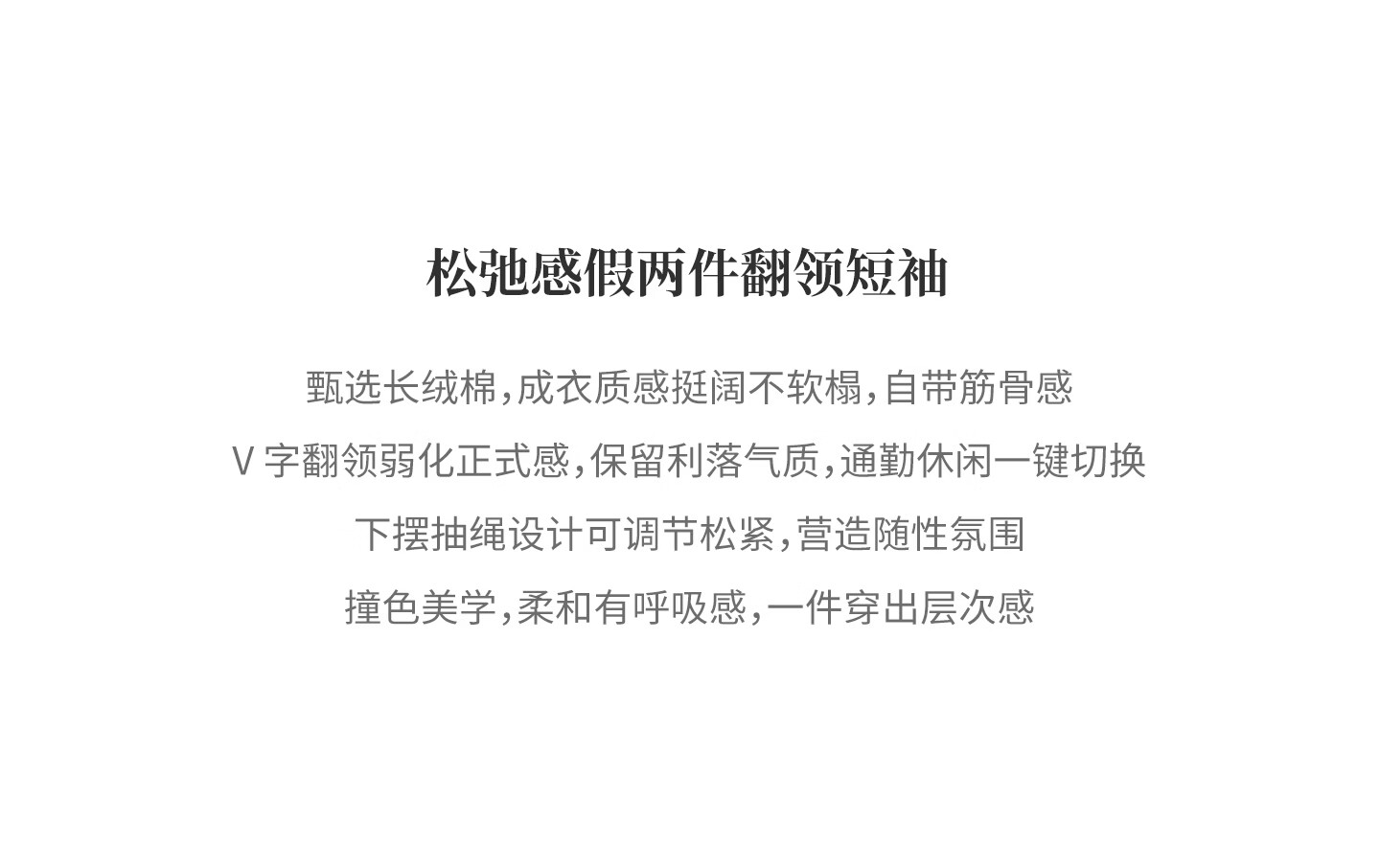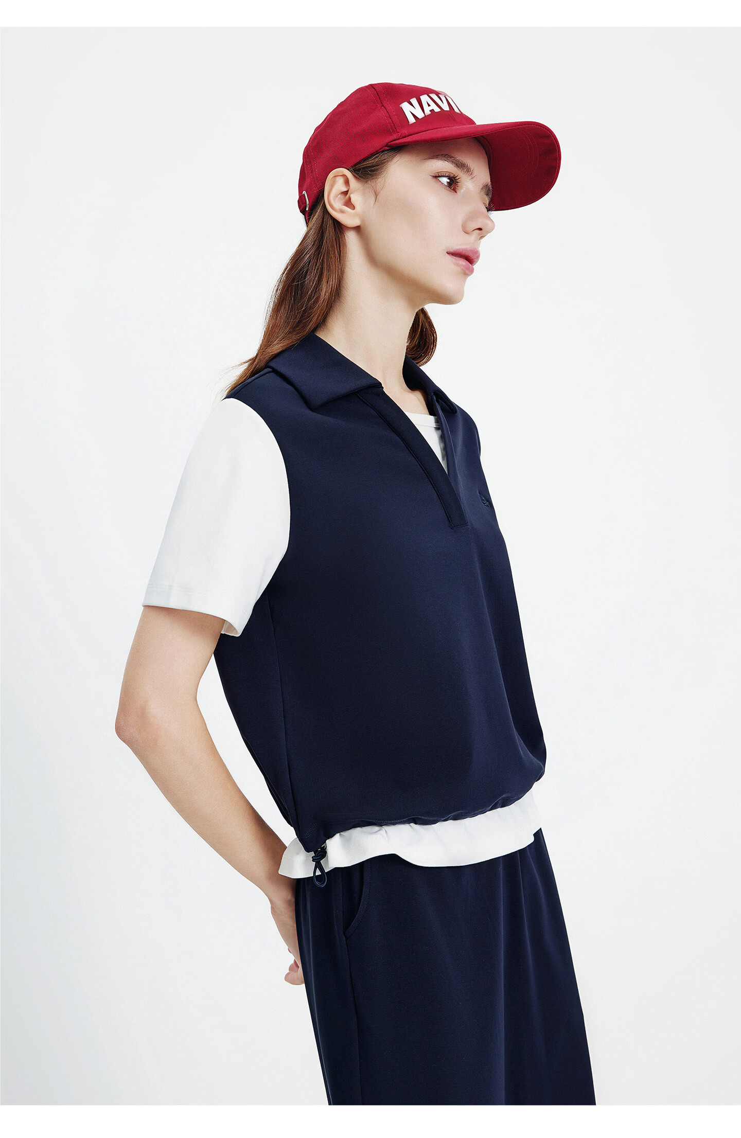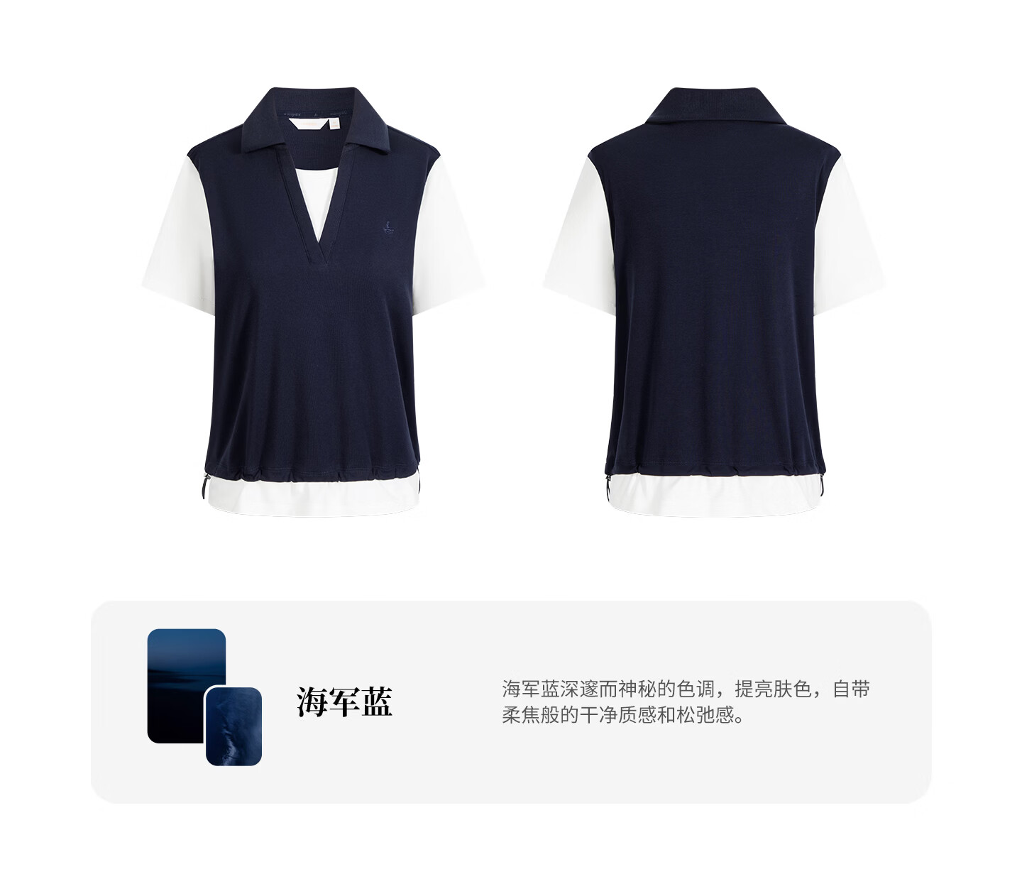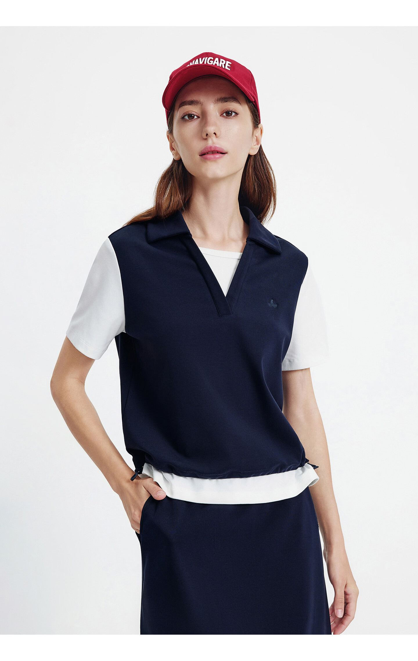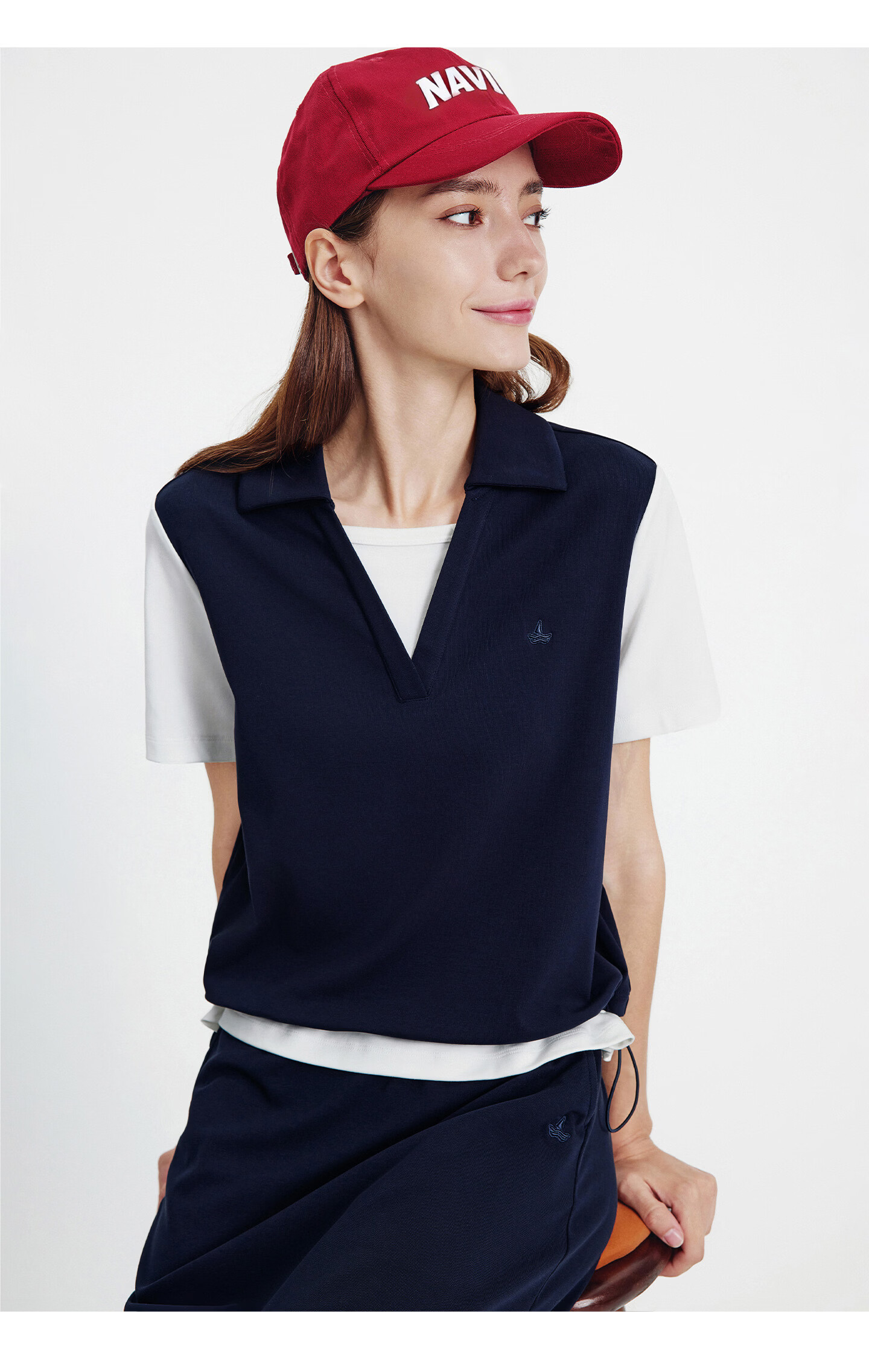 Navigare小帆船假两件V字翻领上衣2026新款女士宽松撞色短袖T恤2325536504