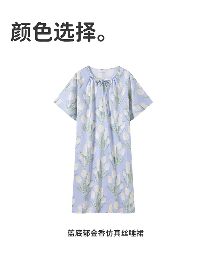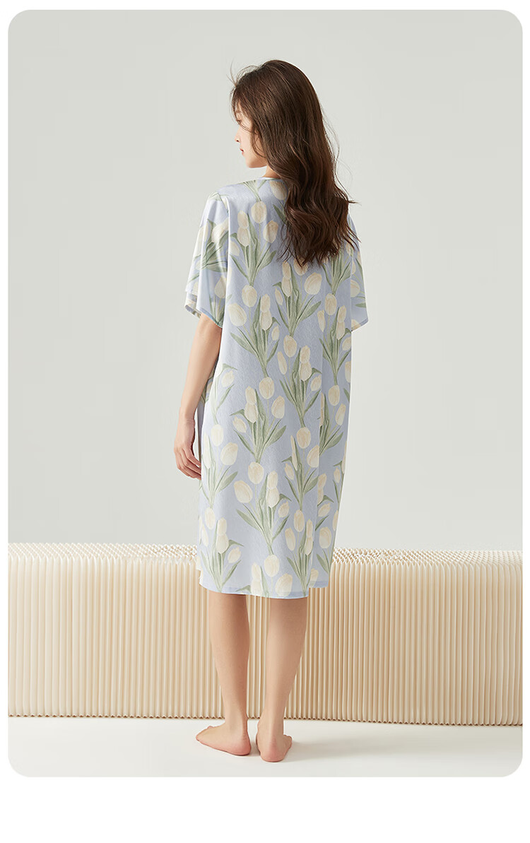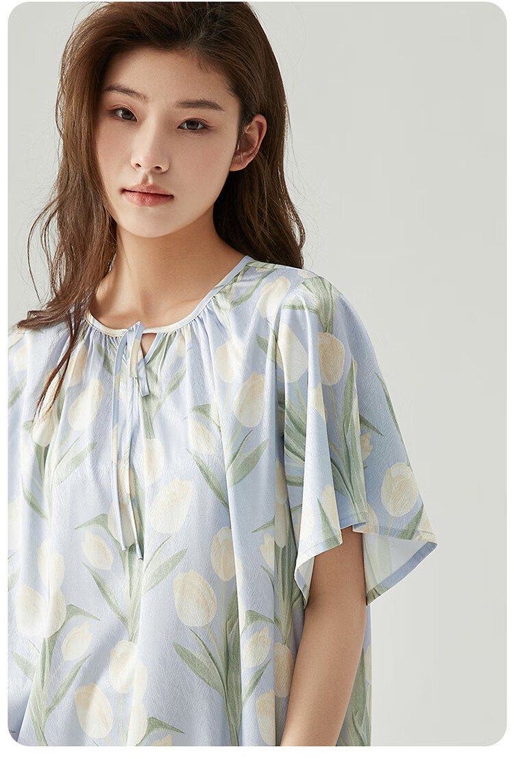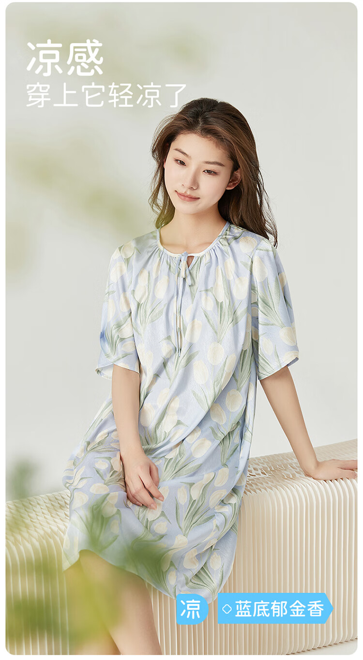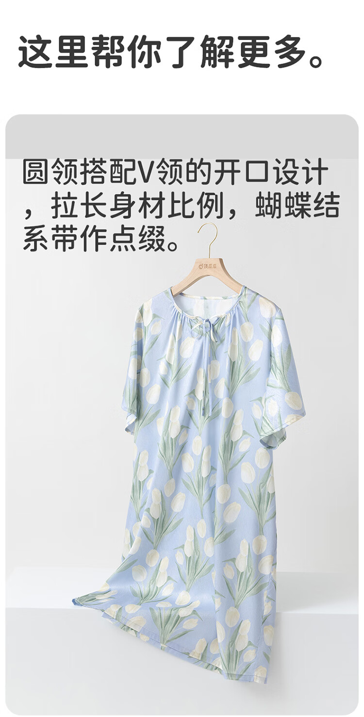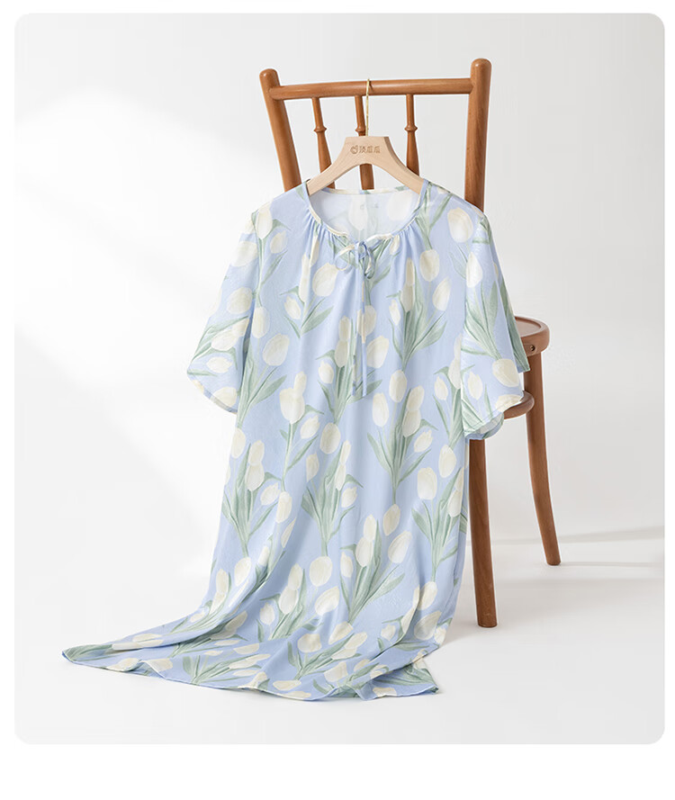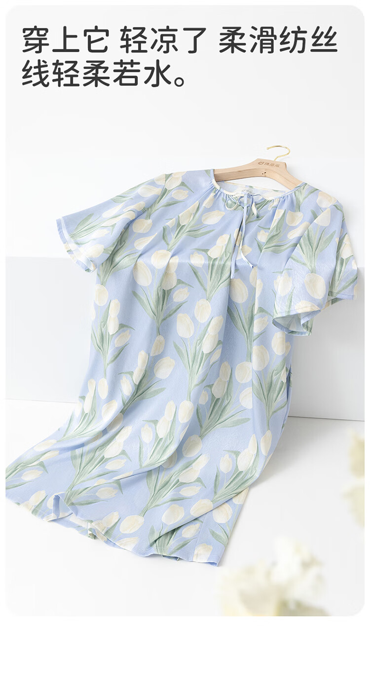 顶瓜瓜浪漫郁金香 轻柔冰雪丝女士柔滑垂顺短袖居家睡裙冰雪丝睡裙 蓝底郁金香 2XL (175)