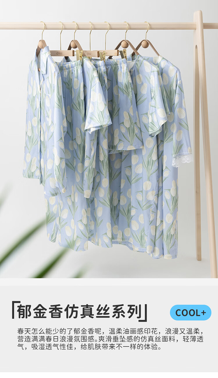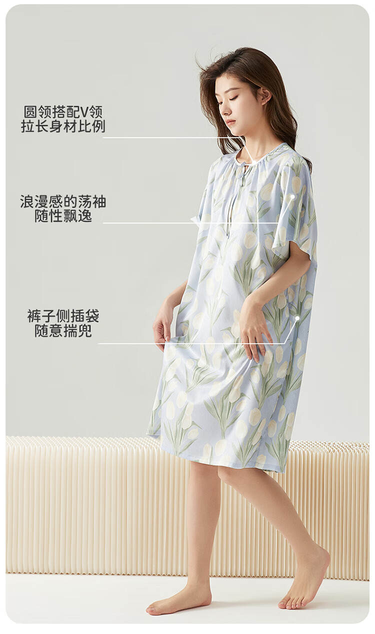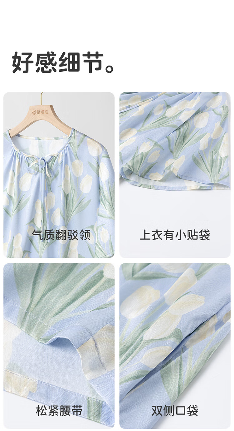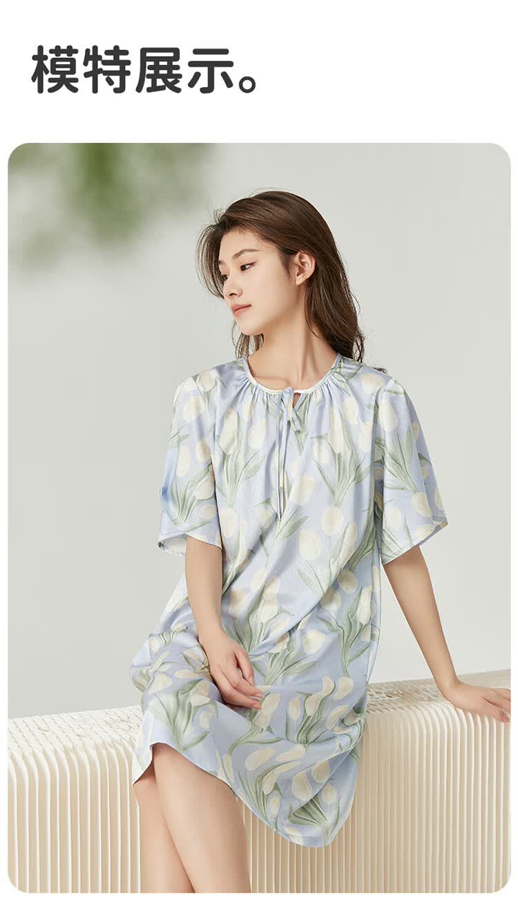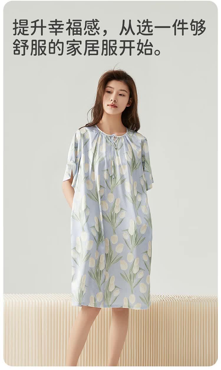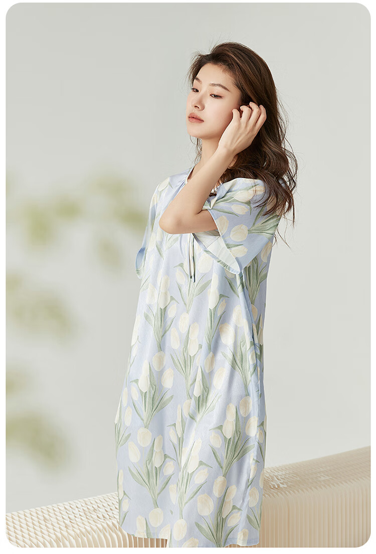 顶瓜瓜浪漫郁金香 轻柔冰雪丝女士柔滑垂顺短袖居家睡裙冰雪丝睡裙 蓝底郁金香 2XL (175)