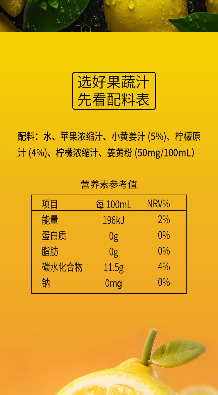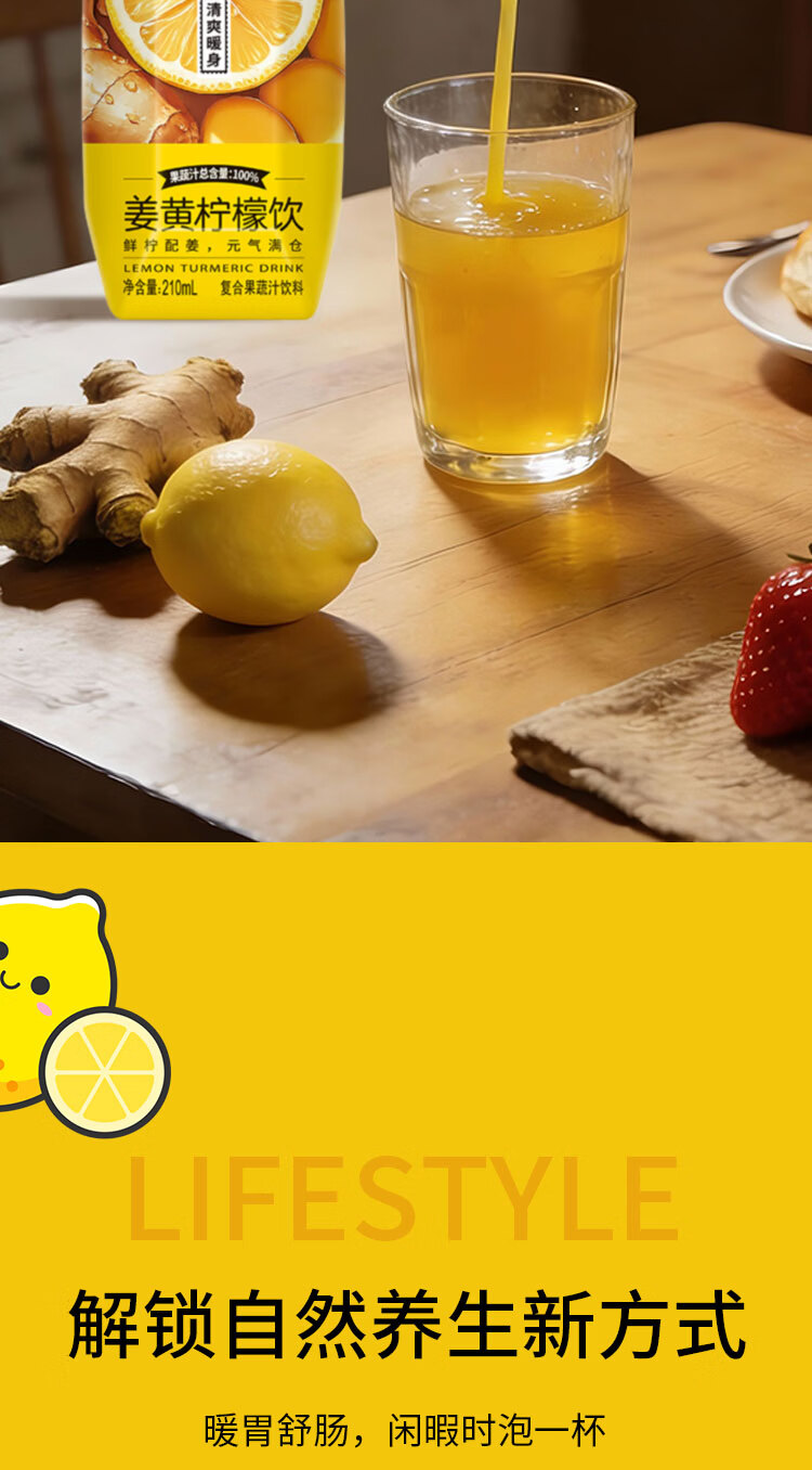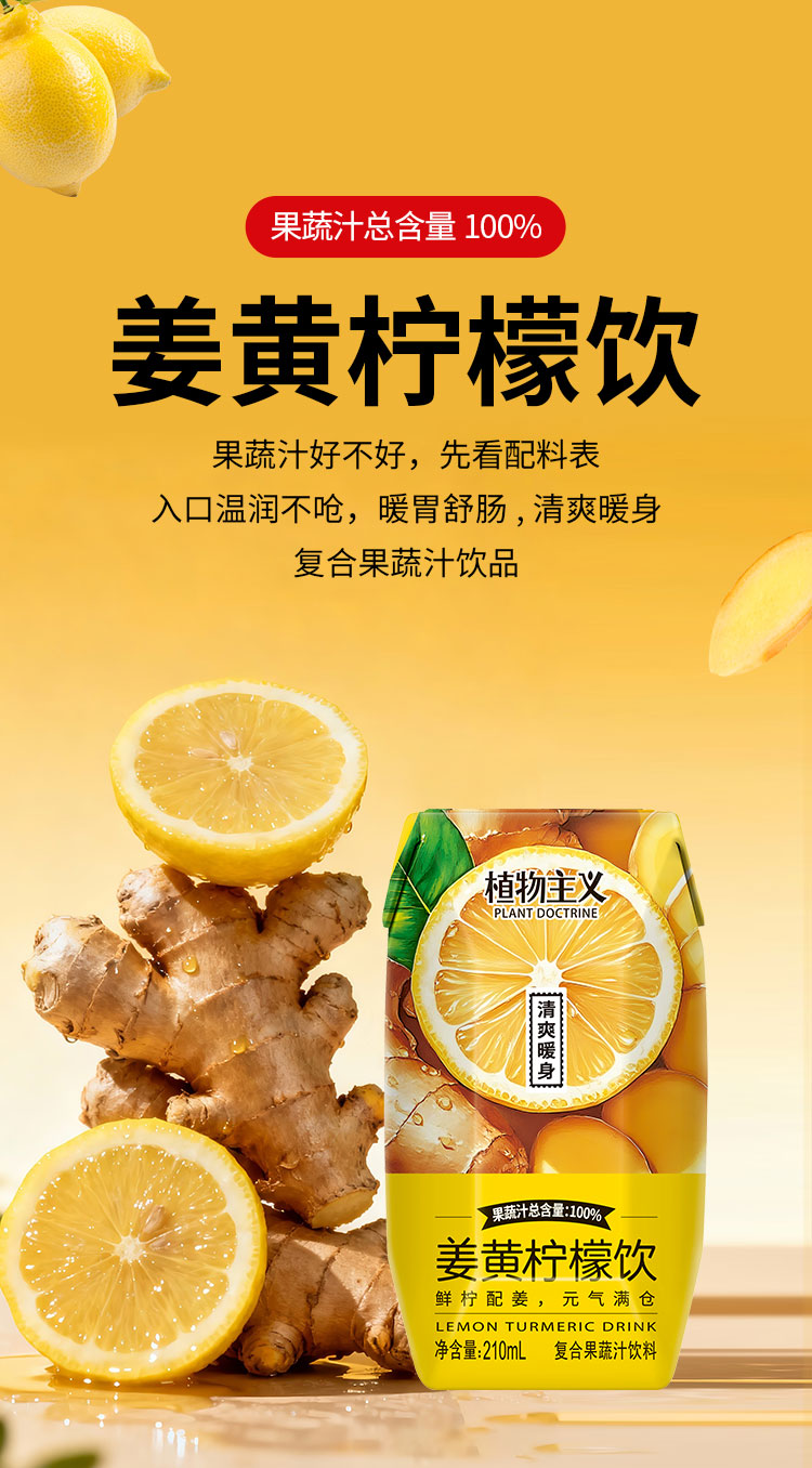 植物主义姜黄柠檬饮210ml*12瓶100%果蔬含量0添加剂0蔗糖添加复合果汁饮料 姜黄柠檬饮12瓶整箱装(0添加剂)