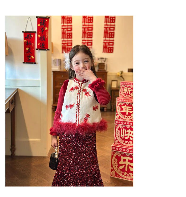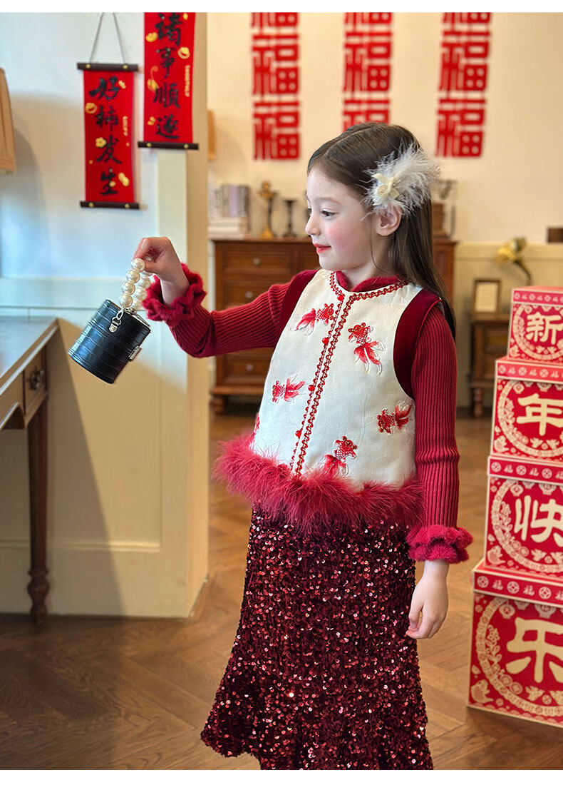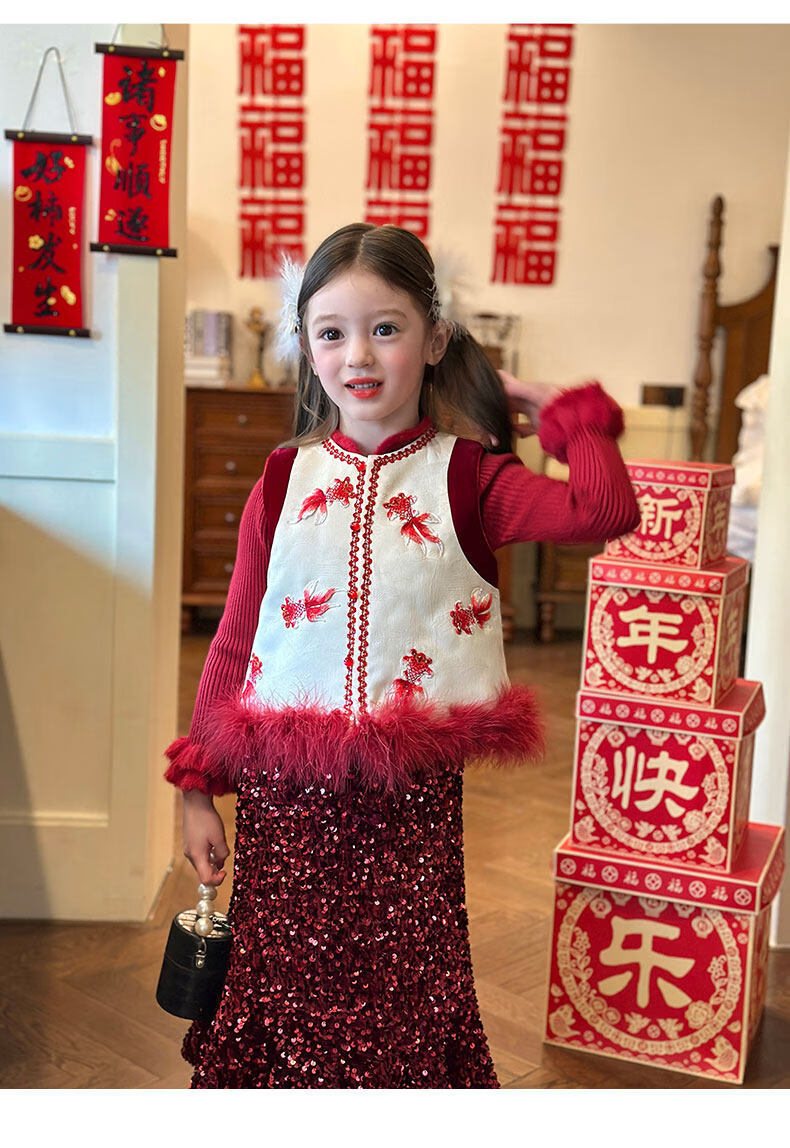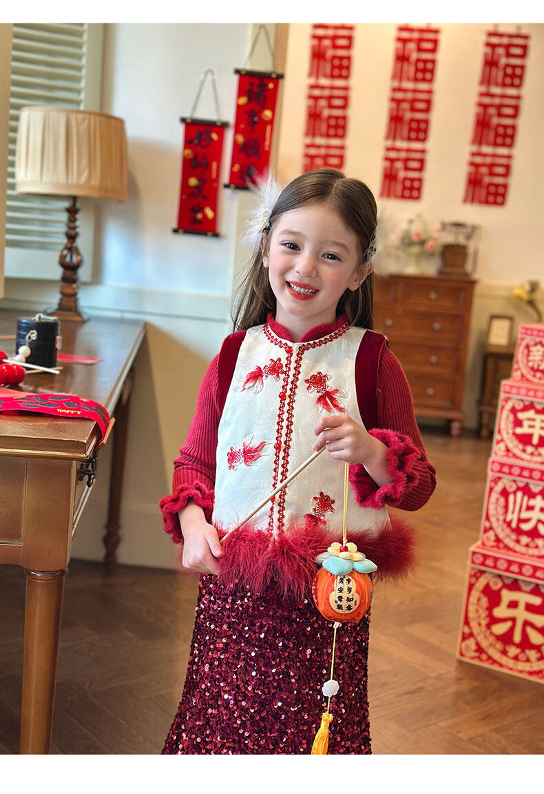 栀了成长记童装女童国风锦鲤唐装马甲2025冬季儿童新中式夹棉上衣 打底衫 120