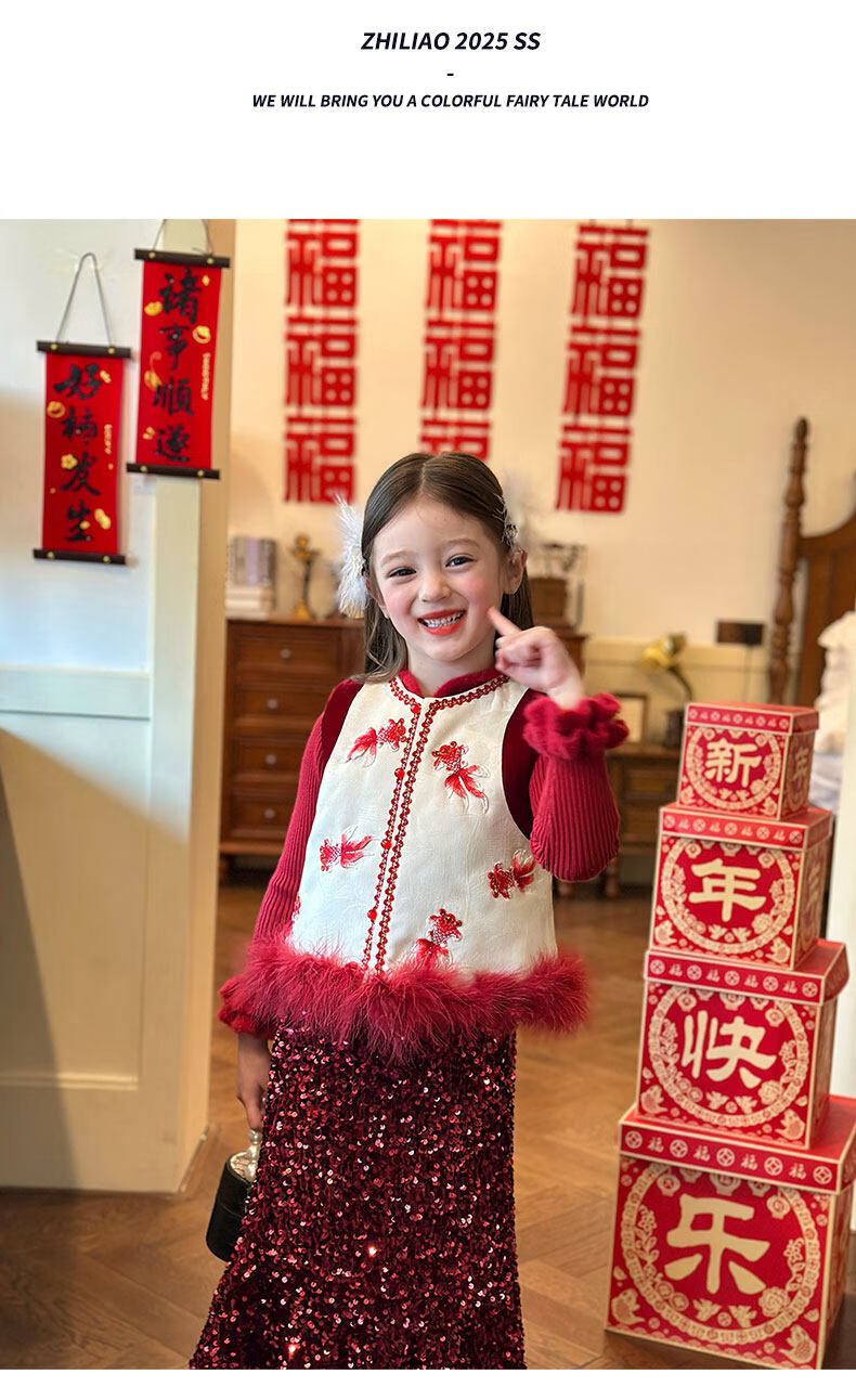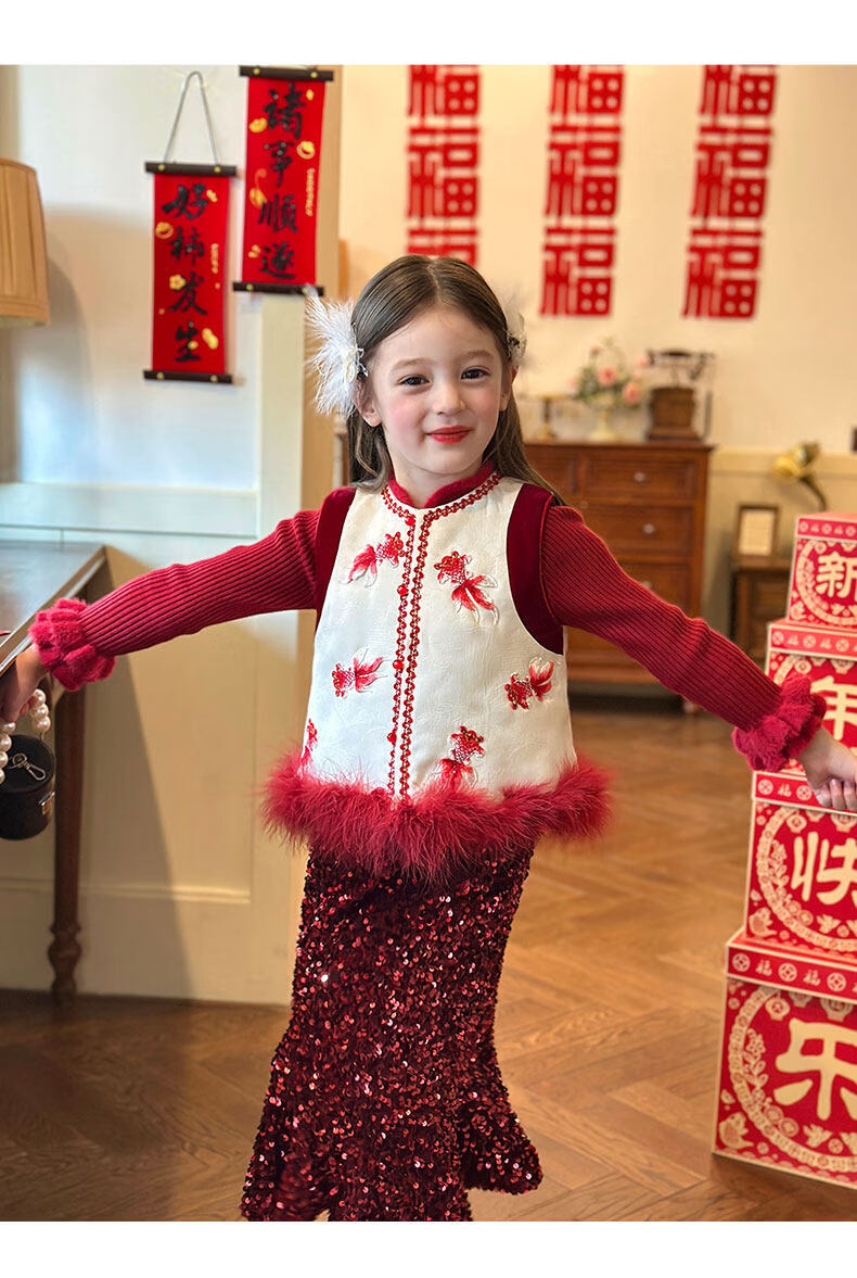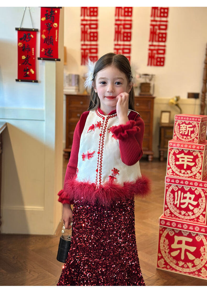 栀了成长记童装女童国风锦鲤唐装马甲2025冬季儿童新中式夹棉上衣 打底衫 120