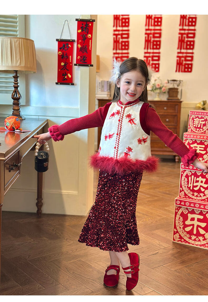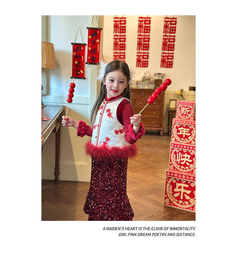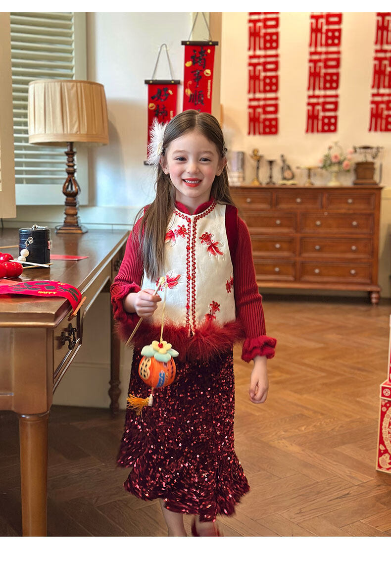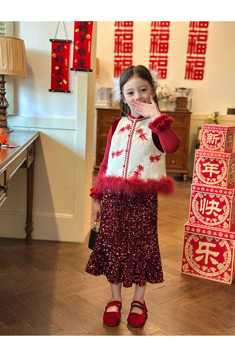 栀了成长记童装女童红色可爱亮片套装2025冬季儿童新年加绒两件套 红色 套装 100 cm