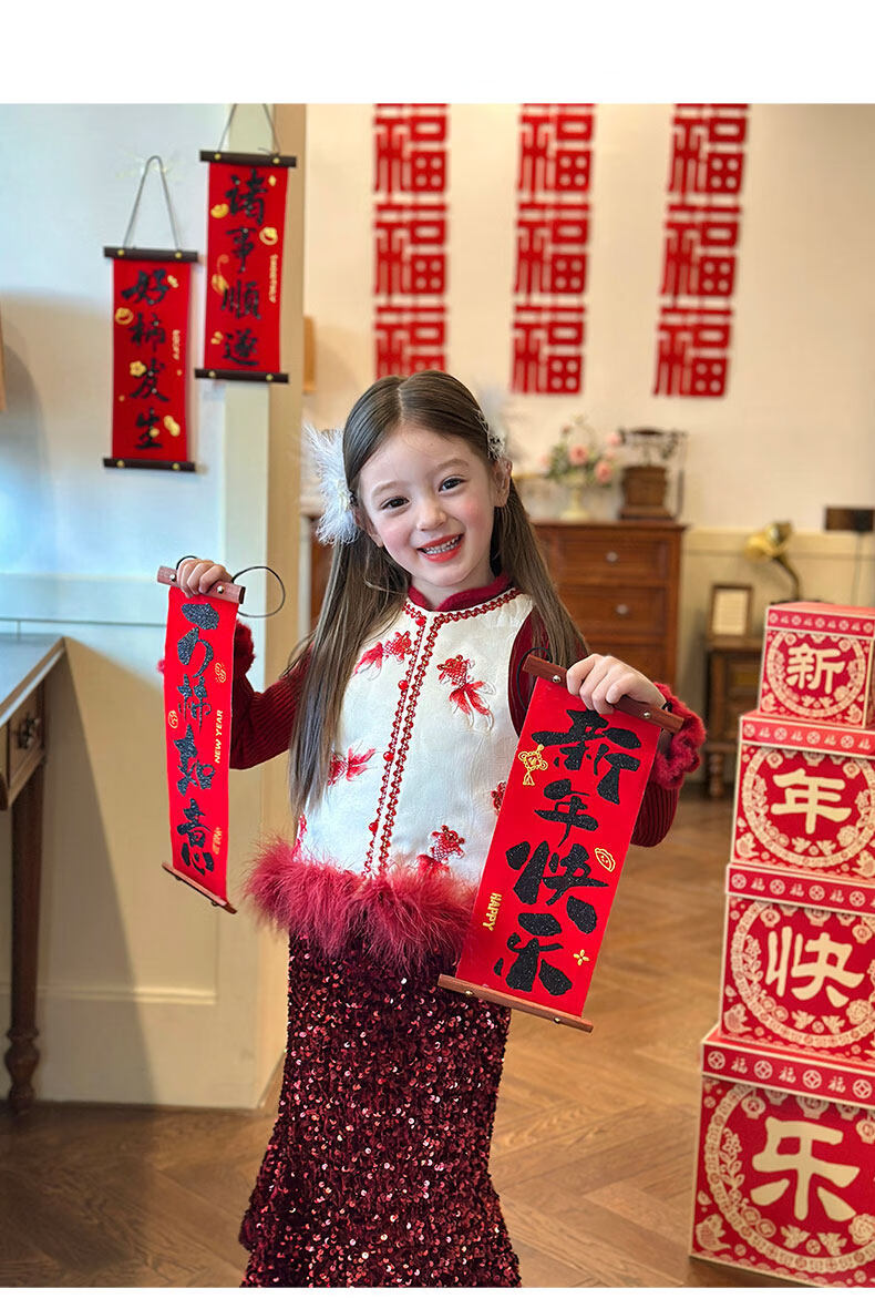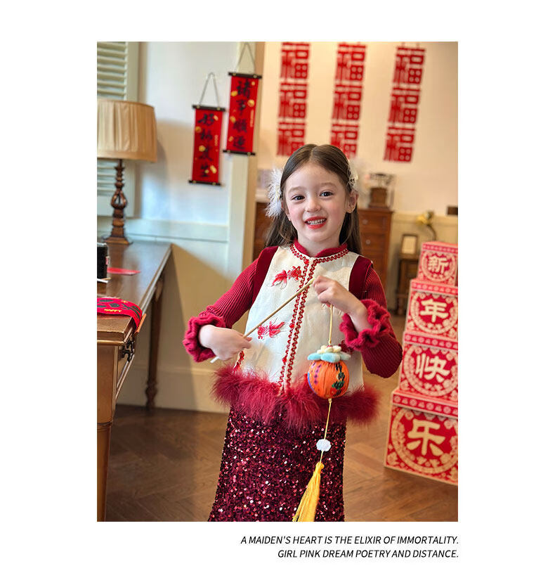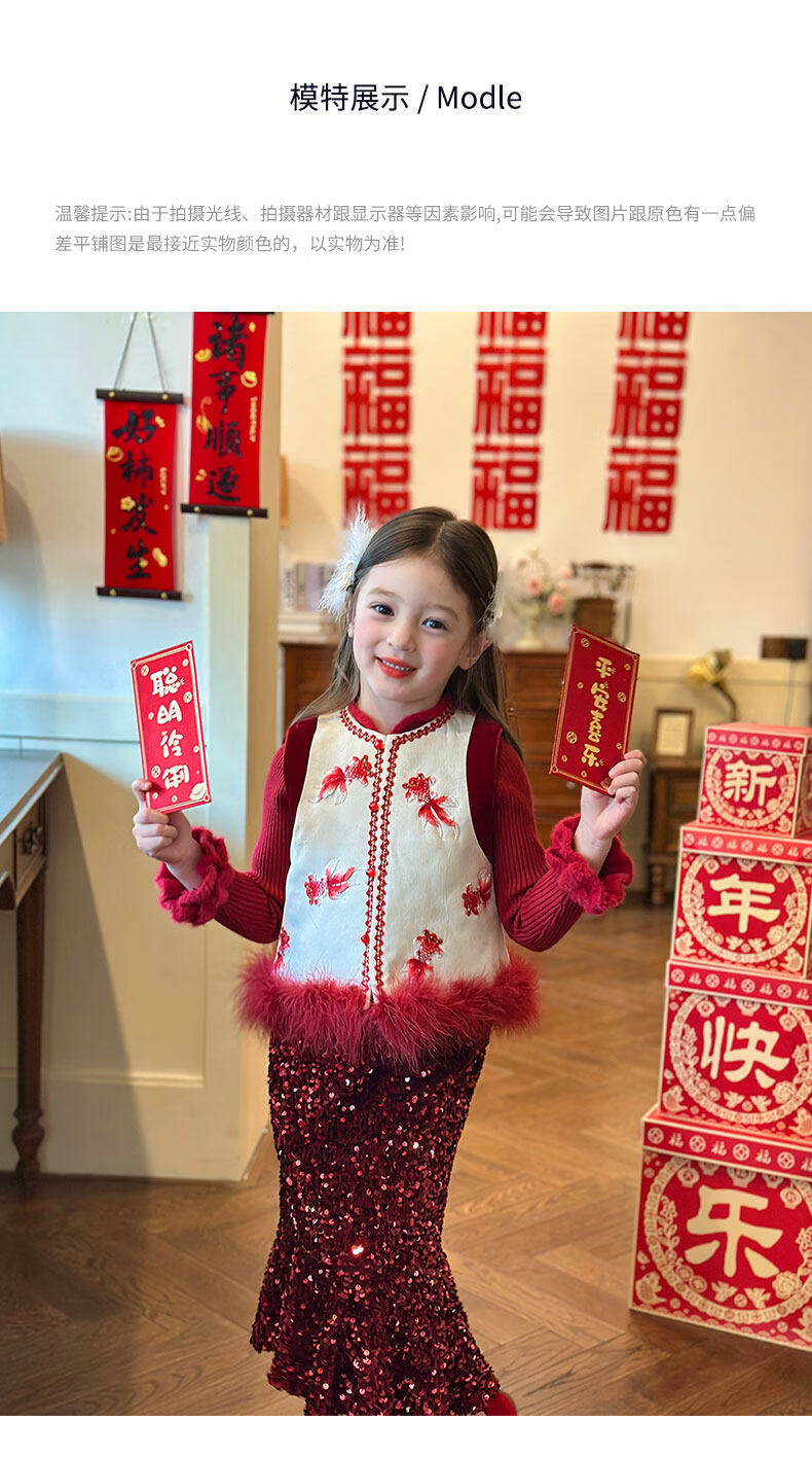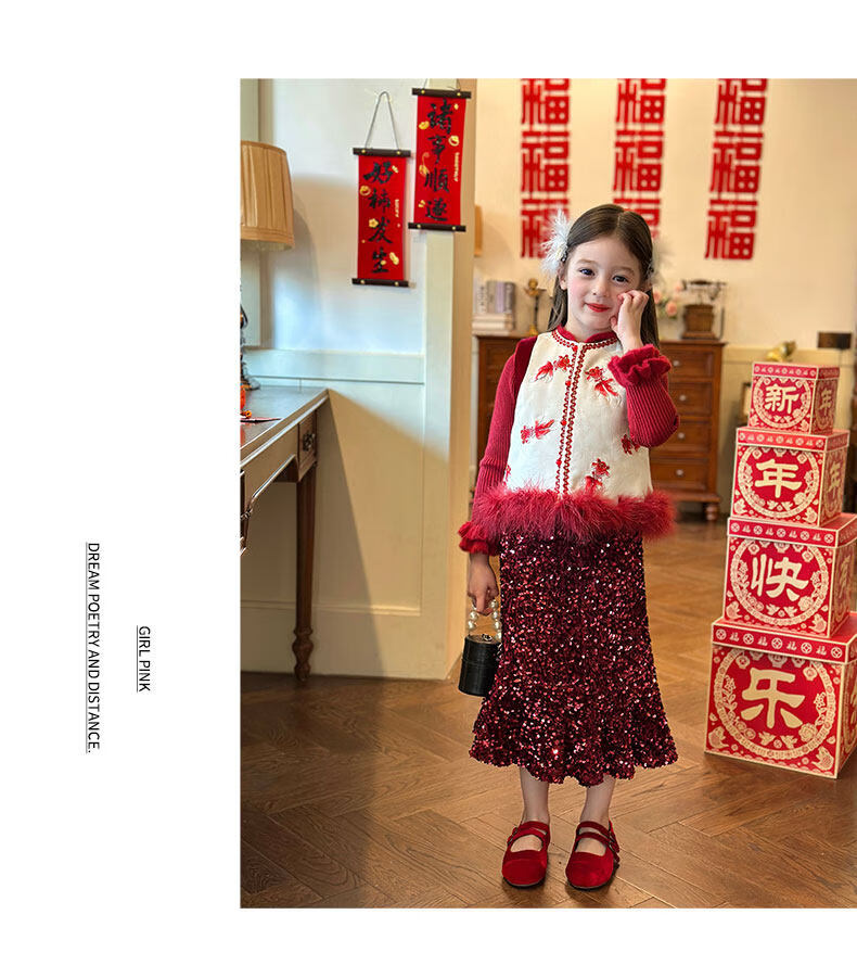 栀了成长记童装女童红色可爱亮片套装2025冬季儿童新年加绒两件套 红色 套装 100 cm