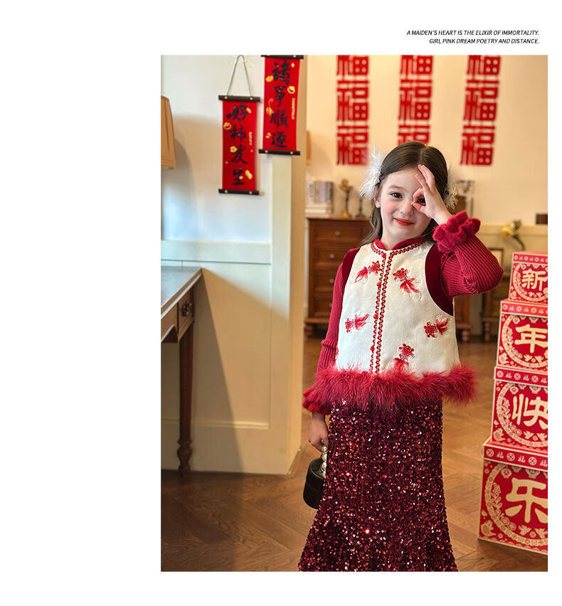 栀了成长记童装女童红色国风套装2025冬季儿童新年夹棉马甲两件套 红色 套装 100 cm