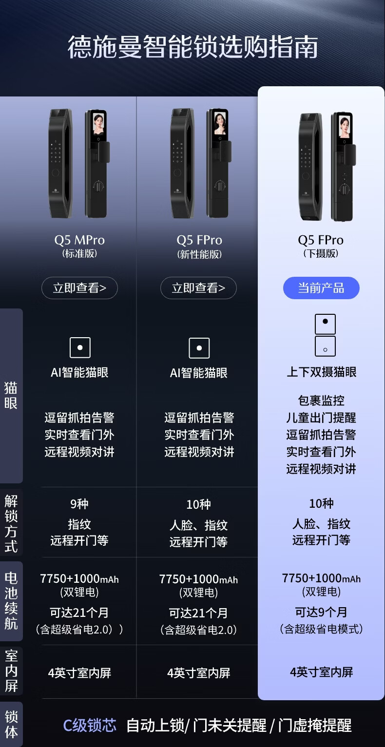 德施曼(DESMAN)智能门锁C级锁芯3D人脸大屏指纹大圣Q5FPro(下摄版)一价全包