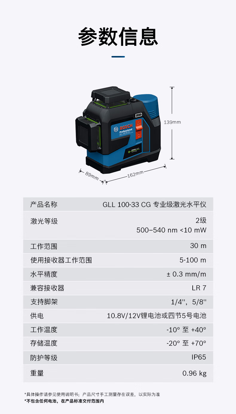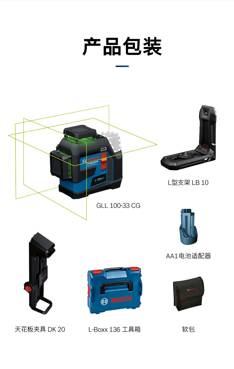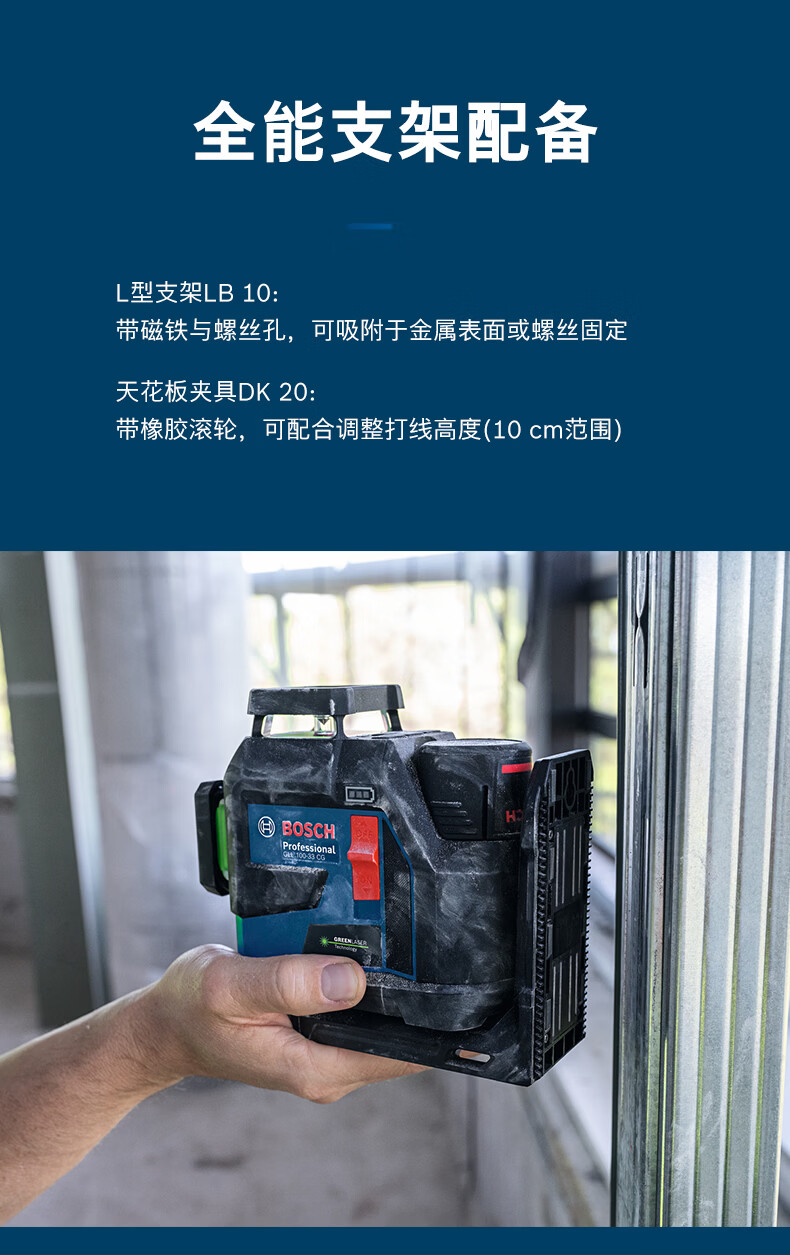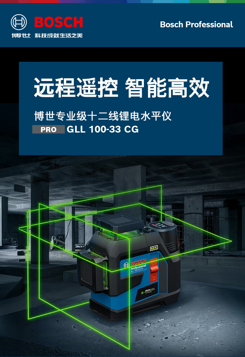 博世(BOSCH)GLL 100-33 CG专业级水平仪十二线锂电绿光防尘遥控激光标线仪 十二线水平仪(送支架、夹具)