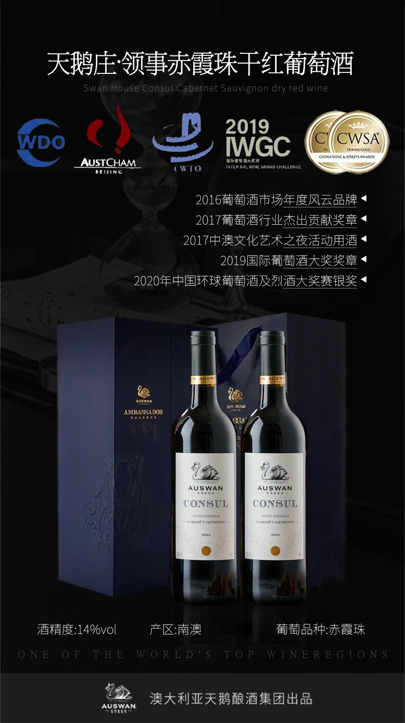 天鹅庄澳大利亚原瓶进口红酒赤霞珠干红葡萄酒 750ML送礼礼物 领事赤霞珠 750ML*2瓶