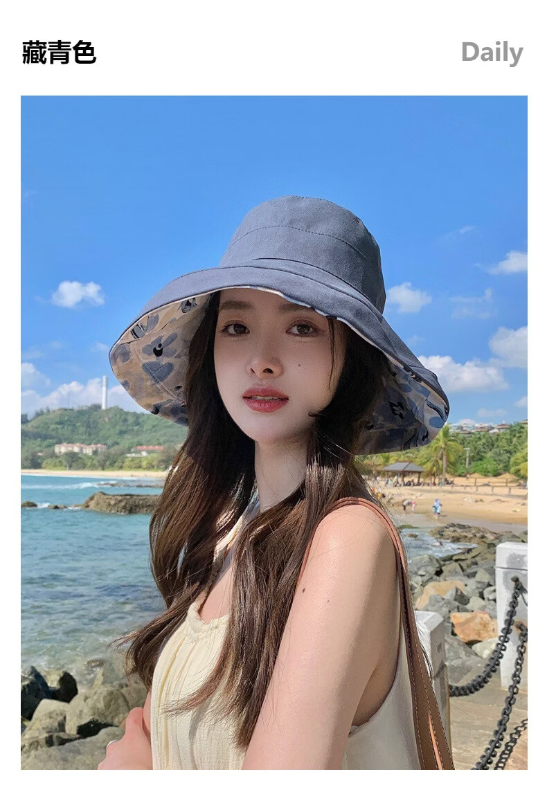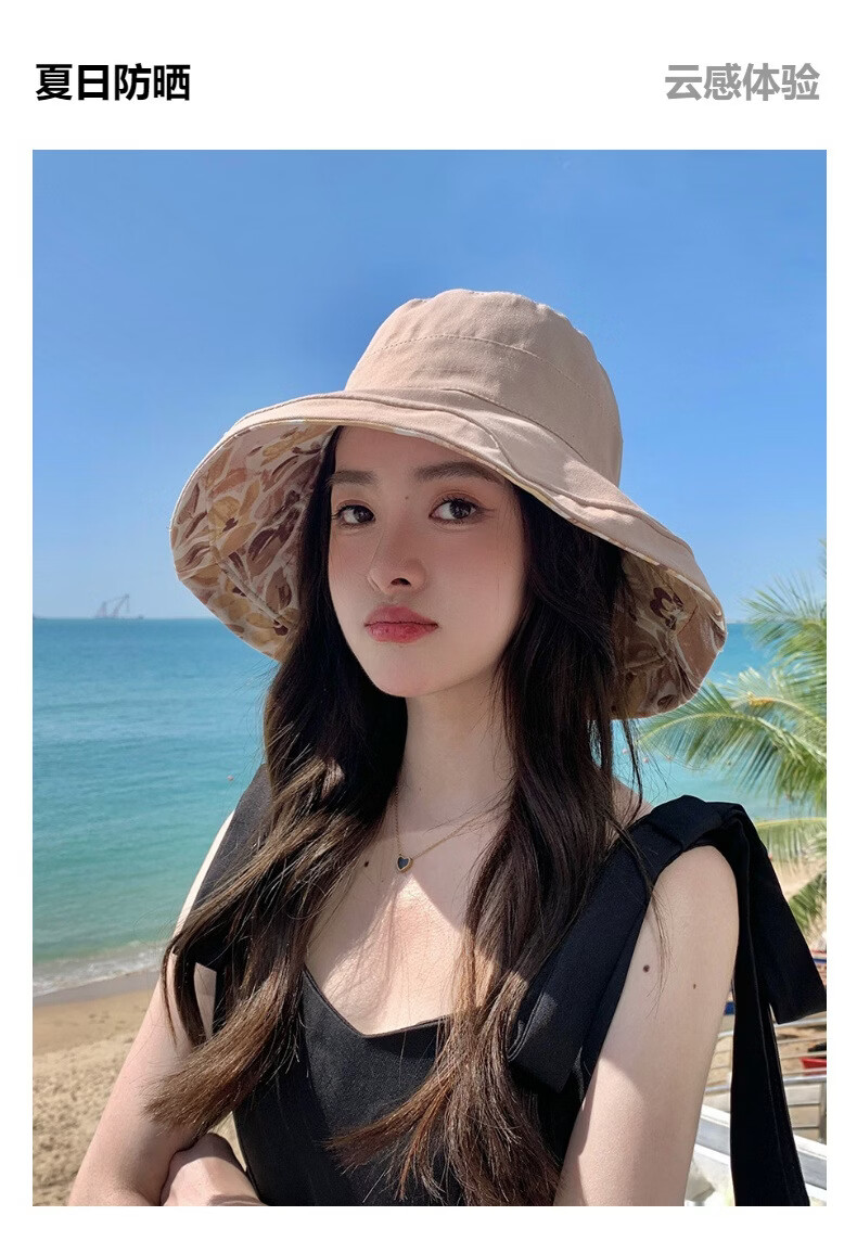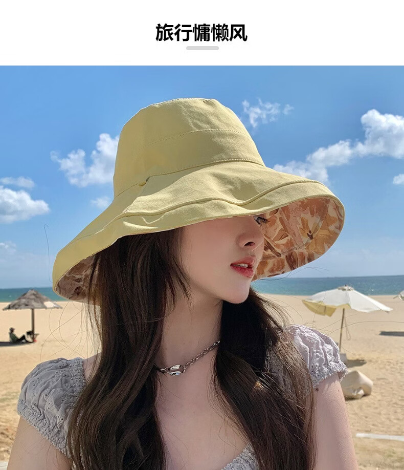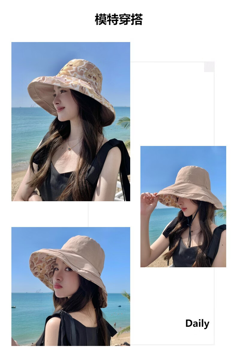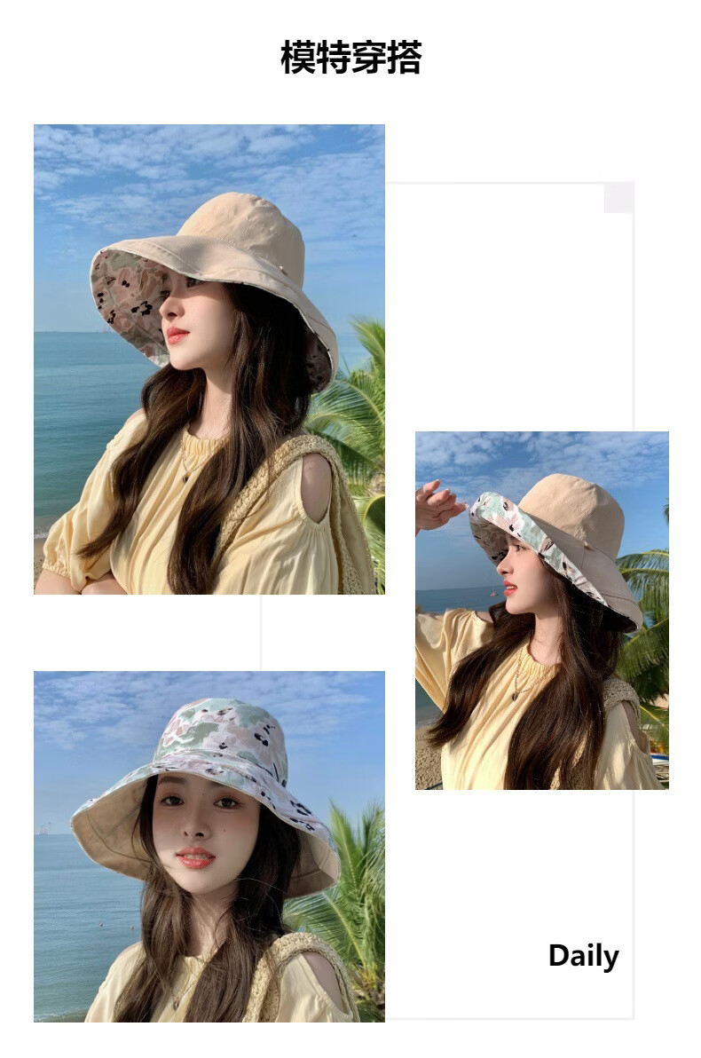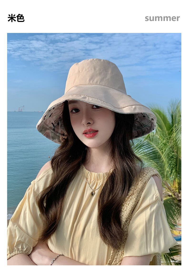 猫人棉双面遮阳渔夫帽女防晒春秋夏季户外出游遮脸大沿太阳帽子可折叠 米色 均码(56-58cm)