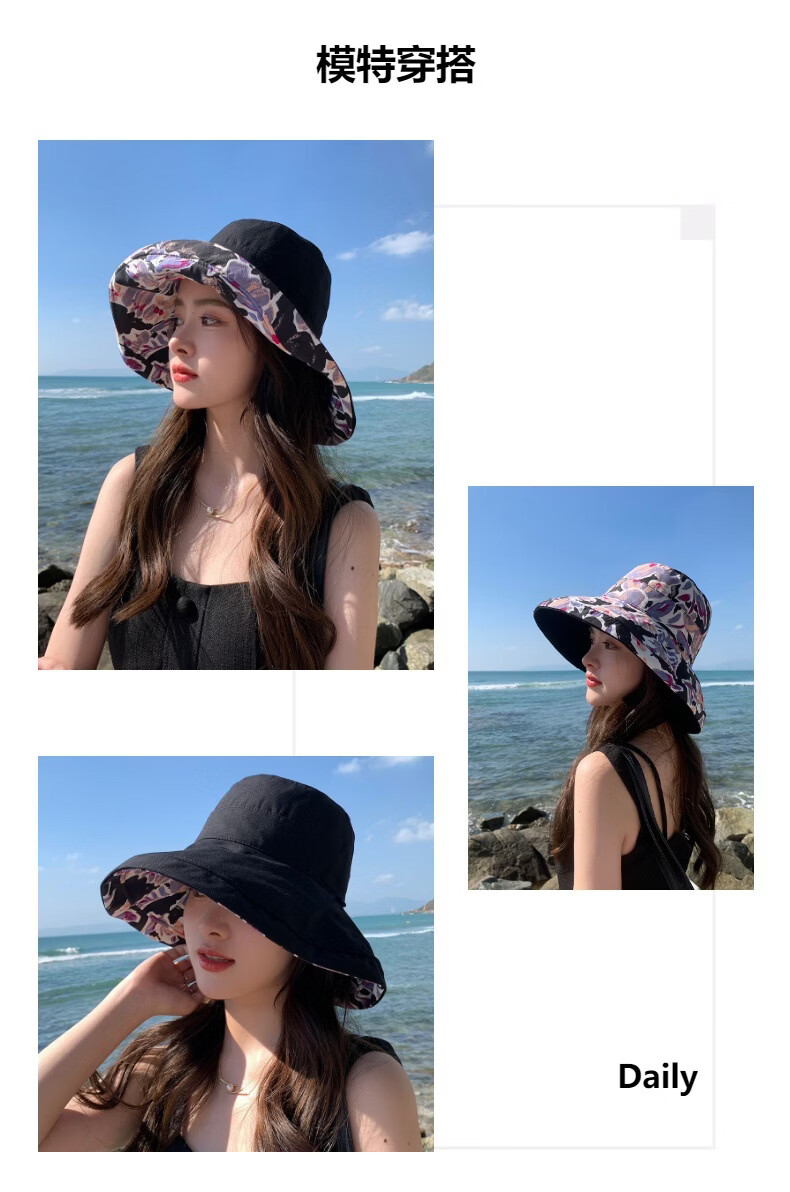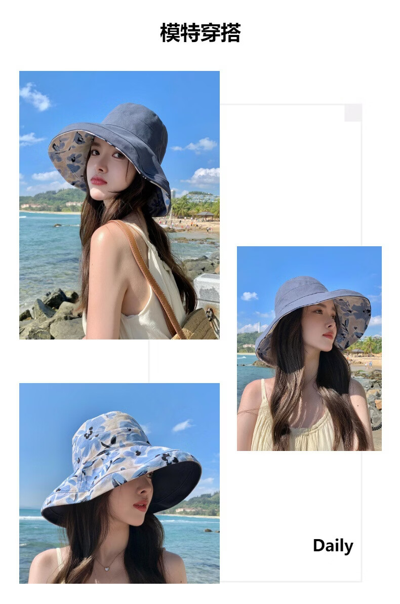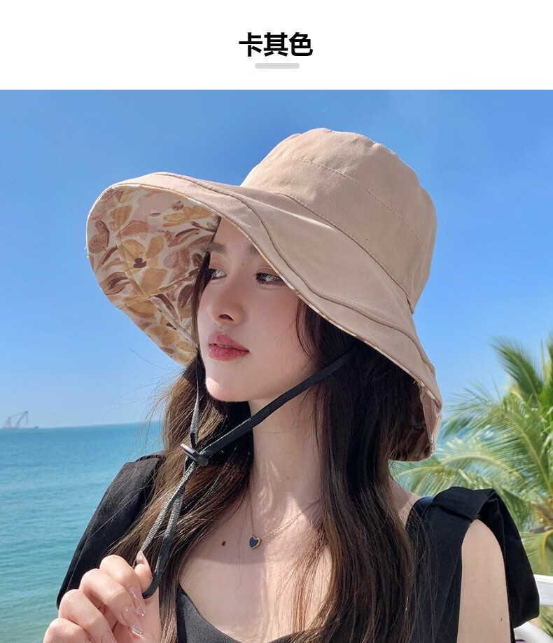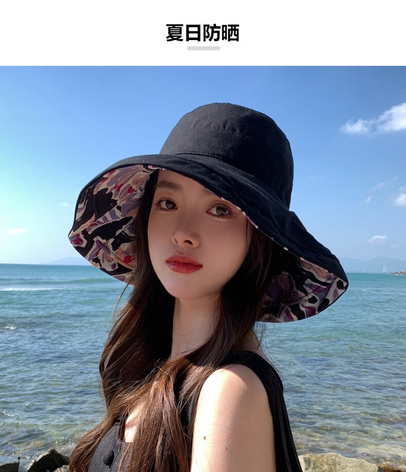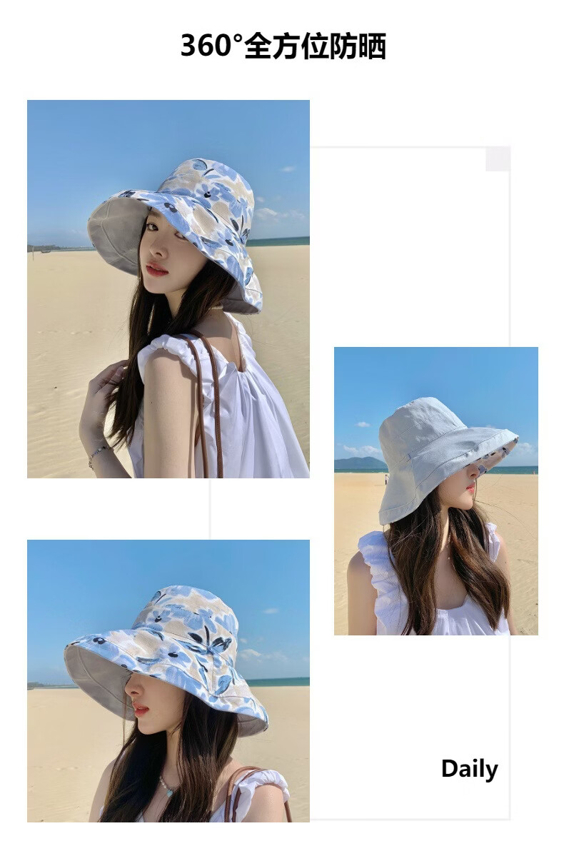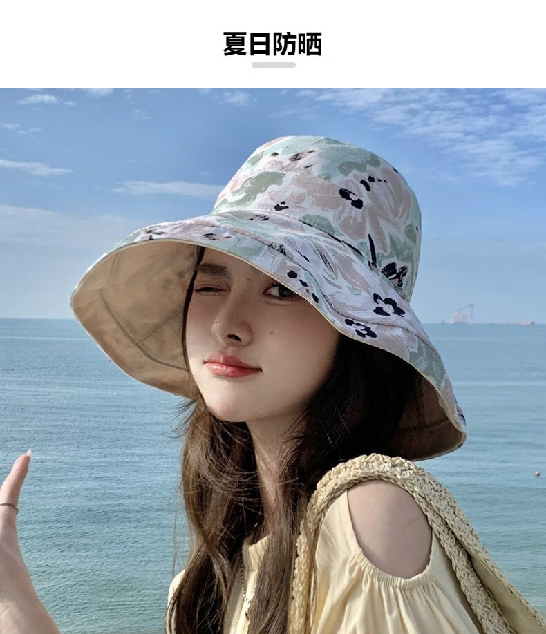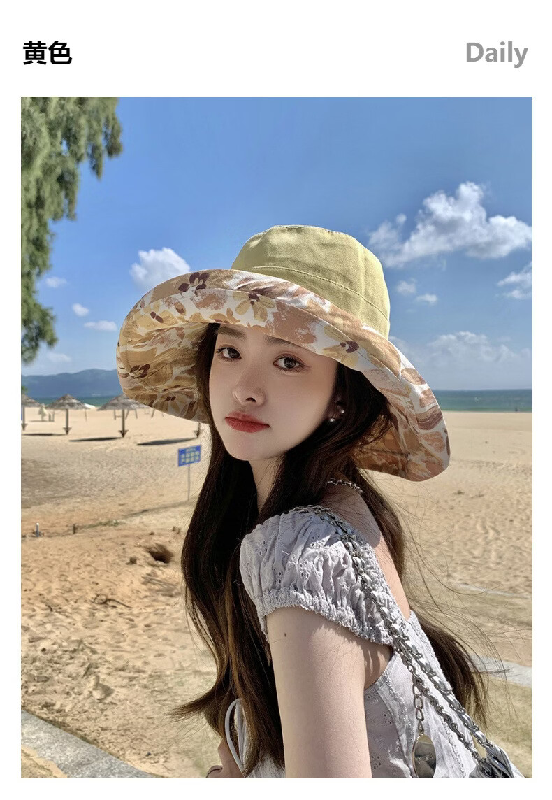 猫人棉双面遮阳渔夫帽女防晒春秋夏季户外出游遮脸大沿太阳帽子可折叠 米色 均码(56-58cm)