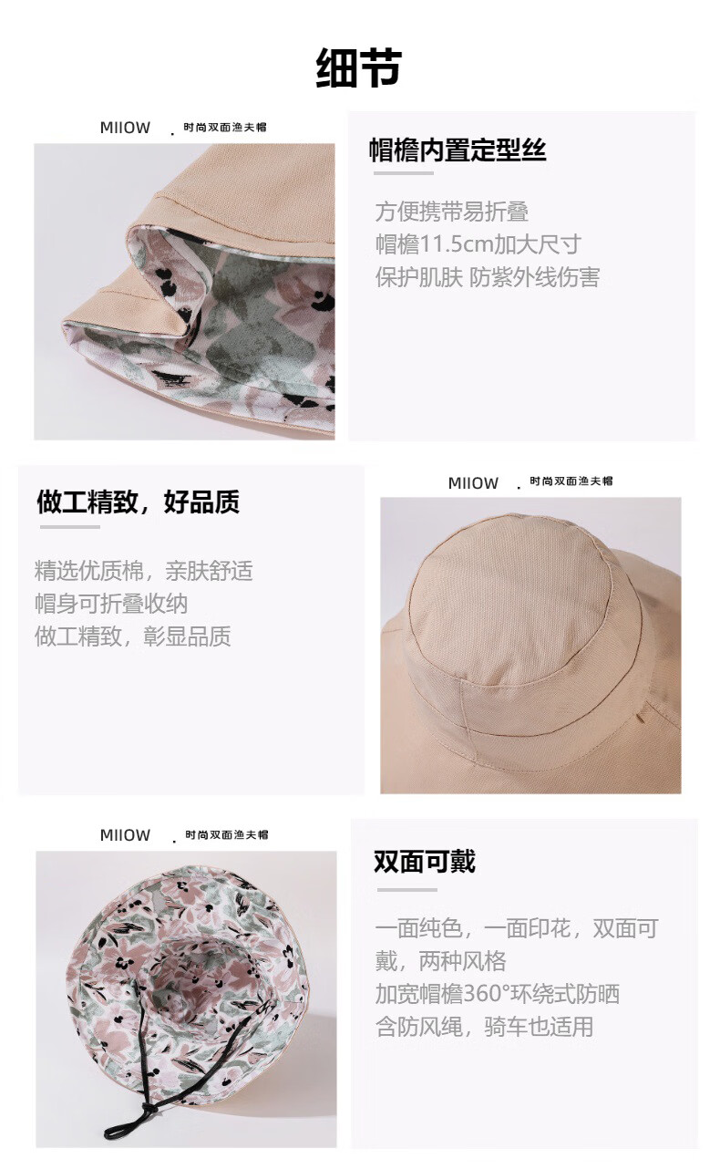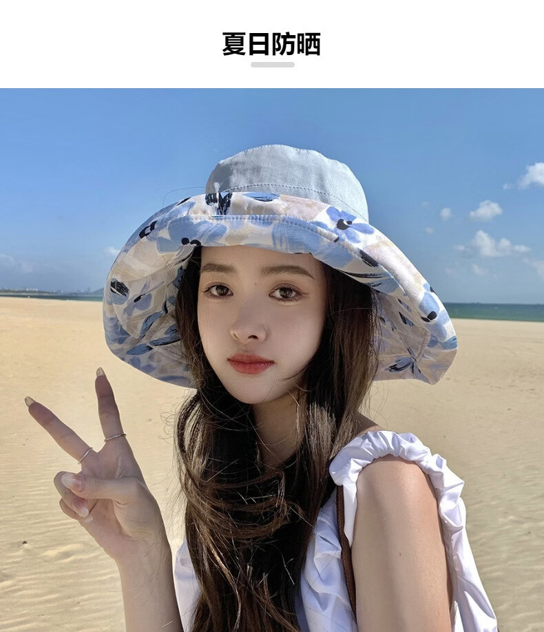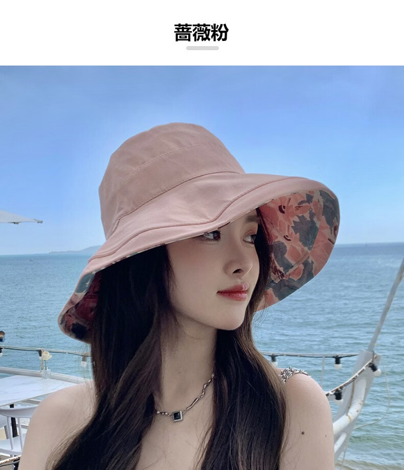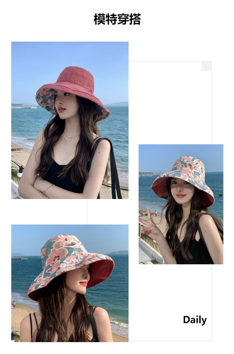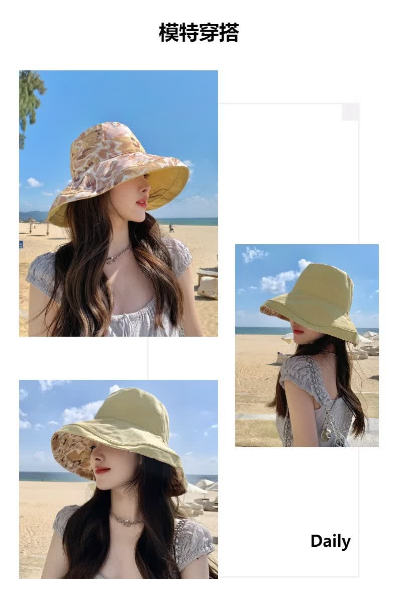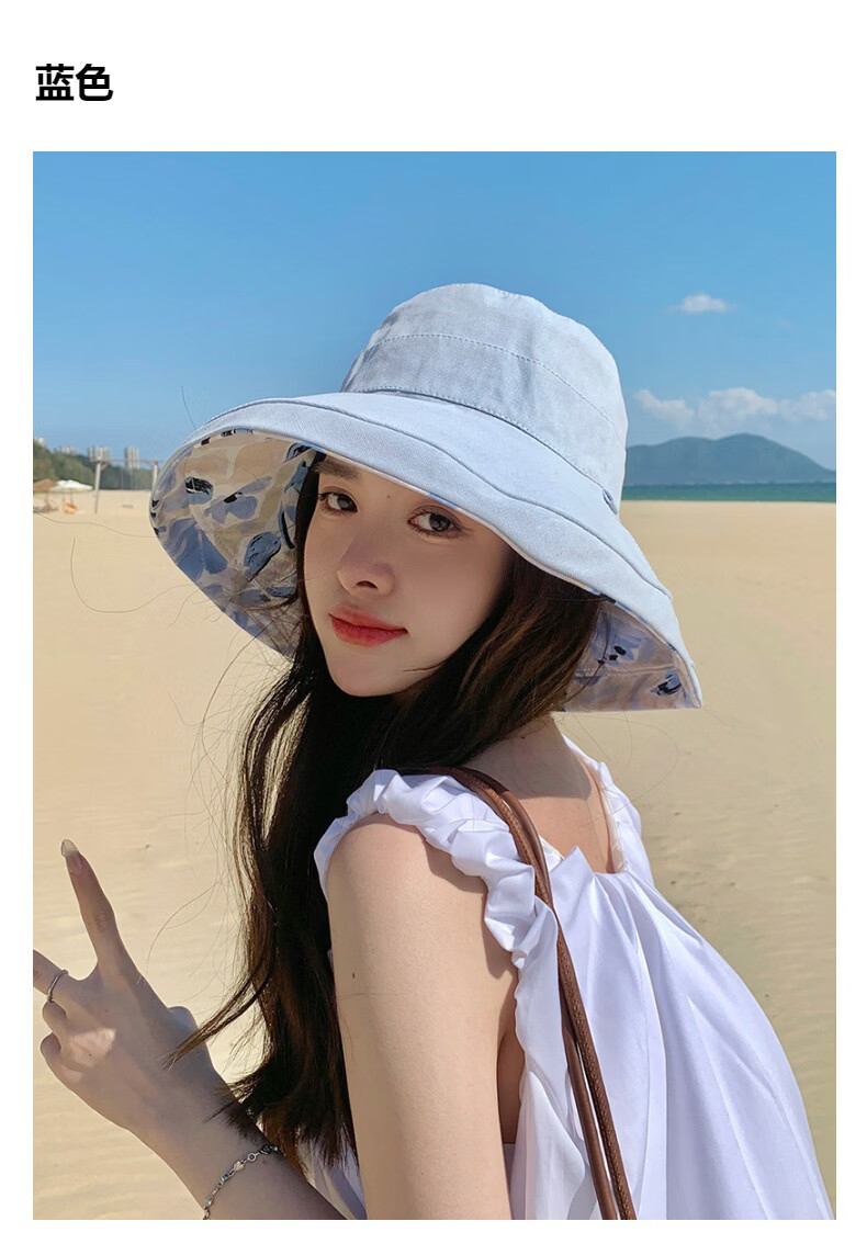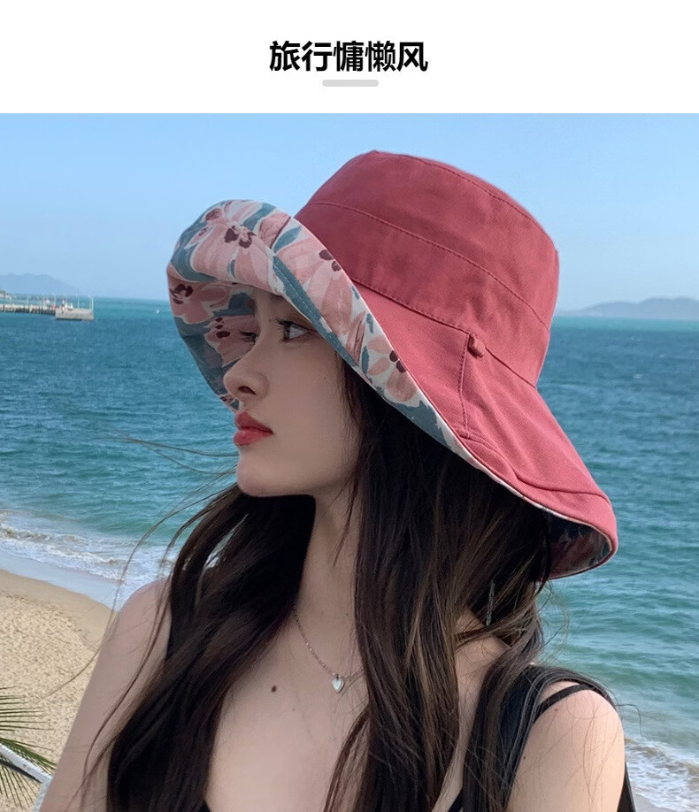 猫人棉双面遮阳渔夫帽女防晒春秋夏季户外出游遮脸大沿太阳帽子可折叠 米色 均码(56-58cm)