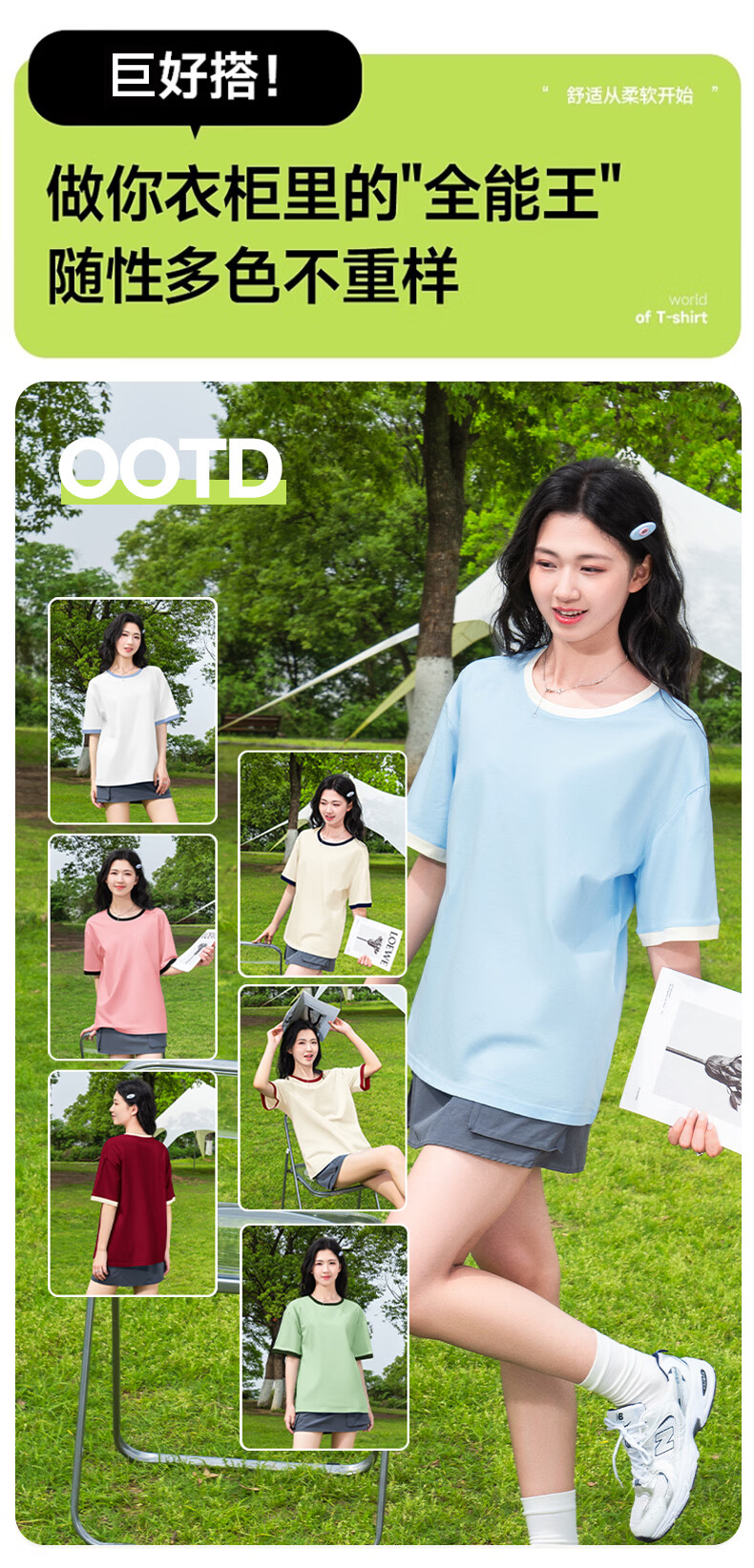 真维斯(Jeanswest)撞色纯棉短袖女士t恤2026新款夏季女装宽松百搭半袖T显瘦体恤上衣 天蓝 动物齐聚会 S