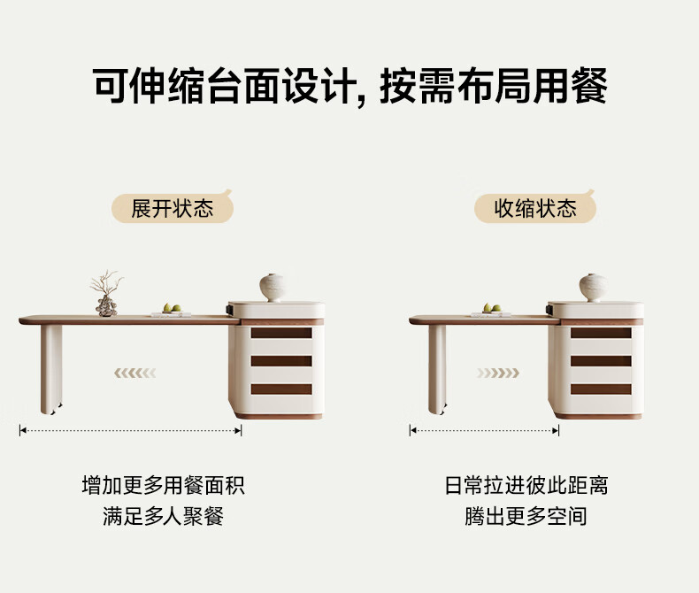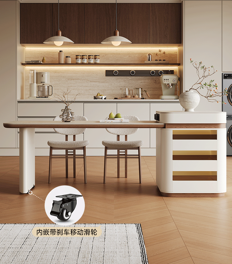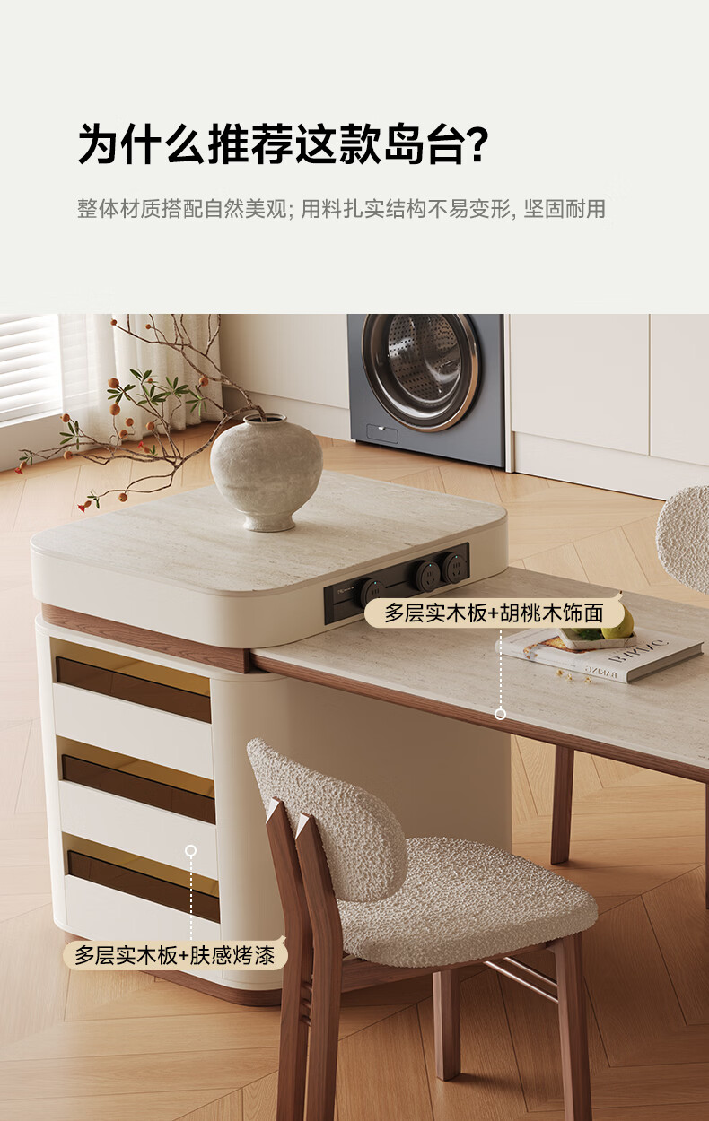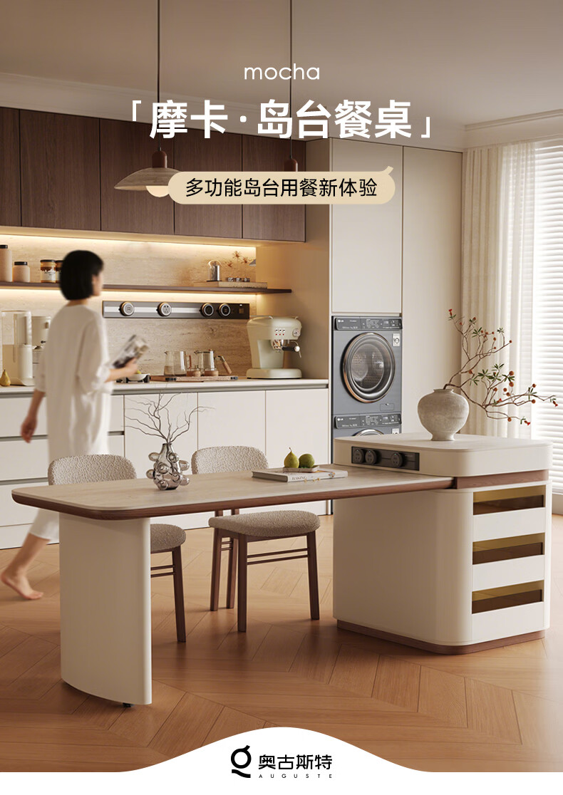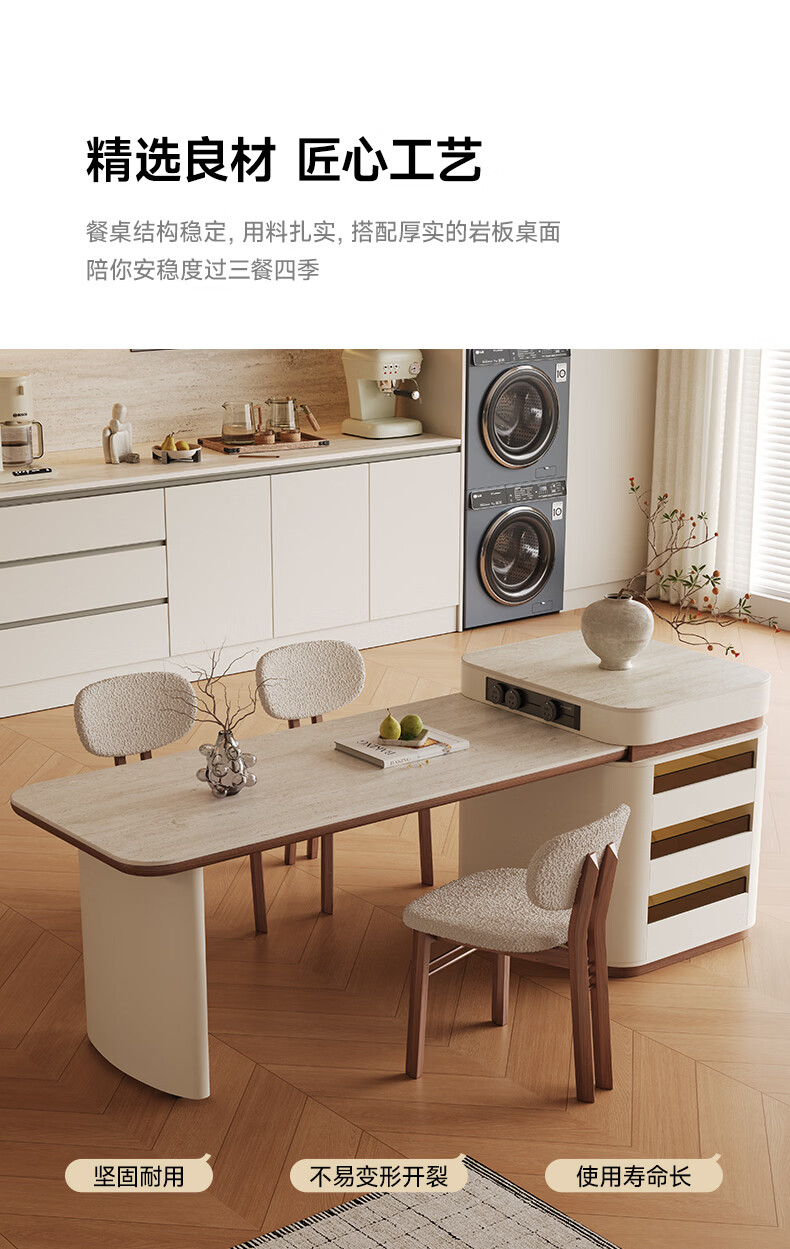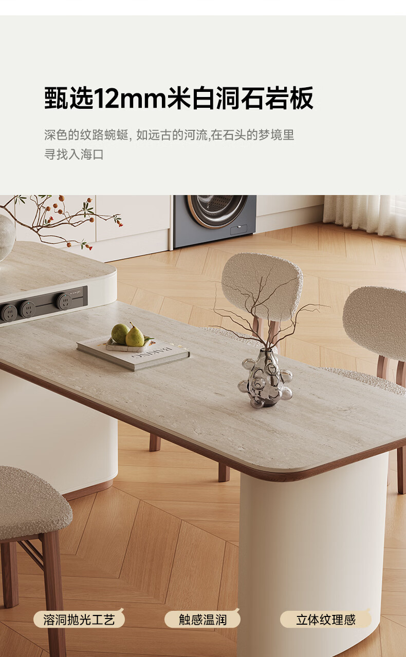 AUGUSTE奥古斯特2026新款中古奶油现代家用小户型伸缩洞石岩板岛台餐桌 设计师餐椅*2