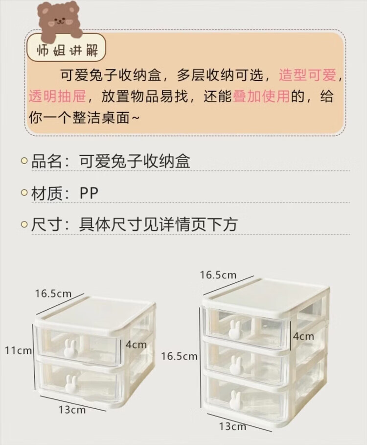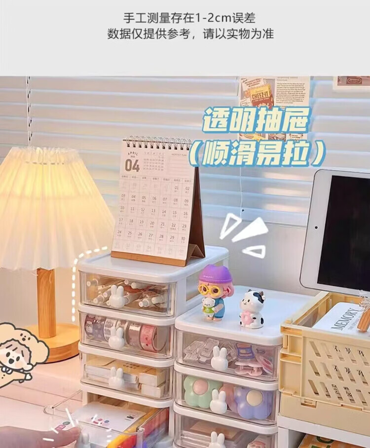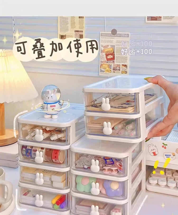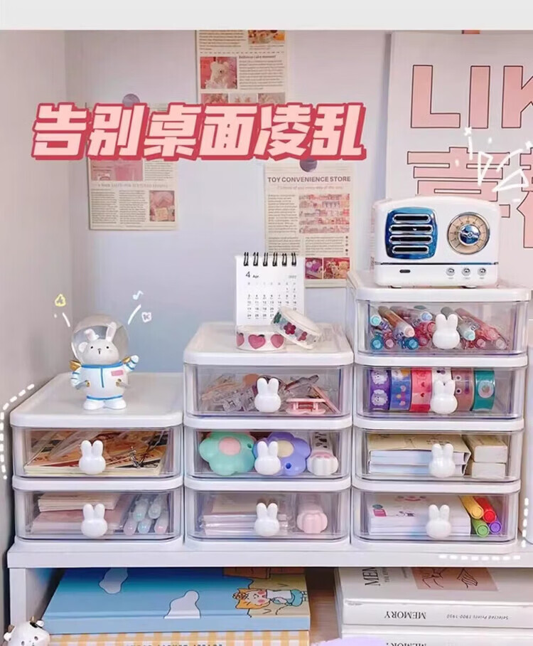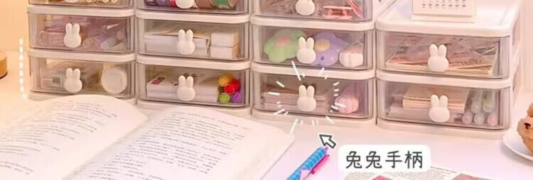 洋臣收纳卡通桌面盒透明小抽屉式书桌塑料迷你储物盒兔子文具整理盒 桌面收纳3层1套【颜色随机发货】