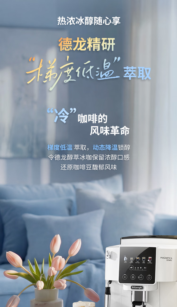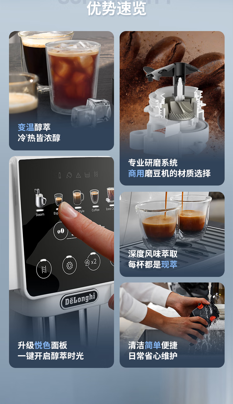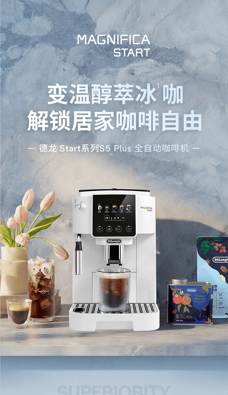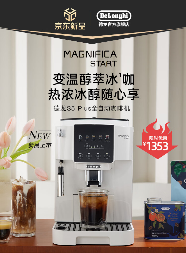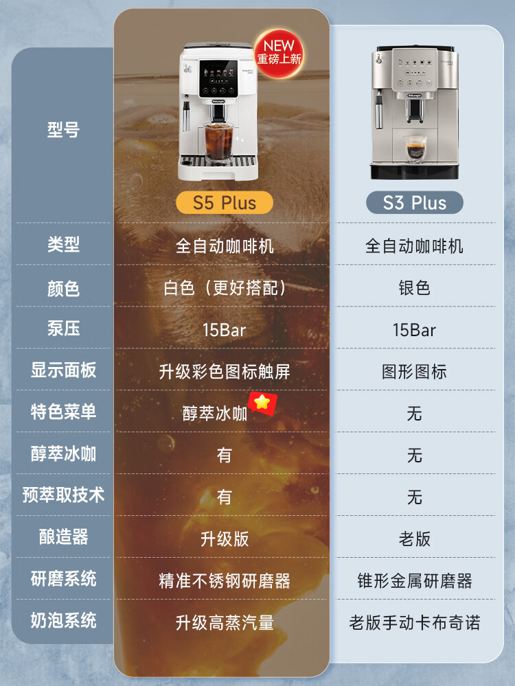 德龙(Delonghi)咖啡机意式家用全自动13档研磨一体机美式现磨豆粉一键萃取醇萃冰咖手动奶泡系统S3升级版 S5 Plus 彩色图标触控操作多款咖啡菜单1.8L大容量水箱