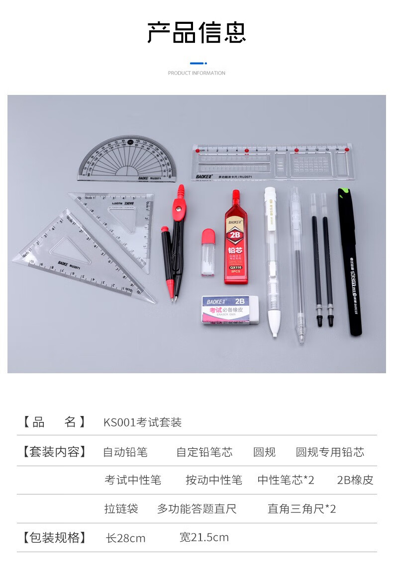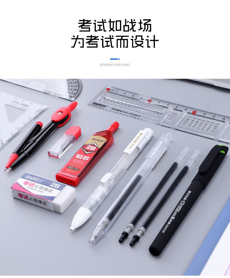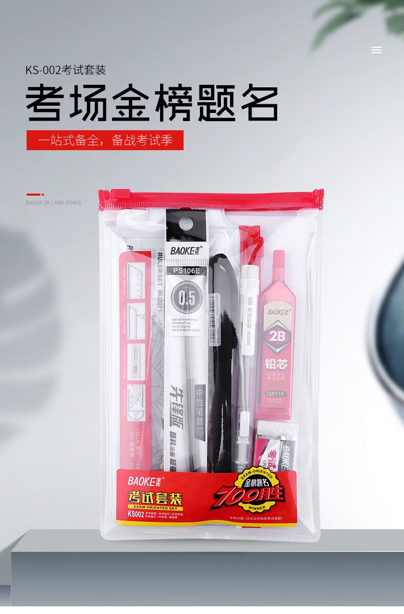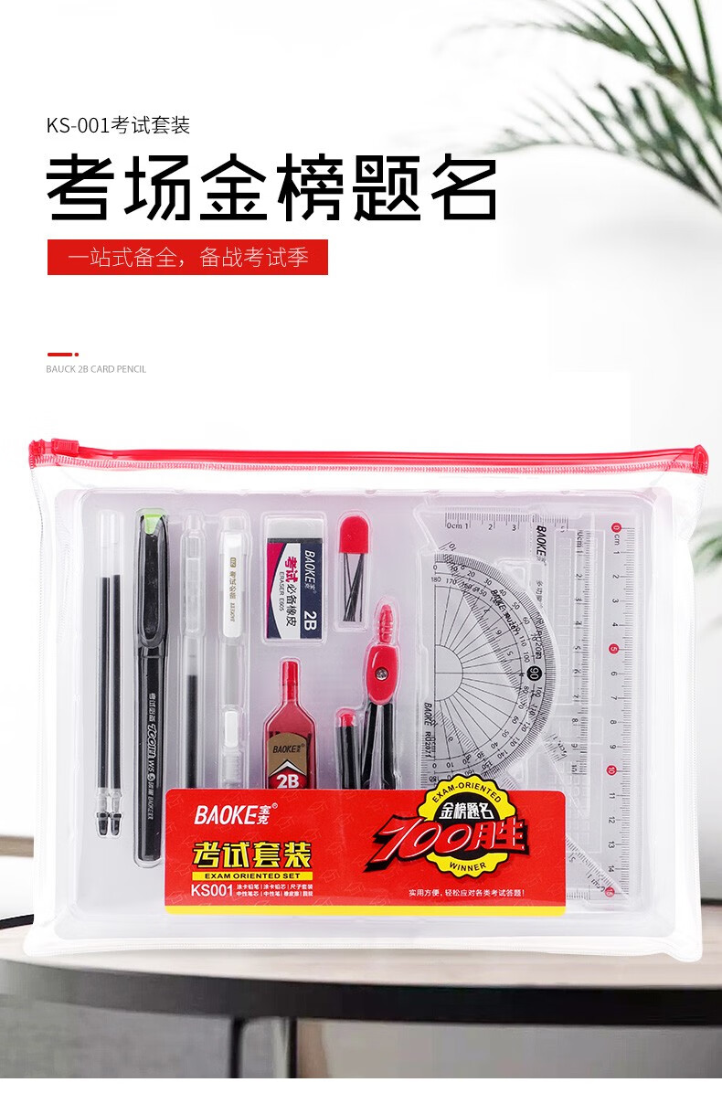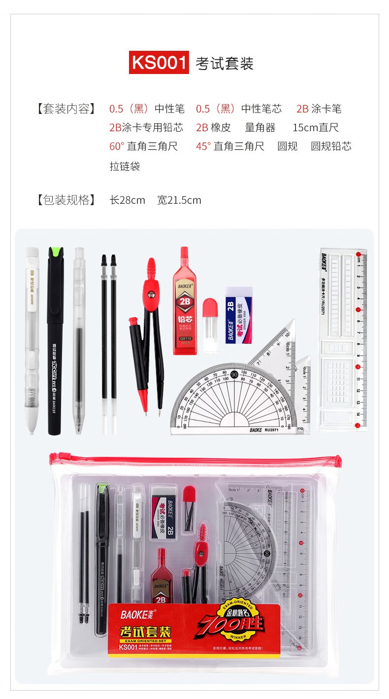 宝克(BAOKE)考试专用套装 金榜题名考试套装 考研中高考文具套装 公务员研究生四六级国考省考 KS001【套尺+笔+涂卡铅笔+笔芯+橡皮+圆规】 包邮