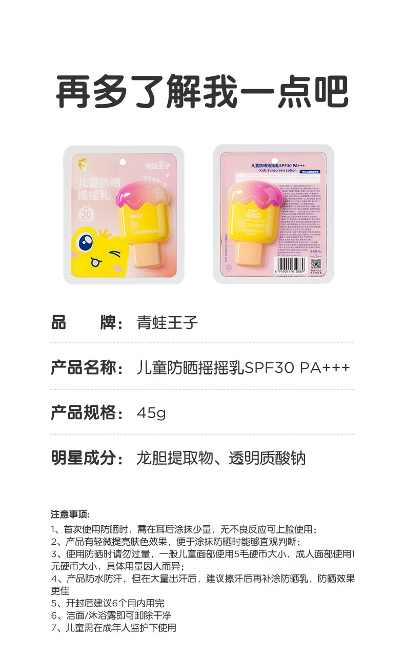 青蛙王子儿童防晒乳防晒霜 宝宝户外军训物理防晒SPF30 45g