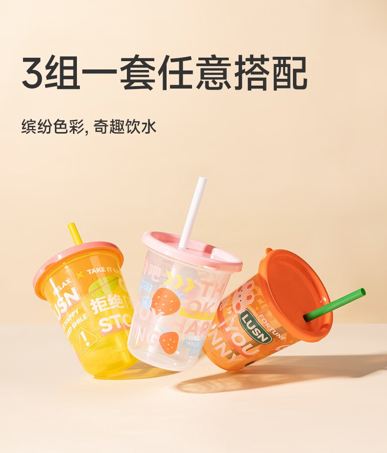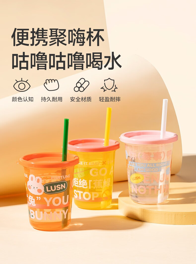 LUSN聚嗨杯奶茶吸管杯子家用重复使用宝宝牛奶儿童饮料杯塑料水杯 3个装-聚嗨杯PP材质-蓝紫绿 320ml 320毫升