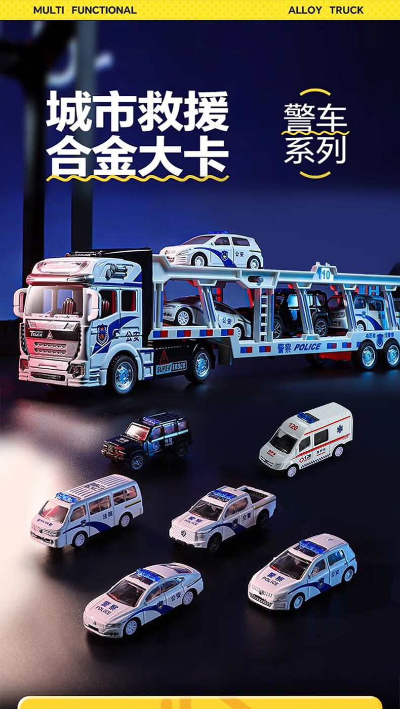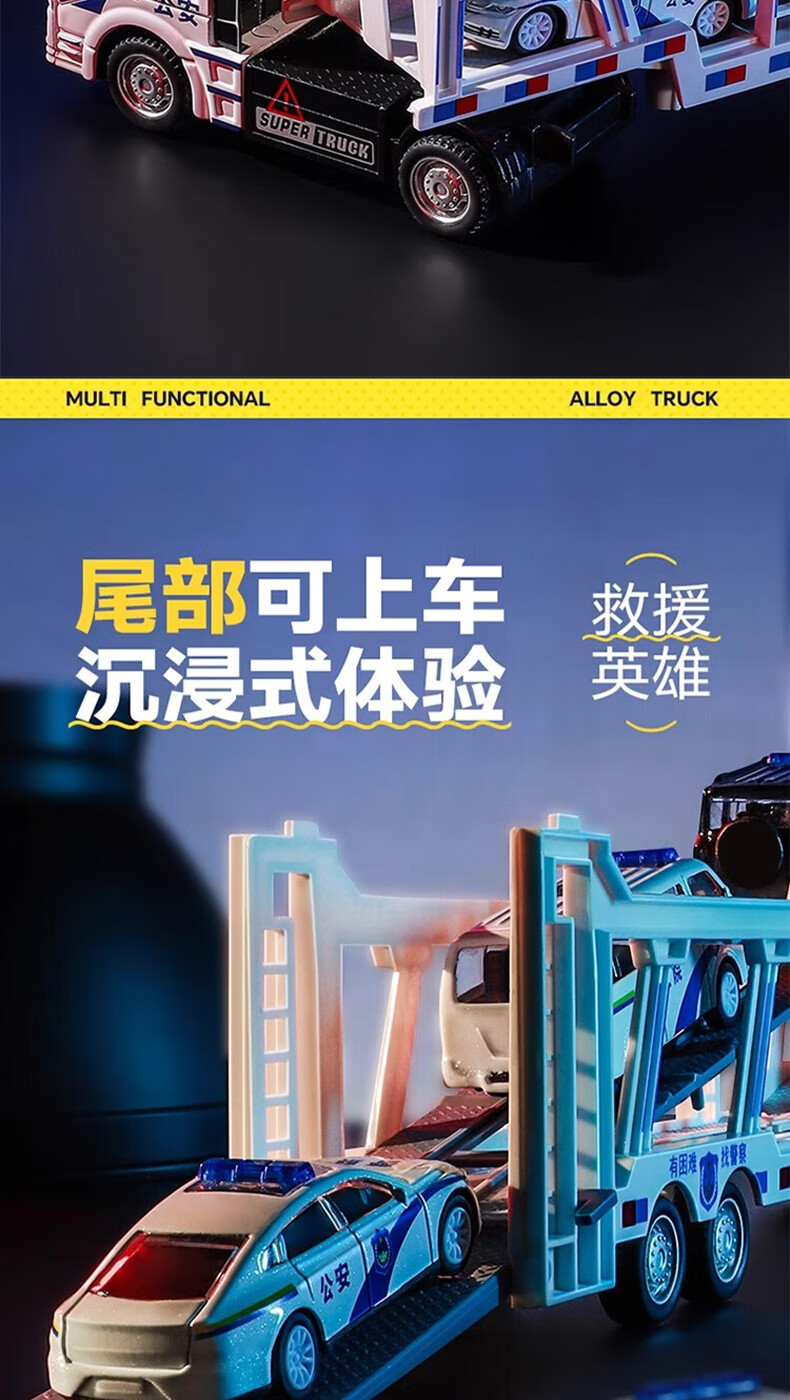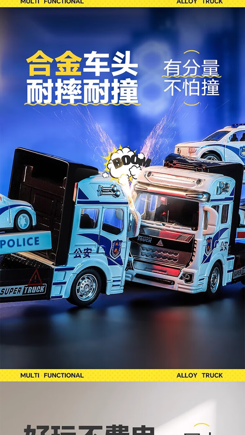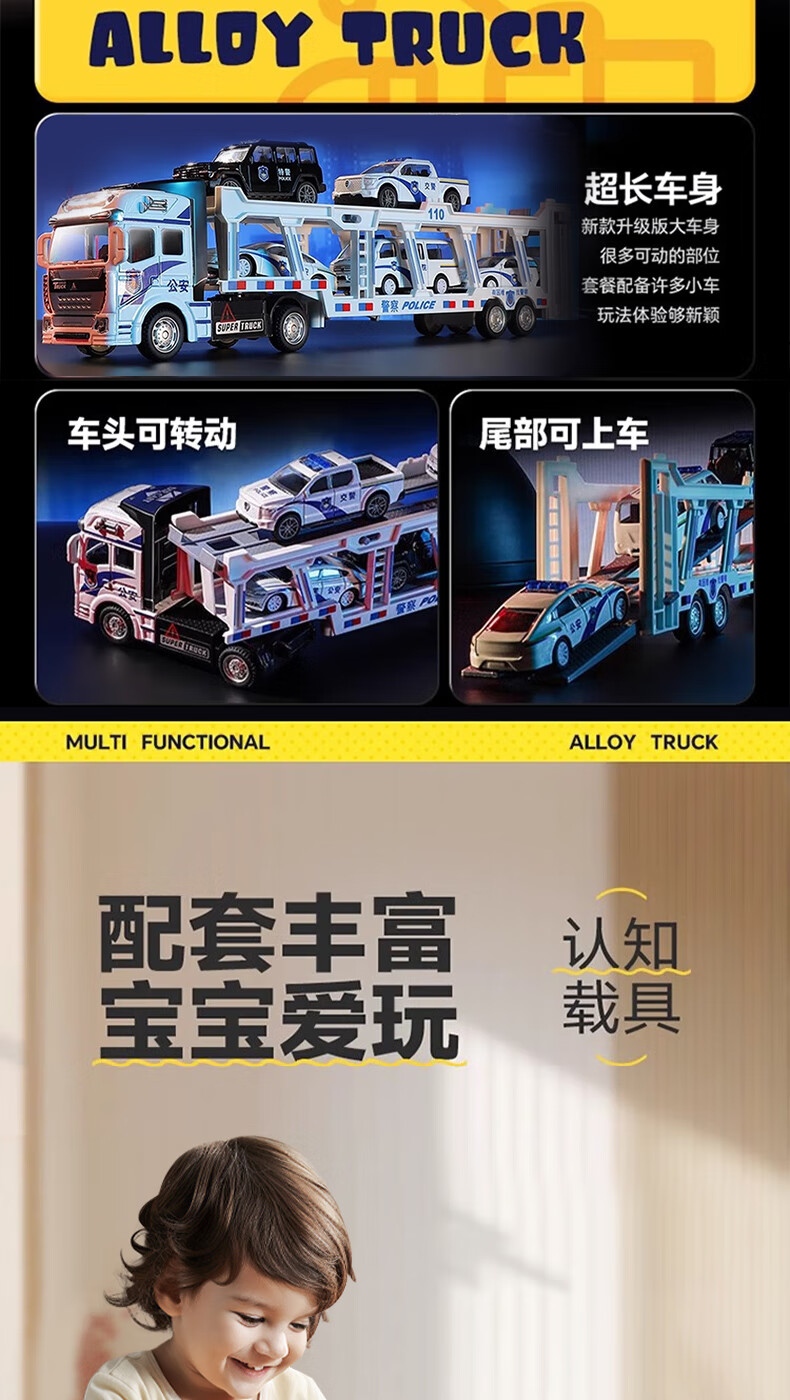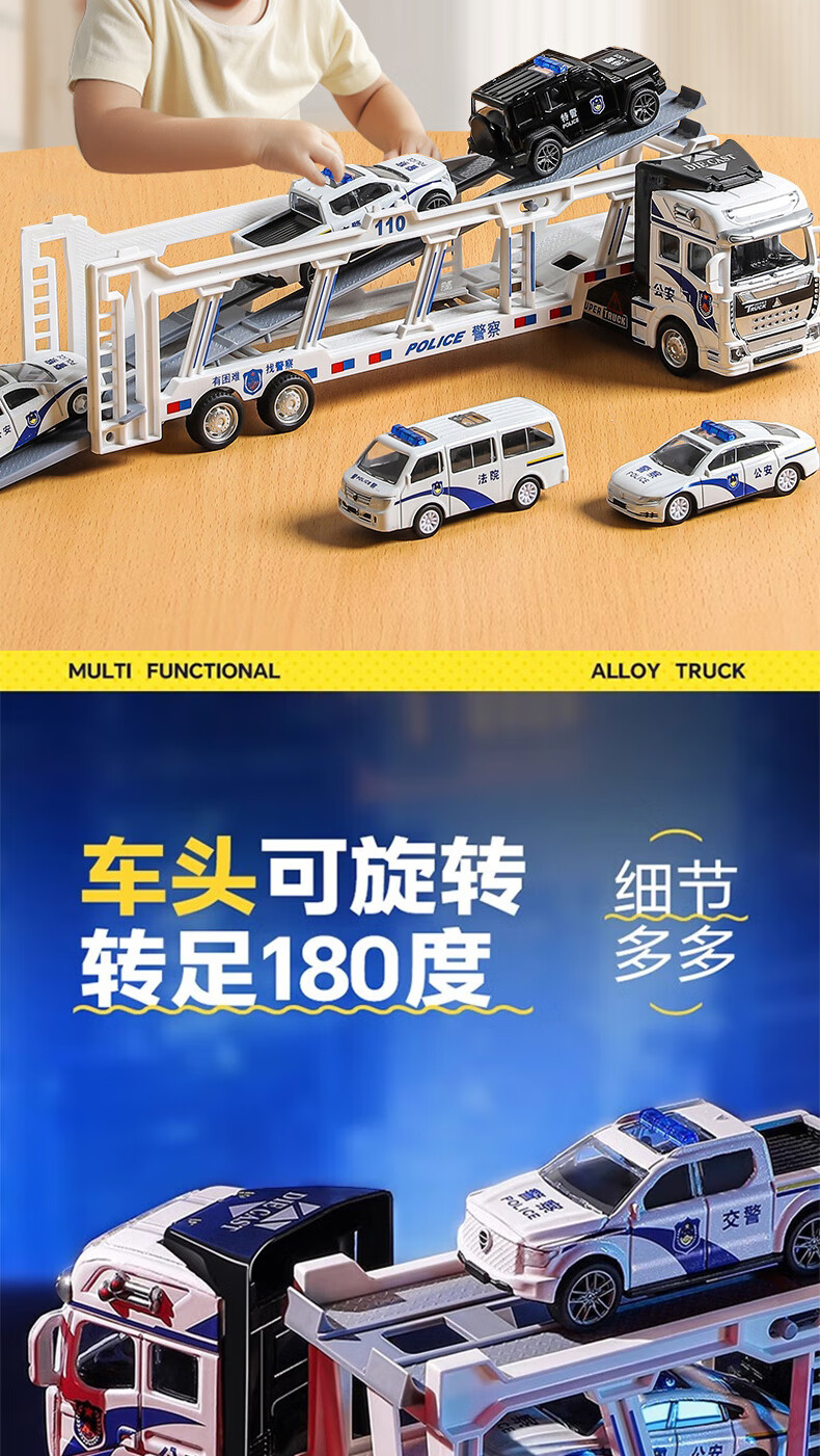 康迪拉家族儿童玩具男孩3-6岁双层加长合金警车运输汽车模型生日新年礼物