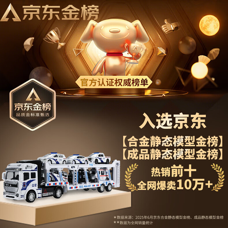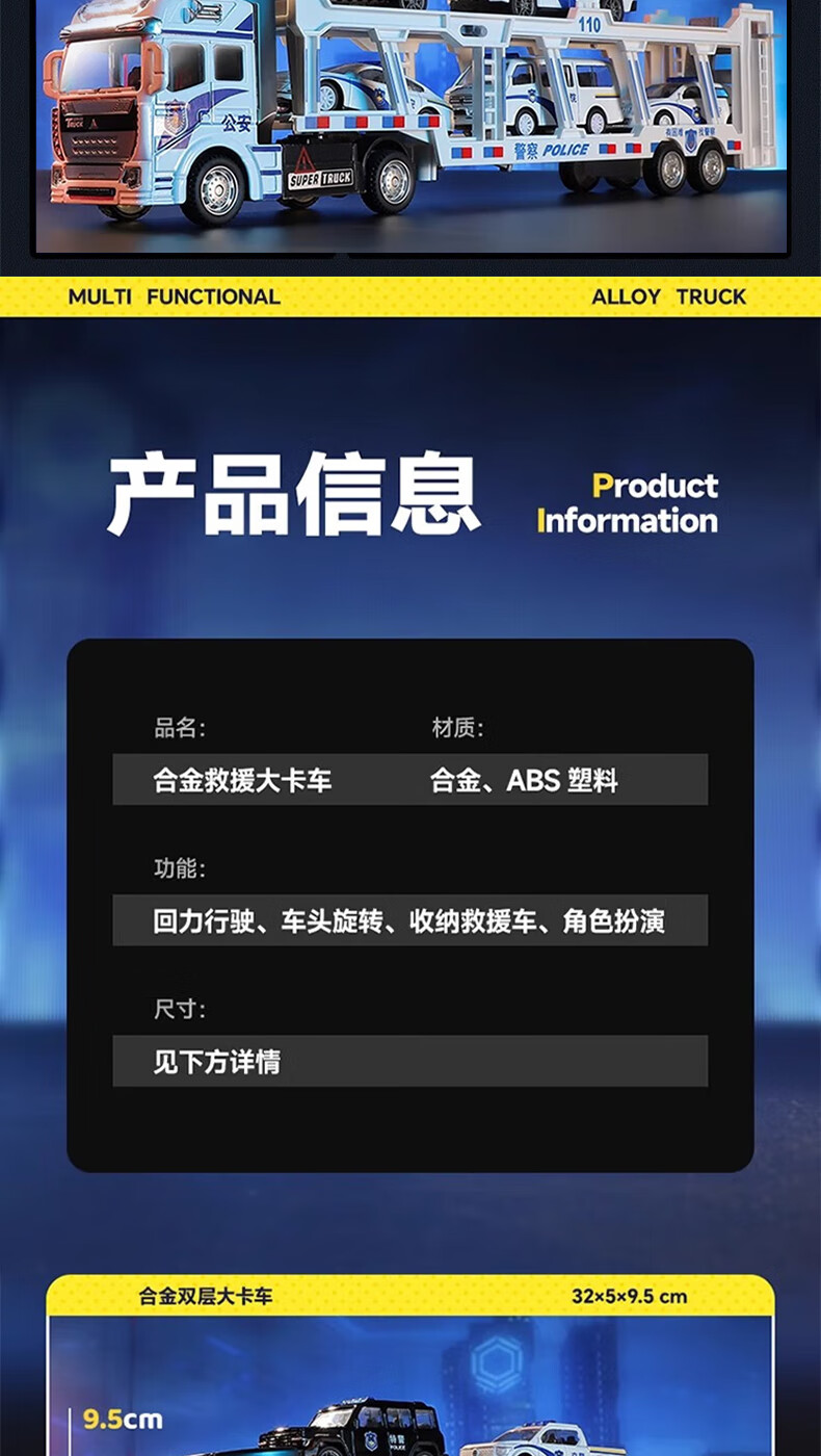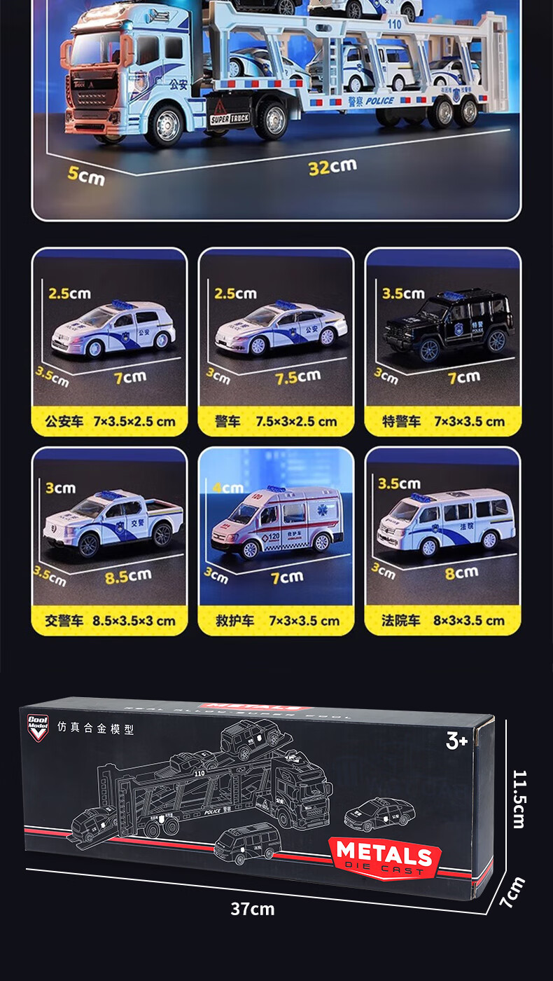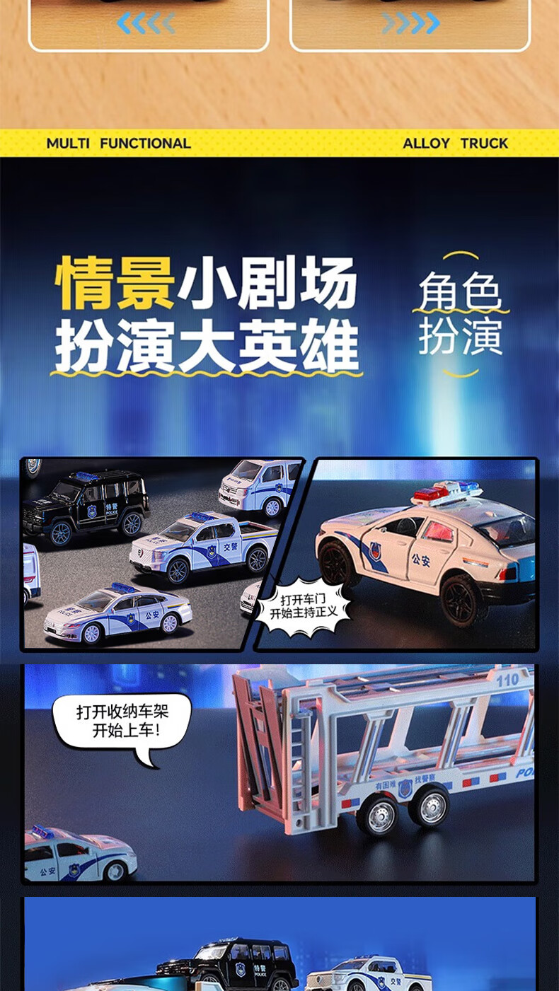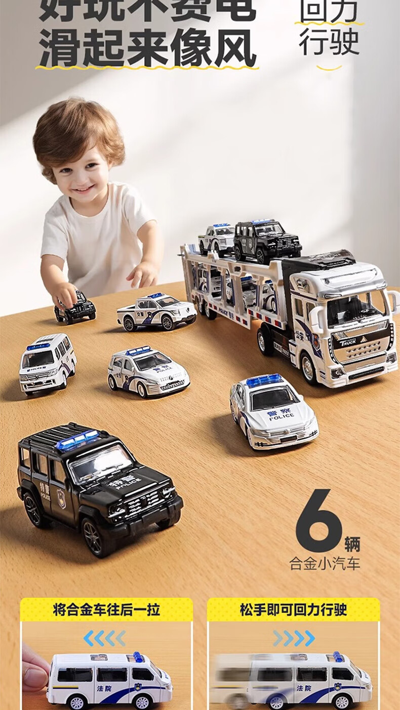 康迪拉家族儿童玩具男孩3-6岁双层加长合金警车运输汽车模型生日新年礼物