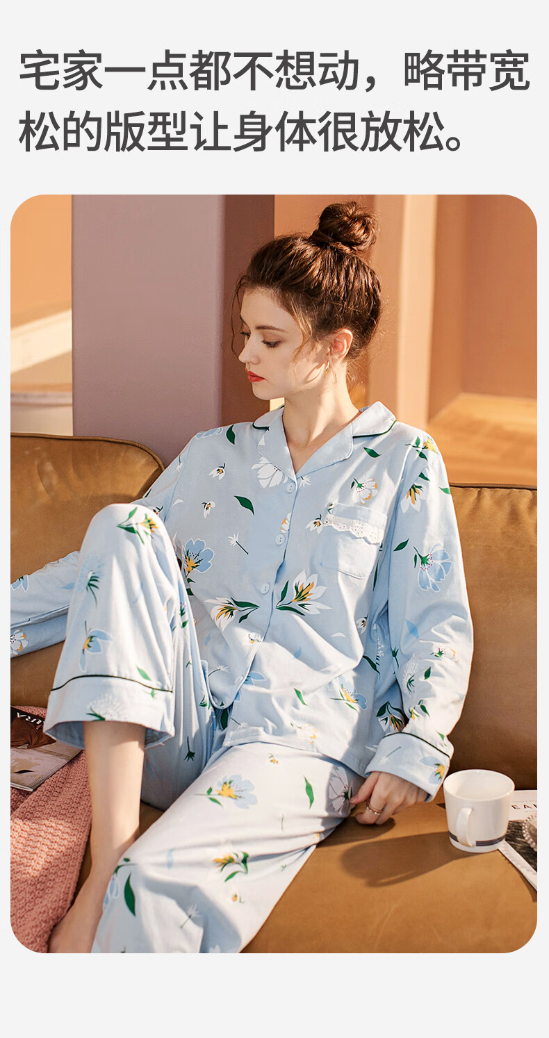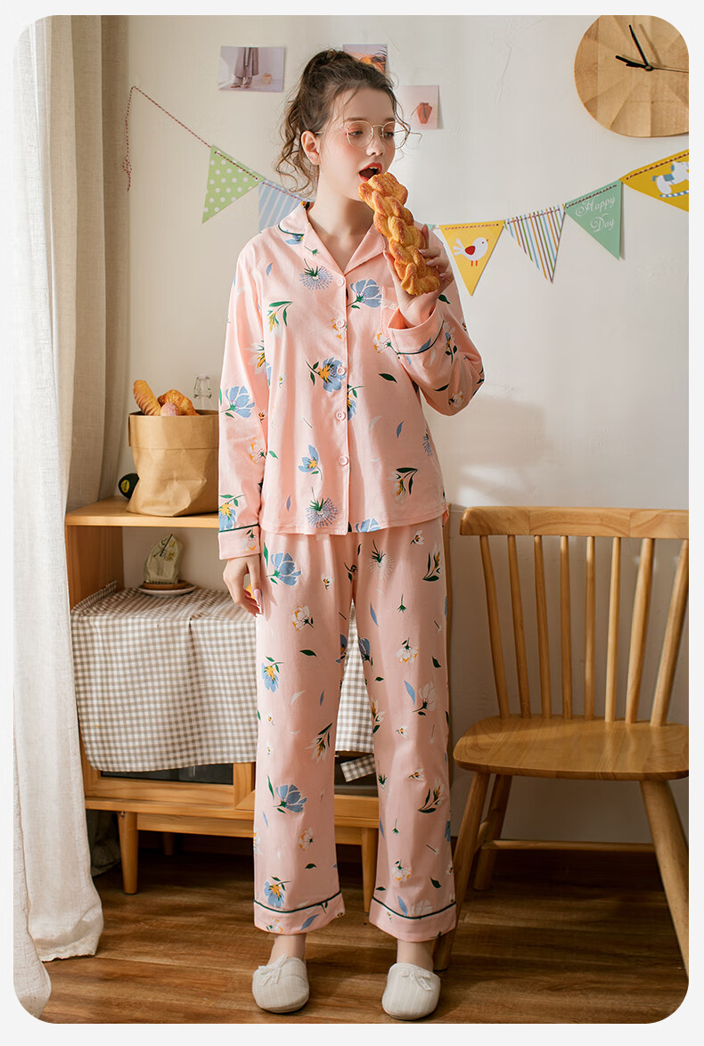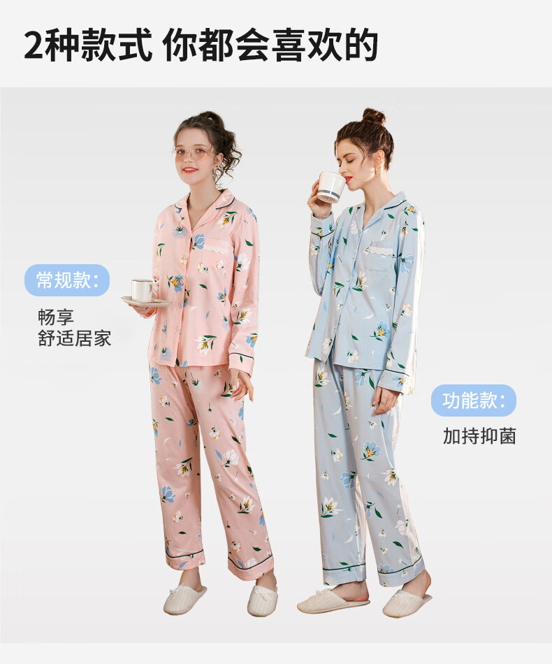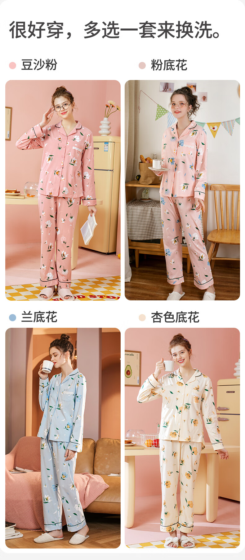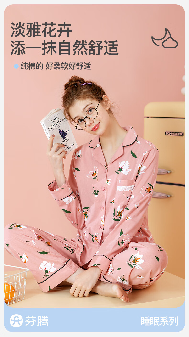 芬腾睡衣女5A抑菌纯棉春秋翻领开衫纯棉长袖睡衣女士家居服软棉棉