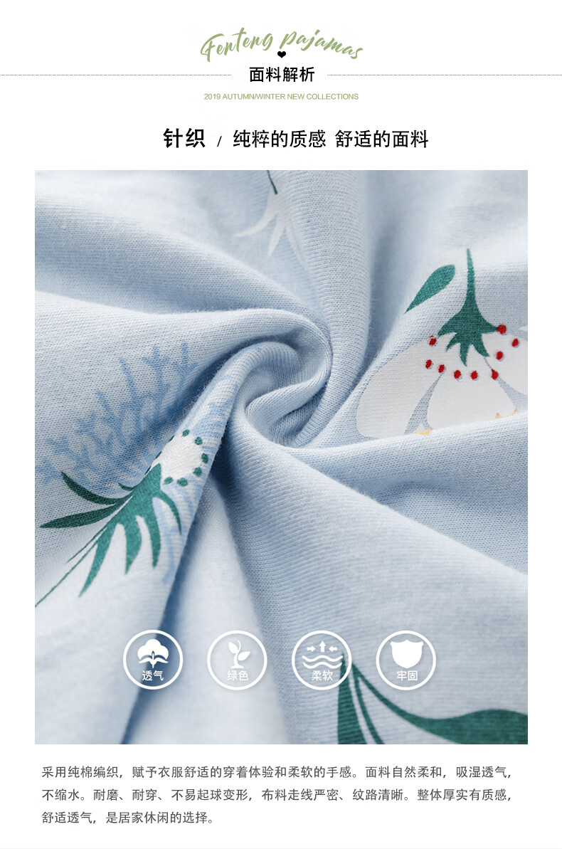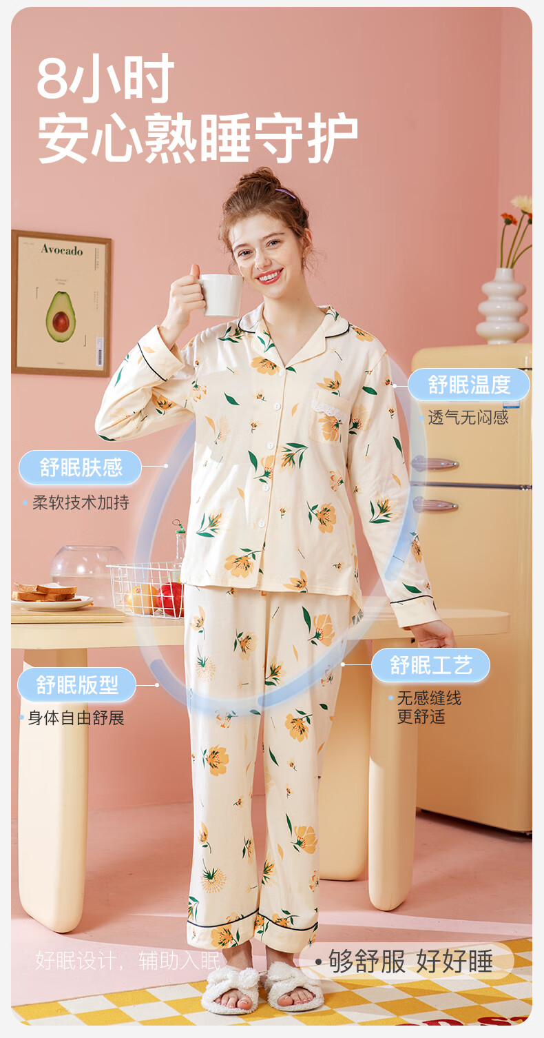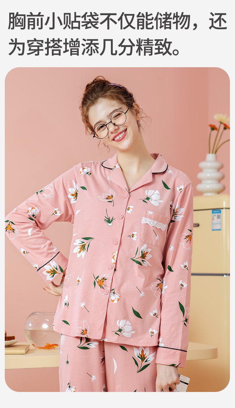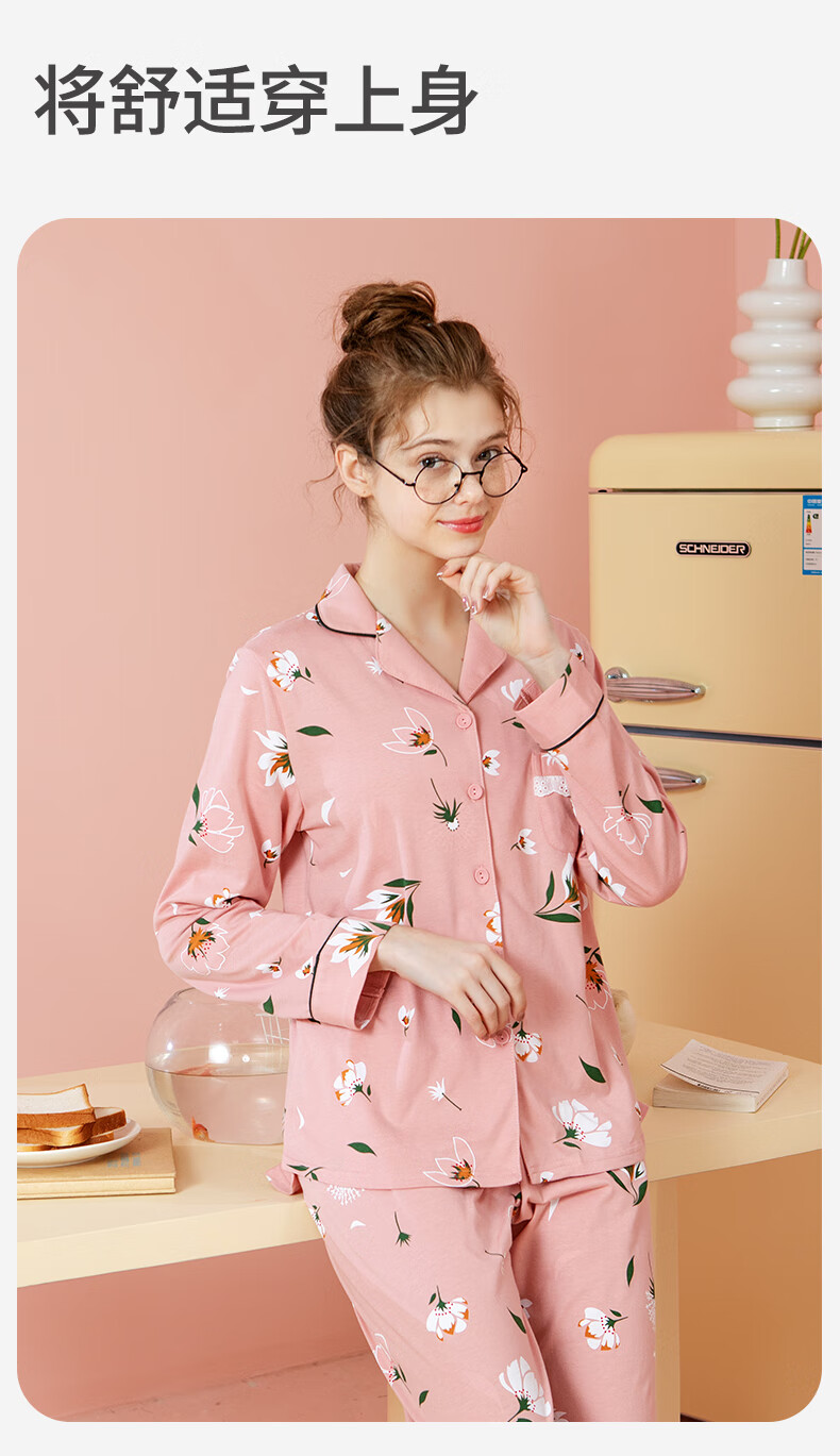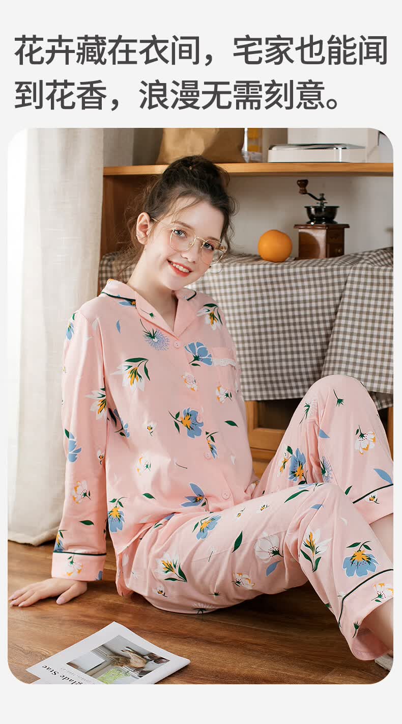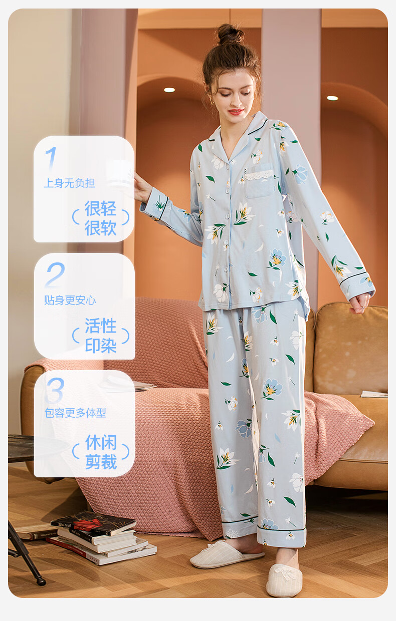 芬腾睡衣女5A抑菌纯棉春秋翻领开衫纯棉长袖睡衣女士家居服软棉棉