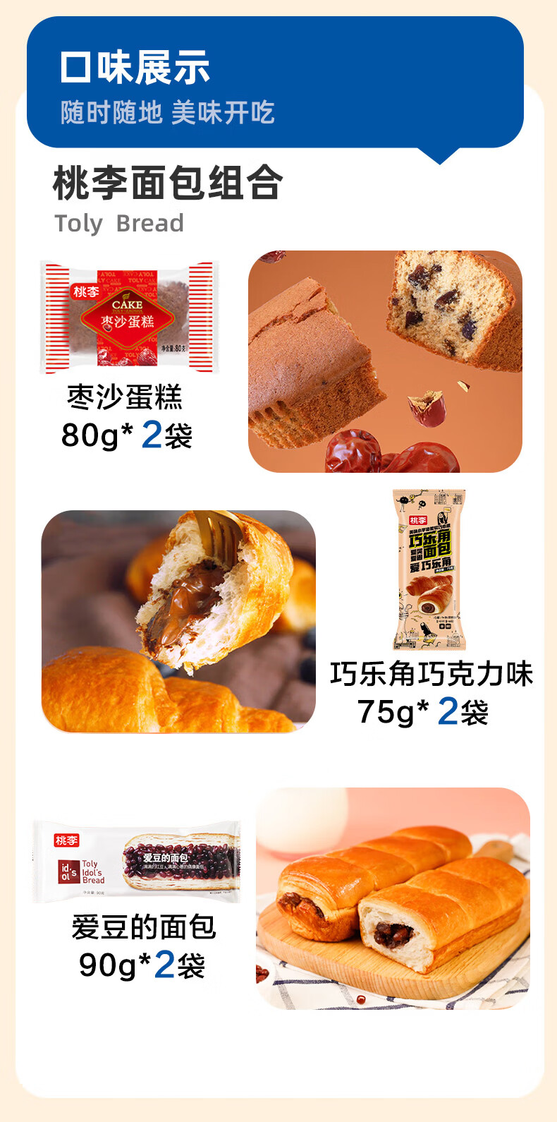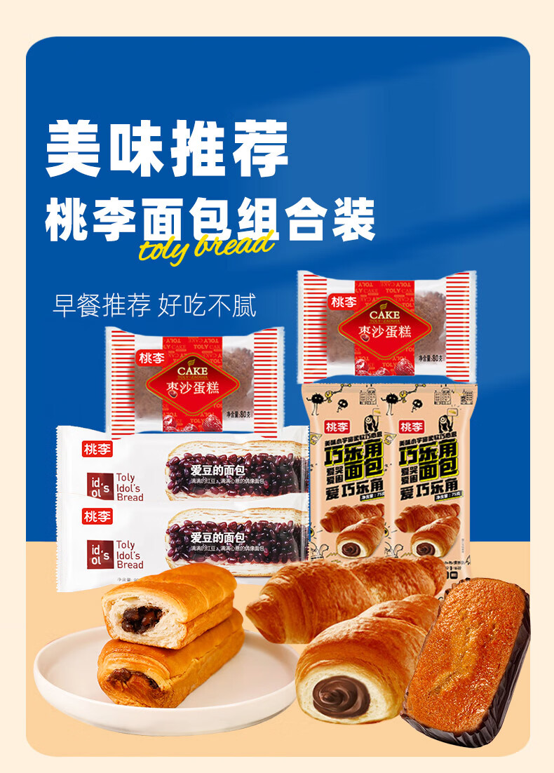 桃李营养早餐代餐点心巧乐角爱豆的面包枣沙蛋糕共490g早餐休闲点心 巧乐角巧克力味+枣沙2袋+爱豆的面包2袋