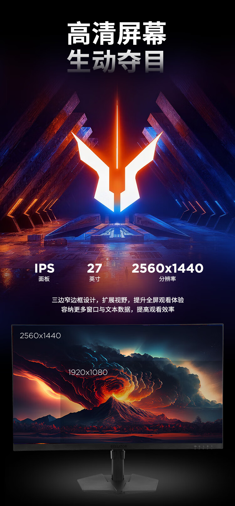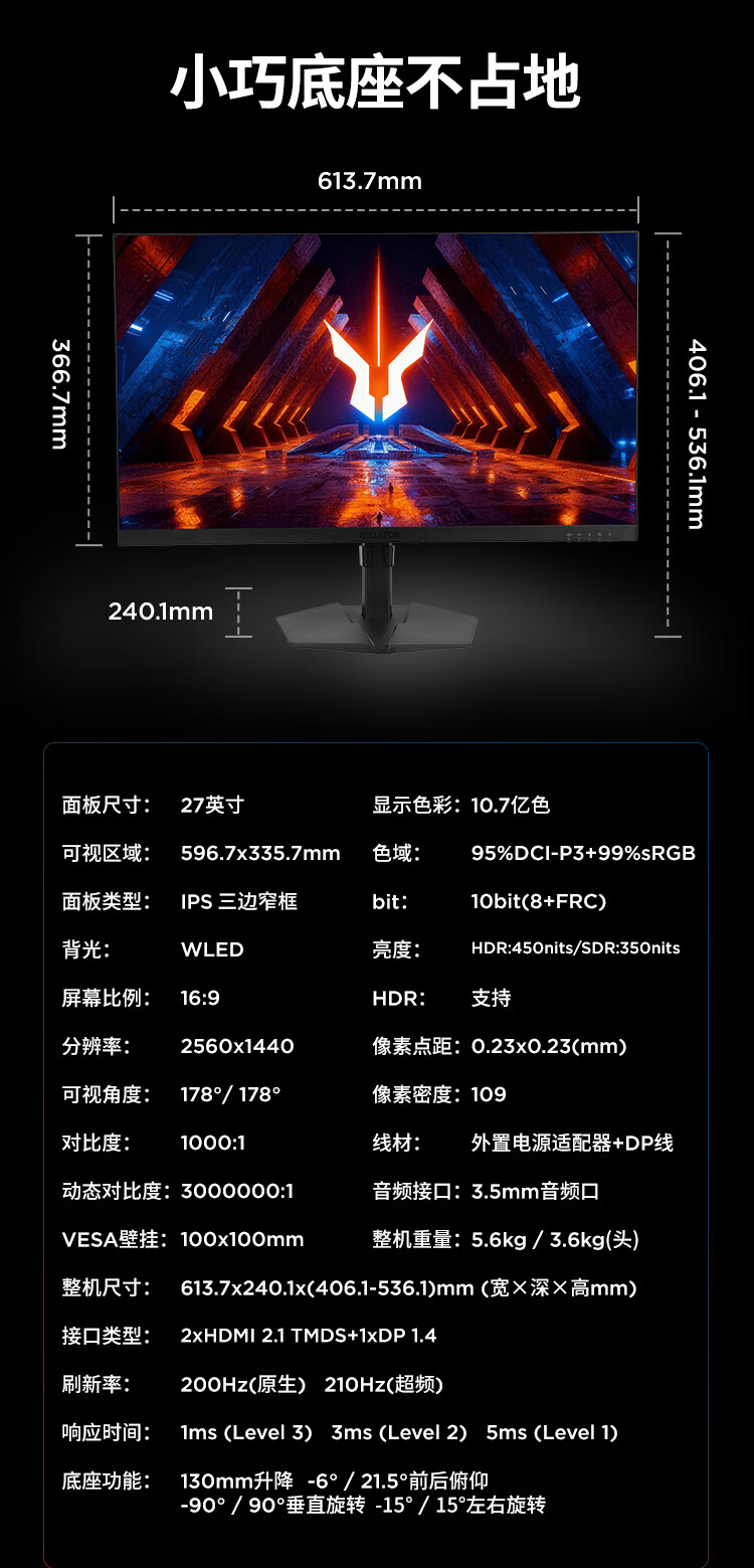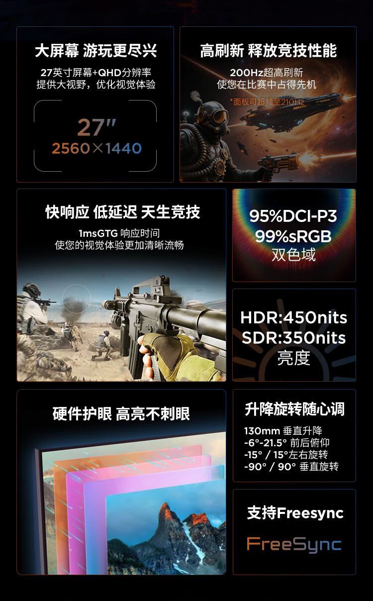 联想来酷斗战者27英寸2K QHD原生200Hz超频210Hz高刷1msGTG 旋转升降 暗区突围电竞游戏显示器 战27Q
