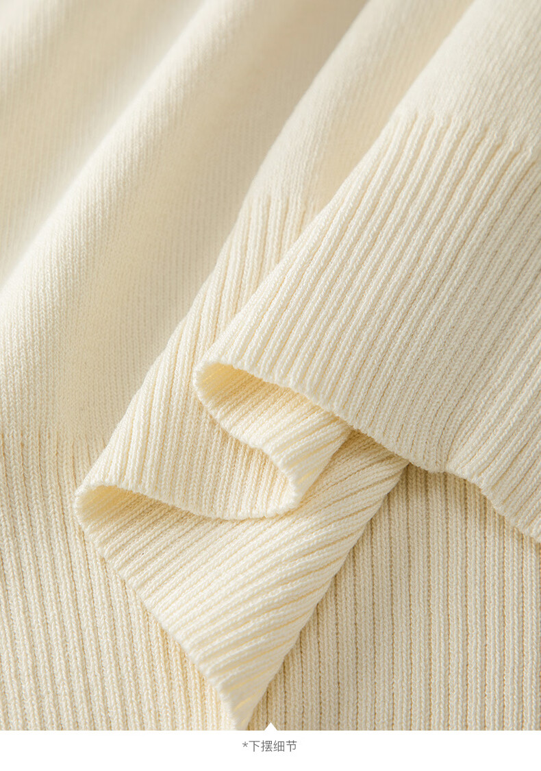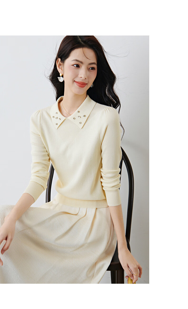 晚白2026年春款优雅甜美泡泡袖上衣重工钉珠翻领弹力温柔百搭针织衫女 米杏色 S