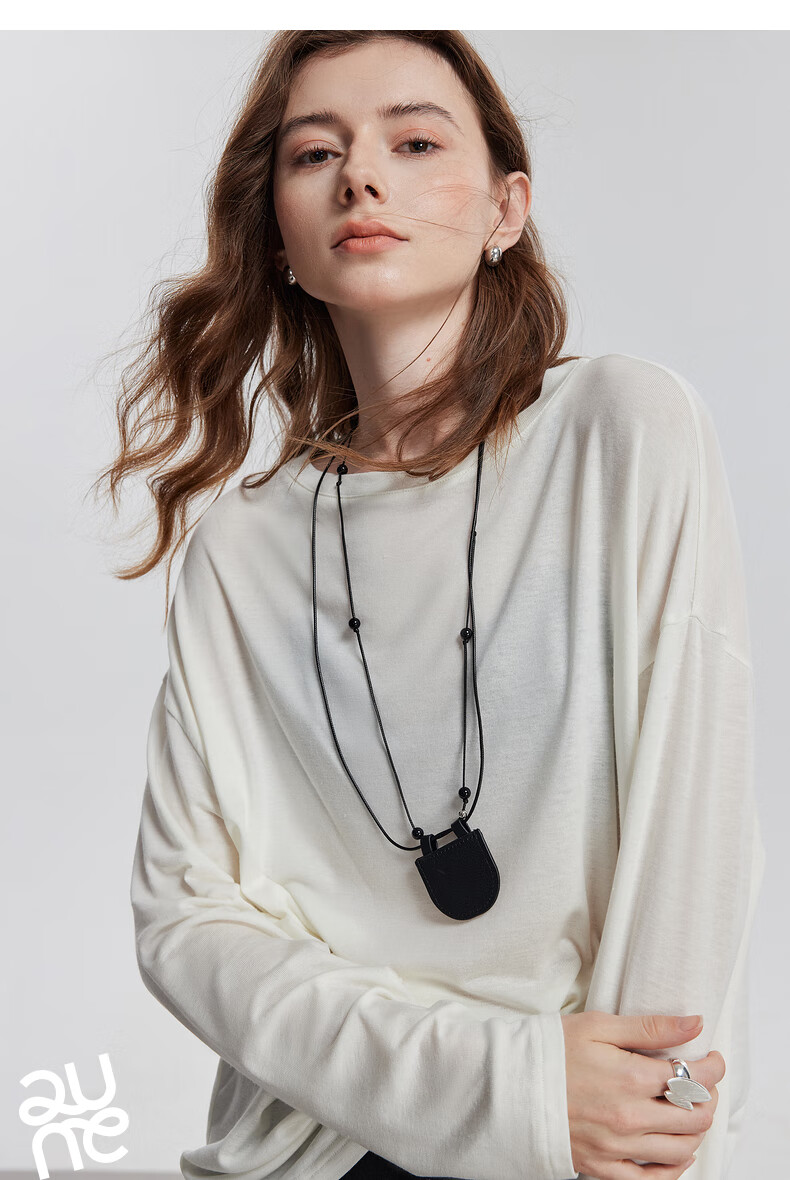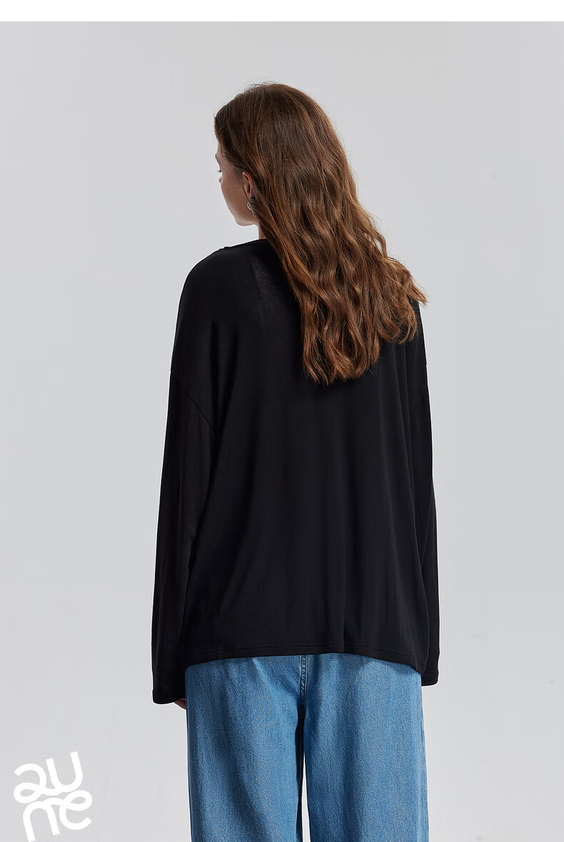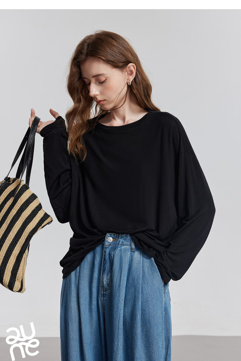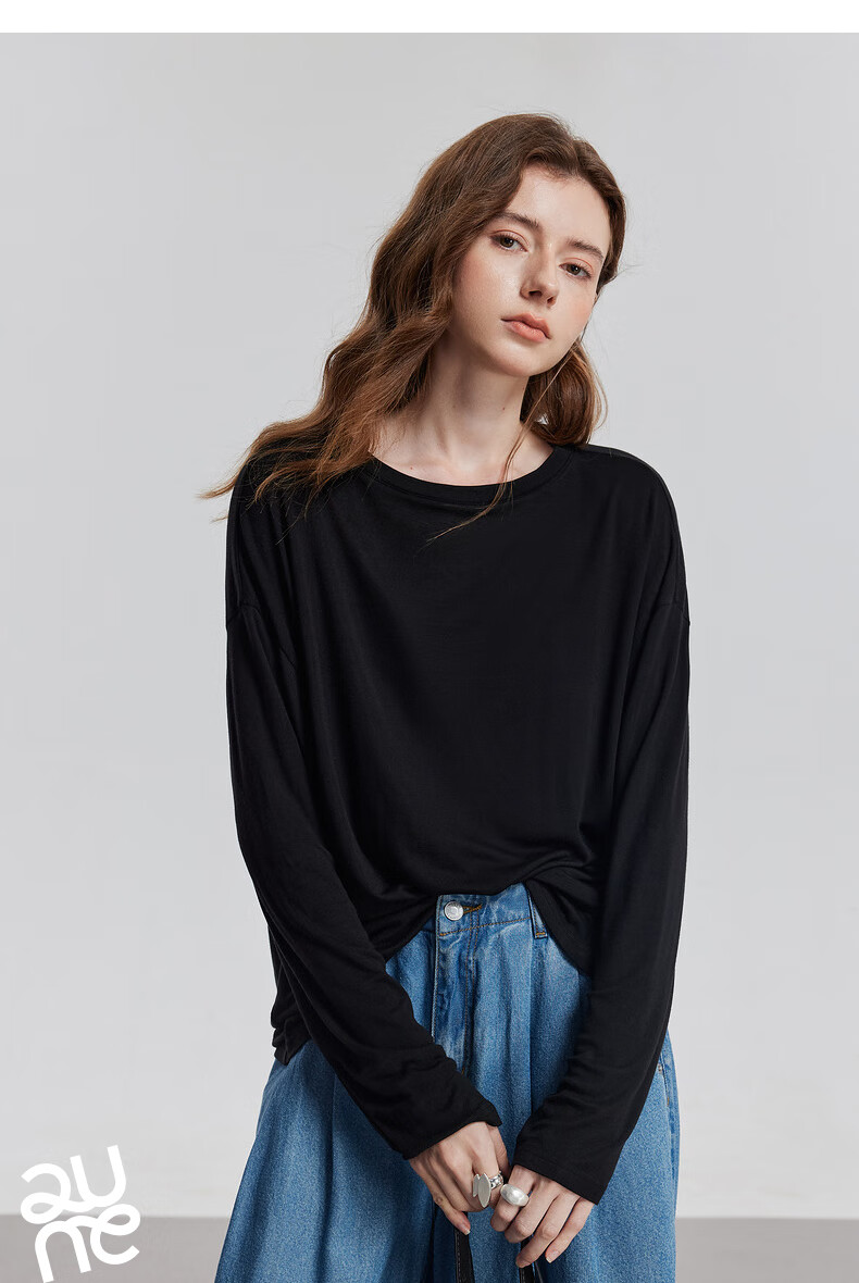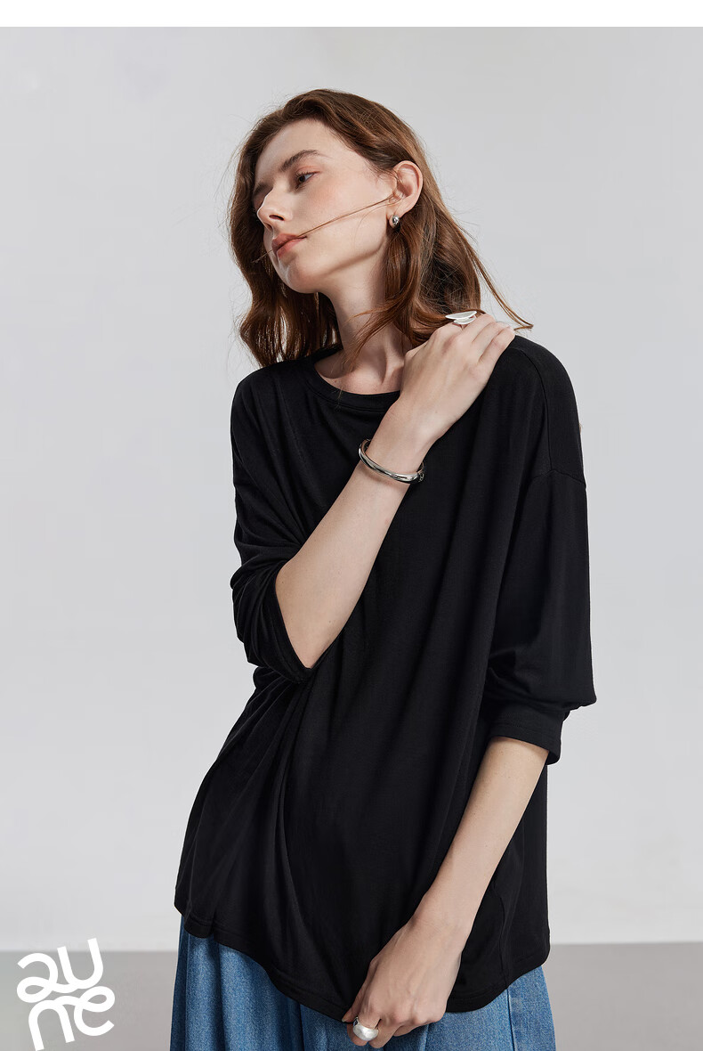 初语天丝羊毛面膜T恤女26春季新款基础百搭纯色套头肤感上衣 黑色 S