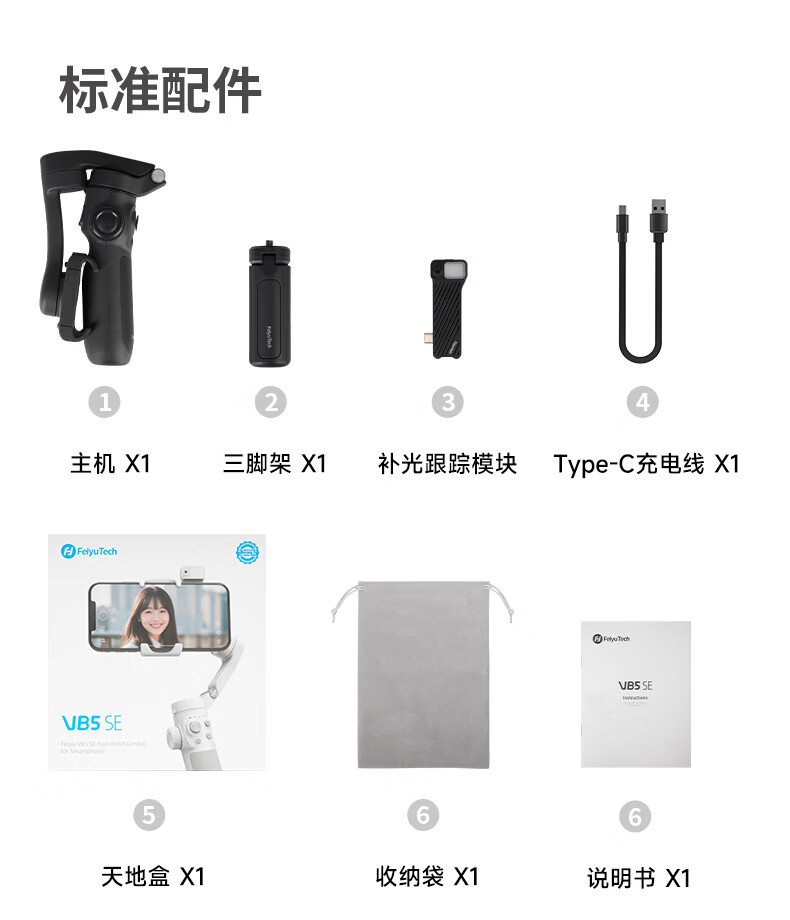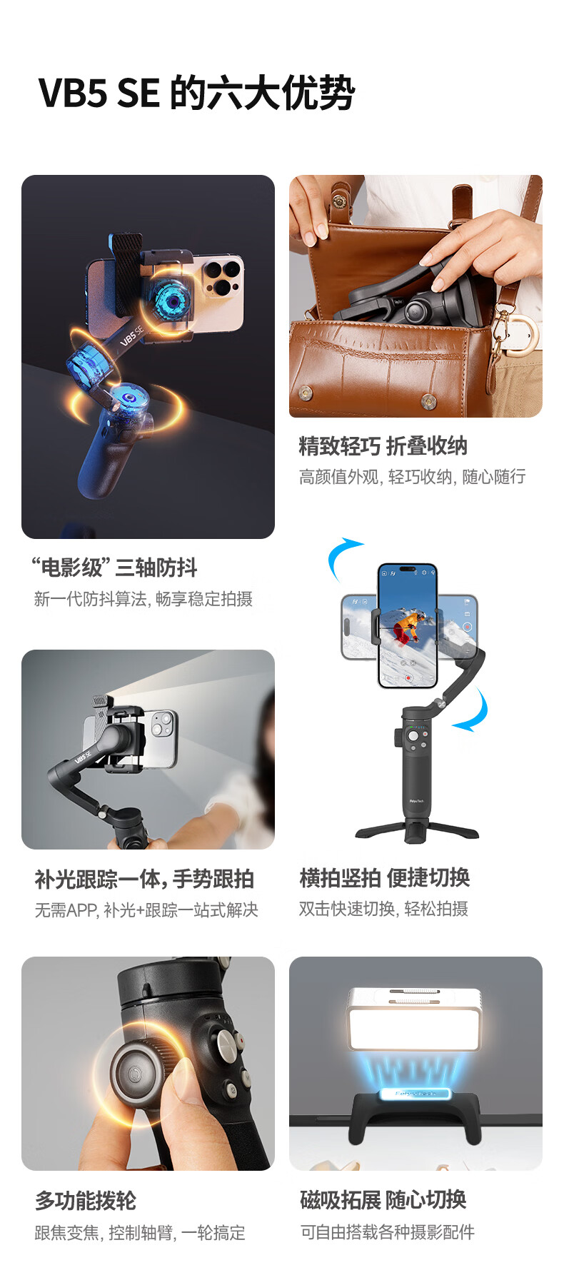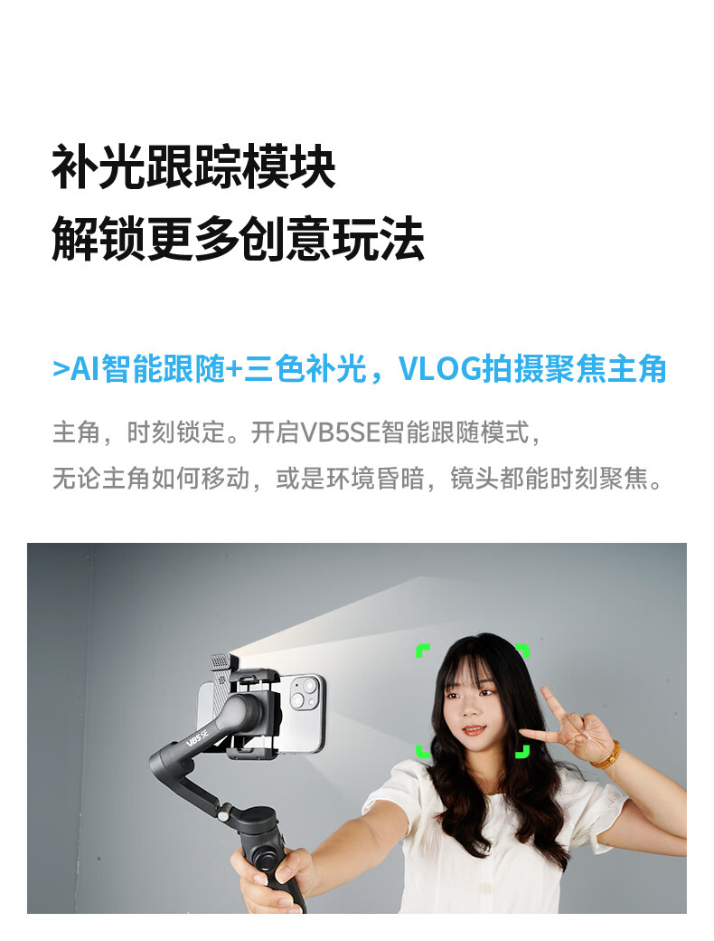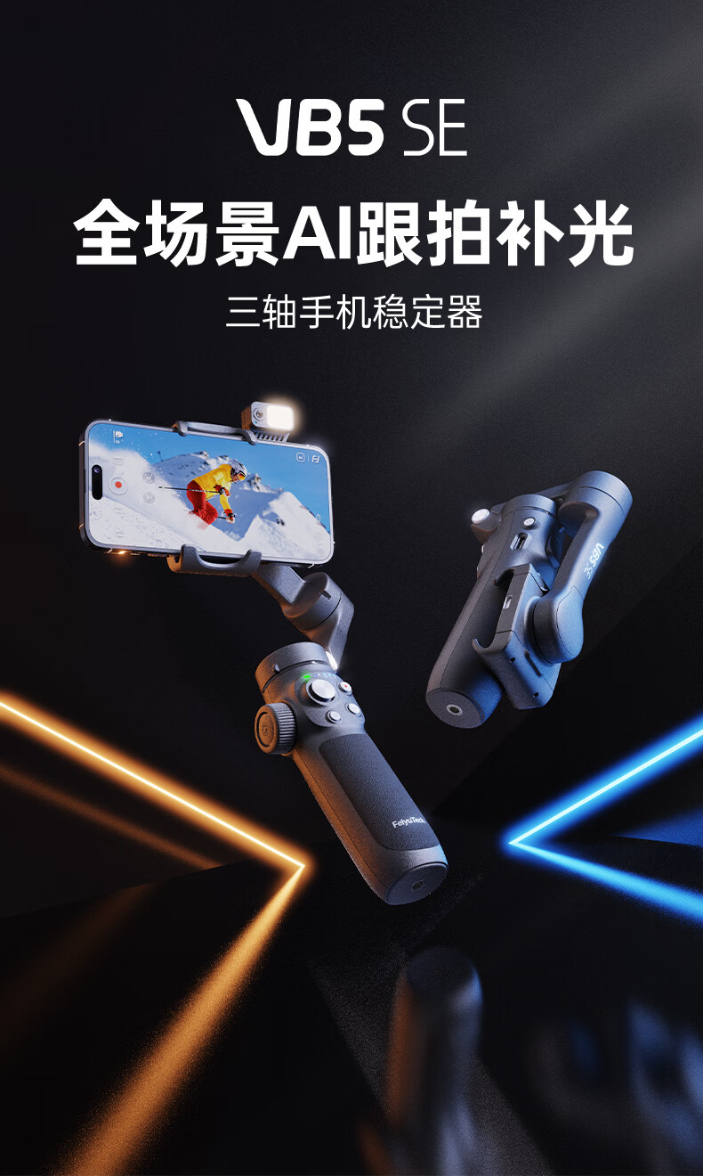FeiyuTech飞宇VB5SE手机稳定器 三轴防抖vlog摄影神器 手持云台支架 便携折叠收纳 AI智能跟拍补光 VB5SE标配 (AI跟拍补光)灰黑色
