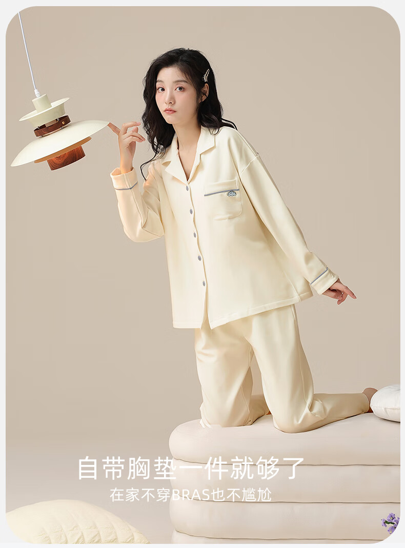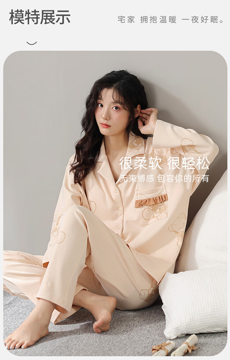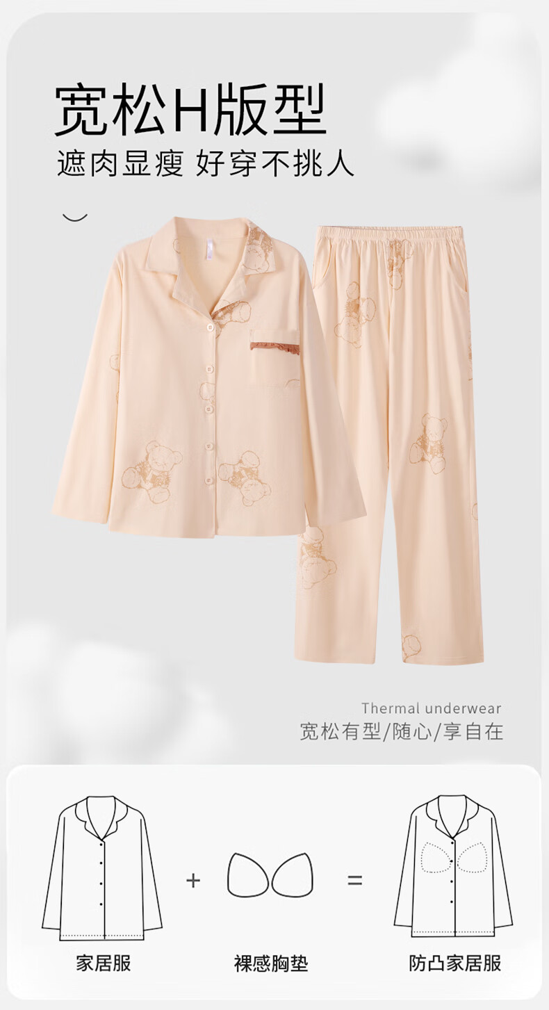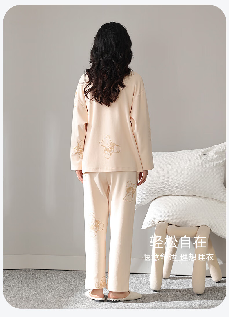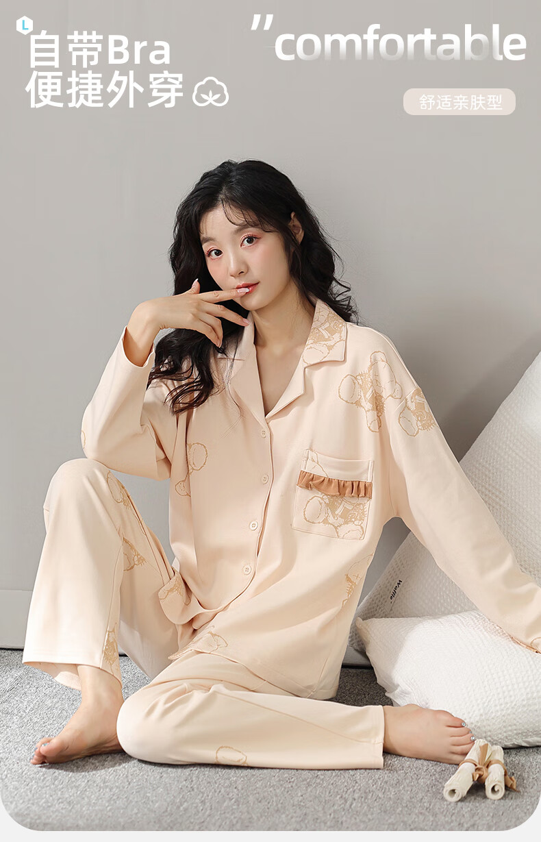 洁丽雅睡衣女士秋冬女纯棉长袖长裤套装高级感带胸垫可外穿家居服女 【100%棉】浓情可可(带胸垫) 412277 L (建议100-120斤)