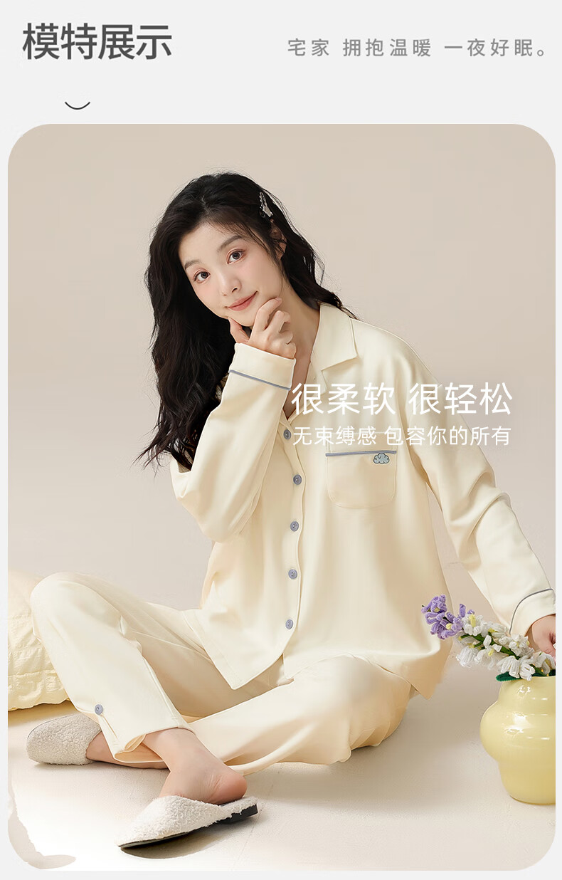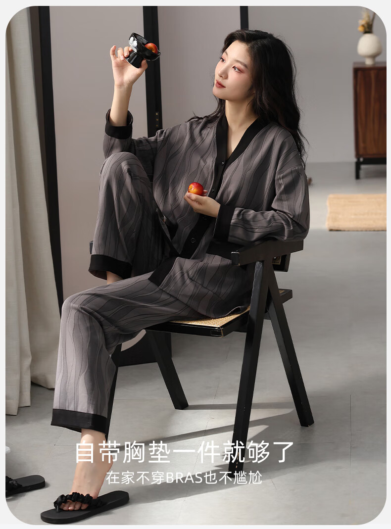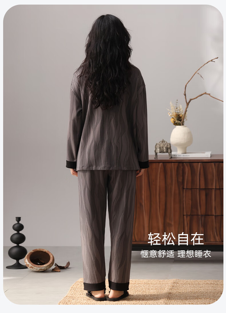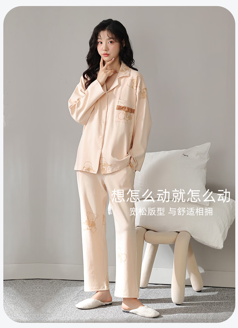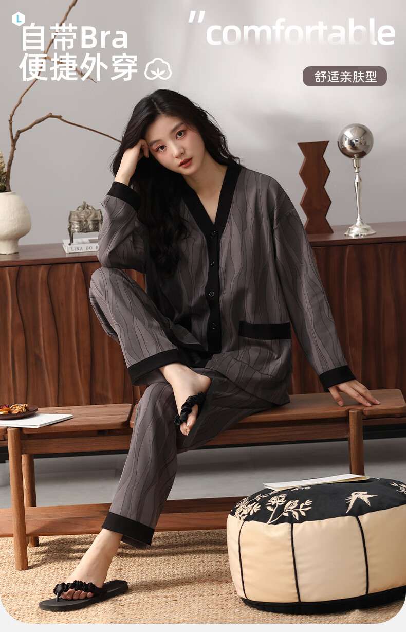 洁丽雅睡衣女士秋冬女纯棉长袖长裤套装高级感带胸垫可外穿家居服女 【100%棉】浓情可可(带胸垫) 412277 L (建议100-120斤)
