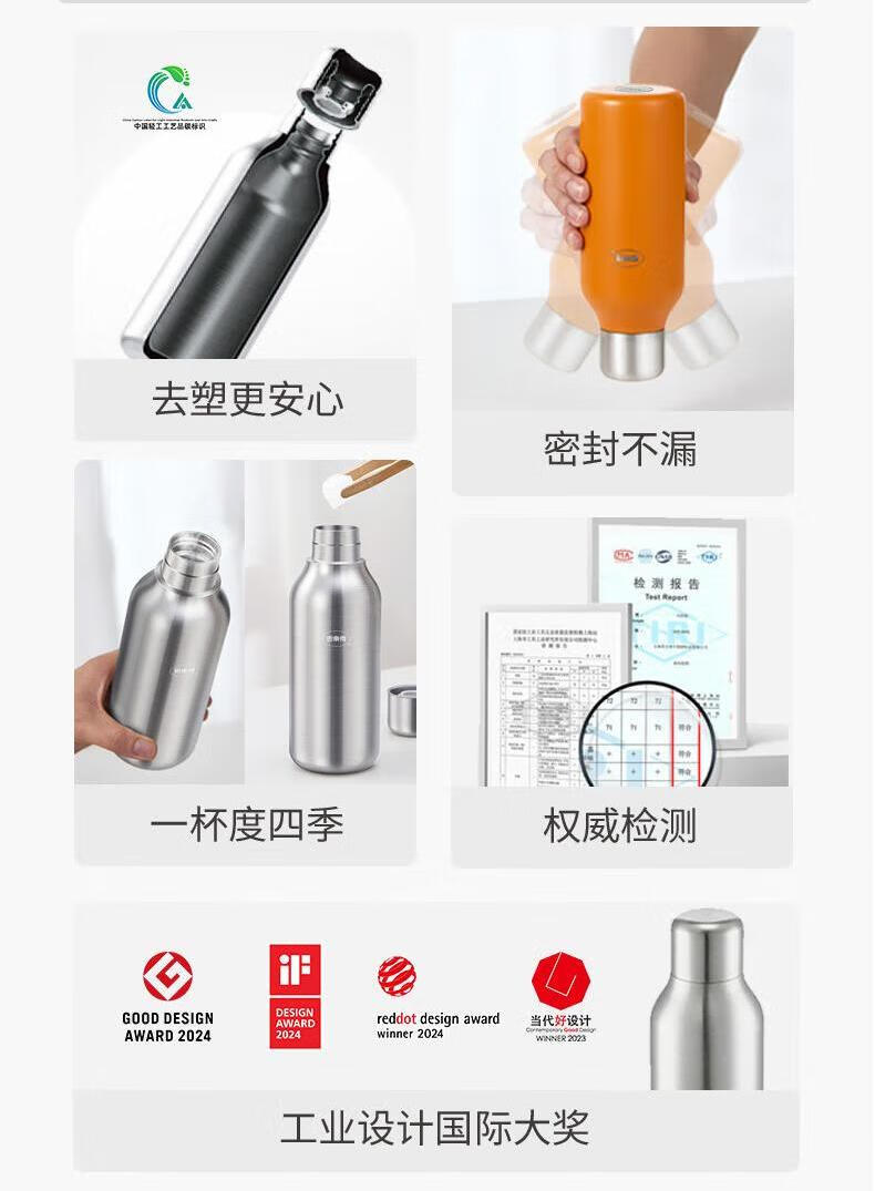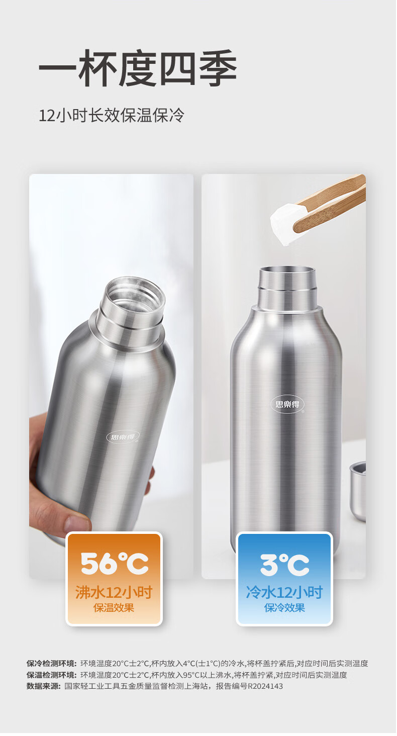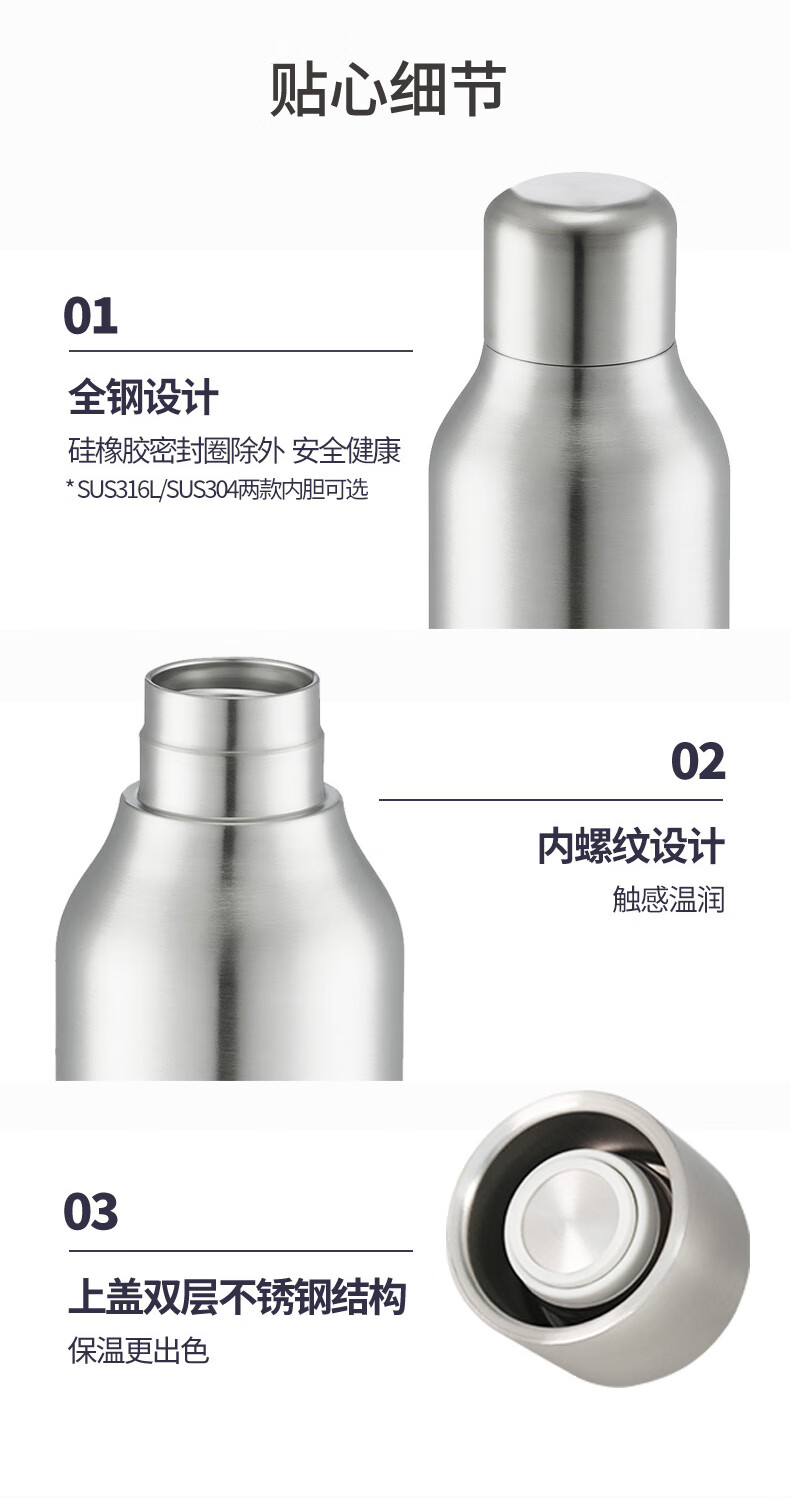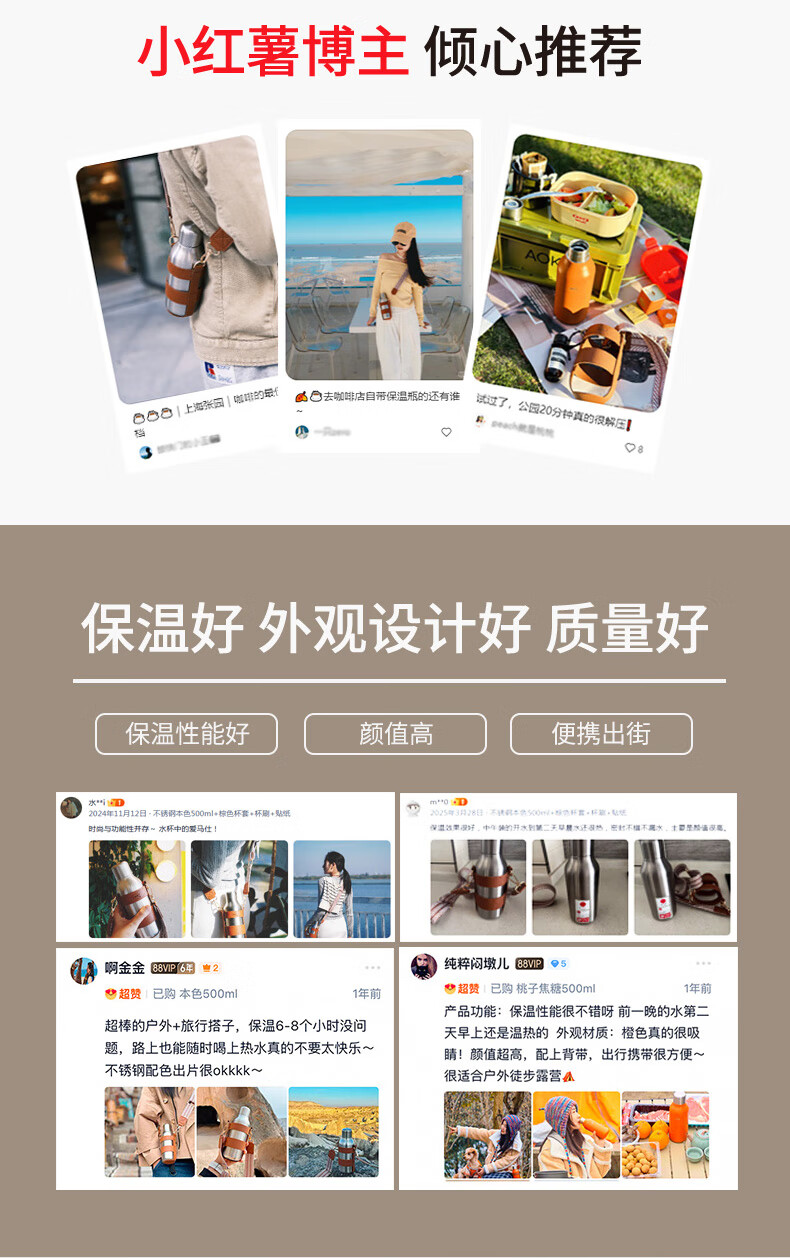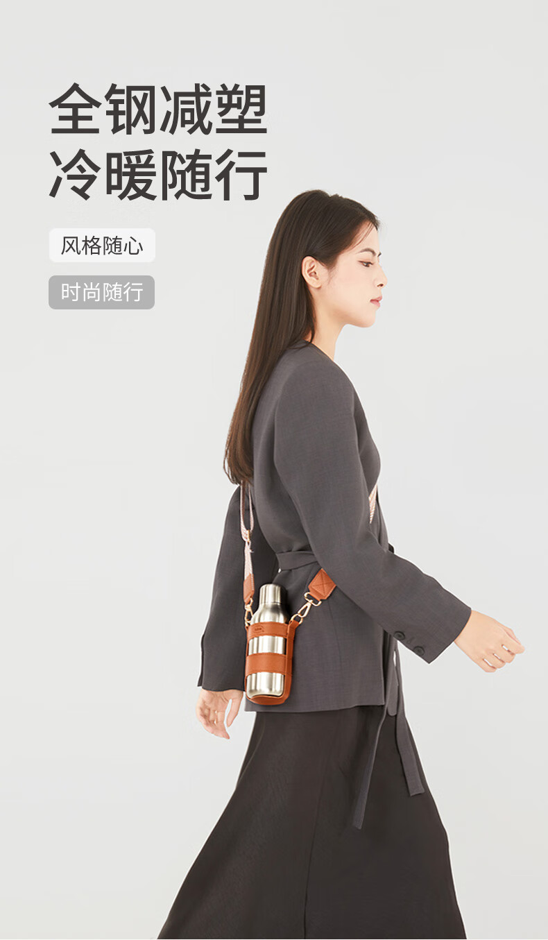 思乐得304不锈钢保温杯男士户外运动高颜值水瓶大容量女随手杯全钢瓶 304内胆 钢本色+棕色背带+茶漏+杯刷+贴纸500ml
