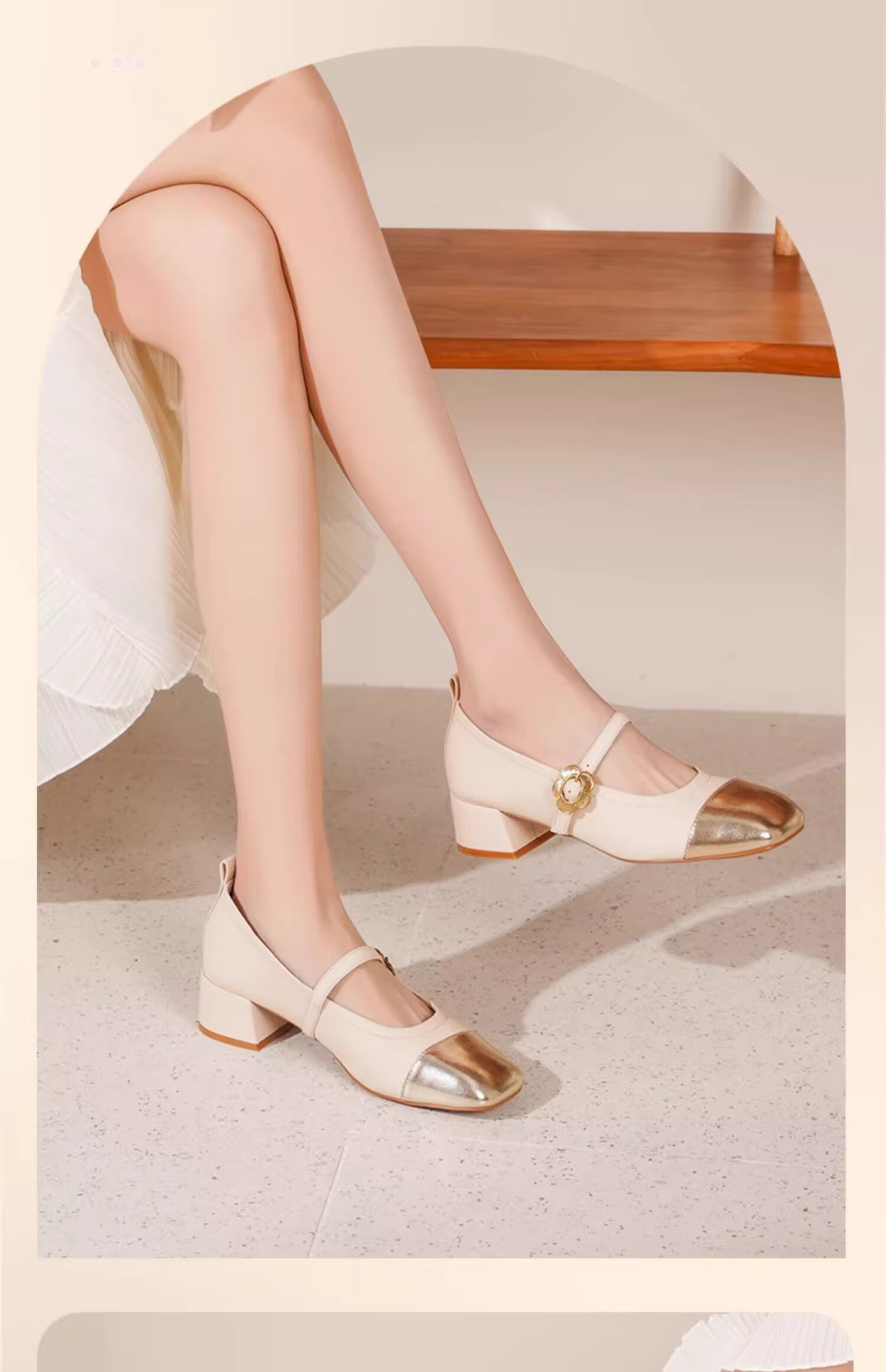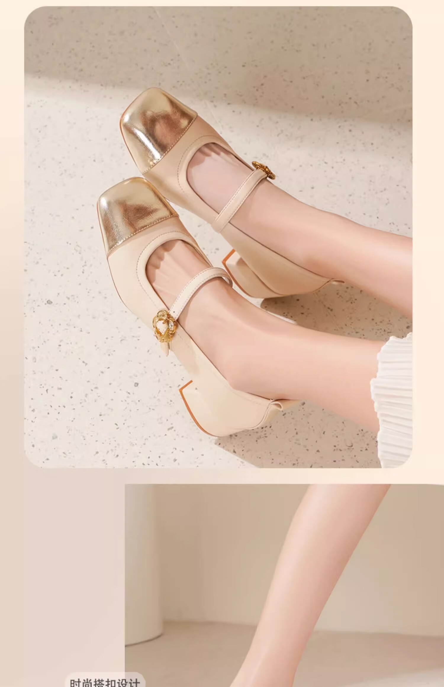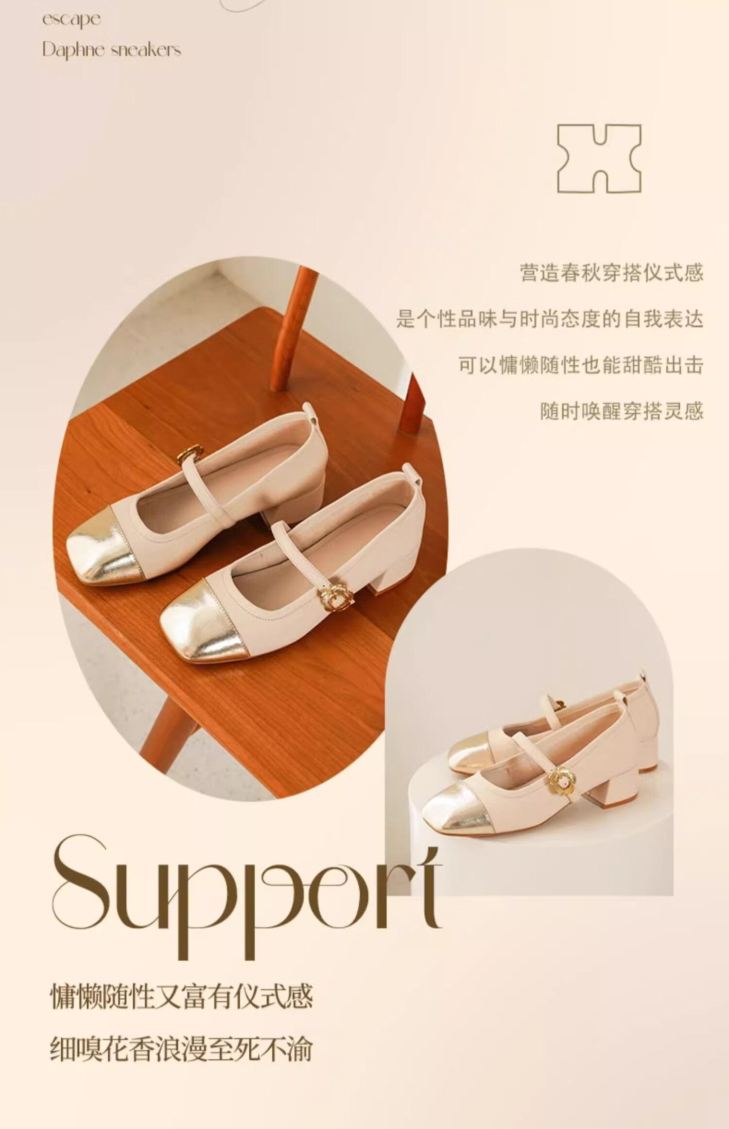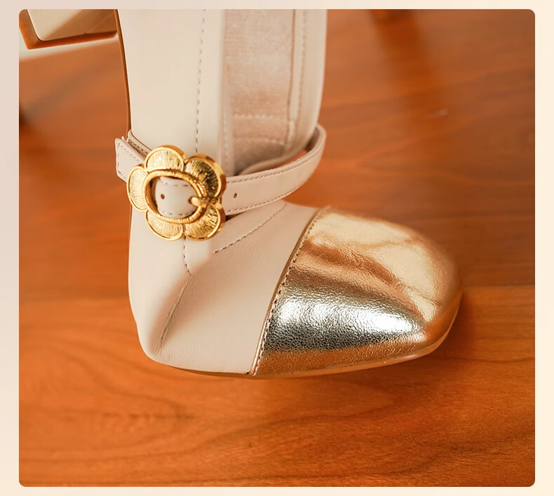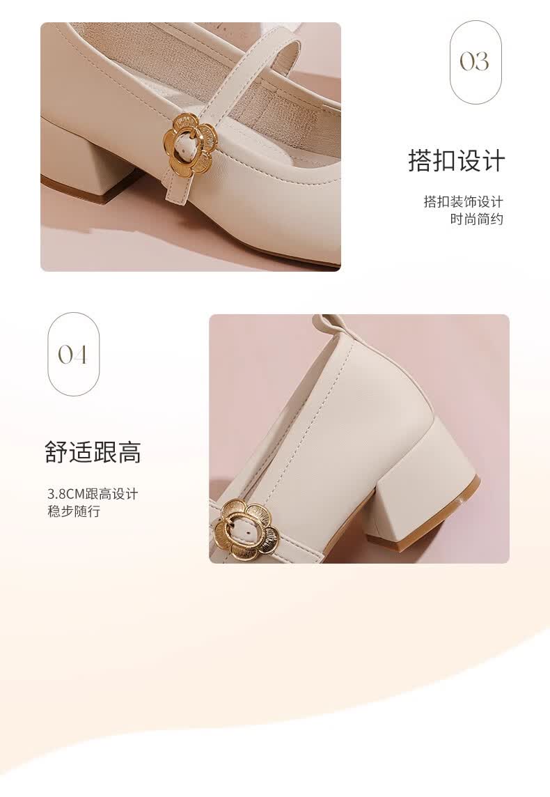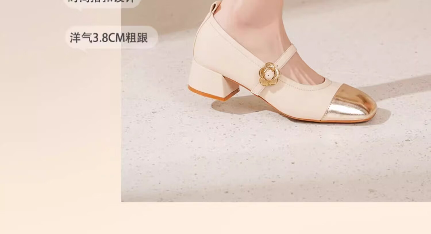 达芙妮玛丽珍女鞋2026春季新款气质花朵新中式拼色单鞋女粗跟高跟鞋JL 米金色【花朵搭扣】 跟高3.8cm 37